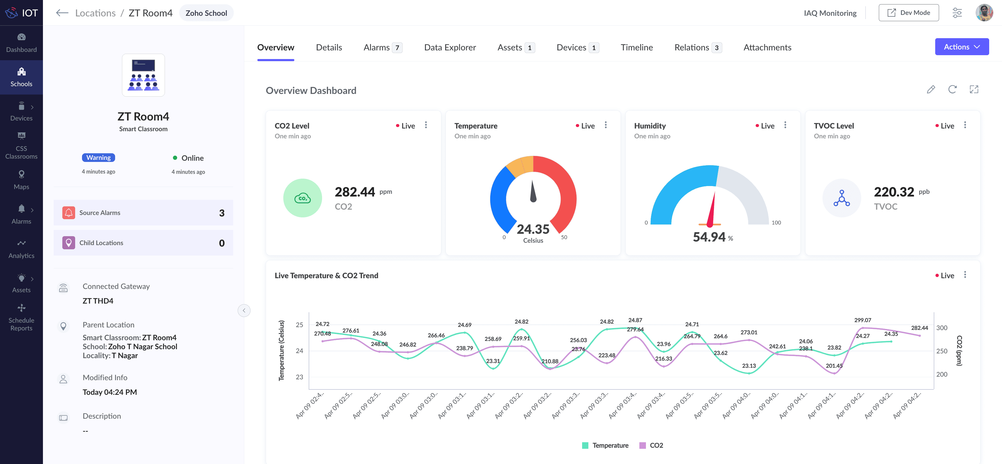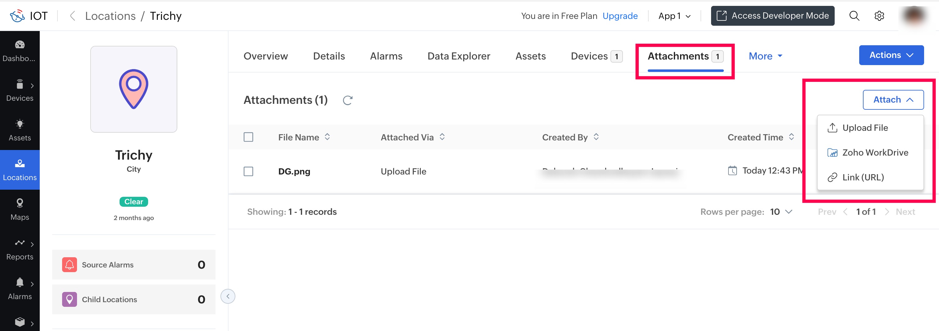 To view all information about the location,1. Click on the name of the location.2. All details are displayed on the location's information page with multiple tabs. The Location overview tab is displayed by default, and you can traverse to Details, Alarms, Data Explorer, Alarms, Devices, Timeline, Relations, and Attachments tabs for viewing the respective details.Attach Files