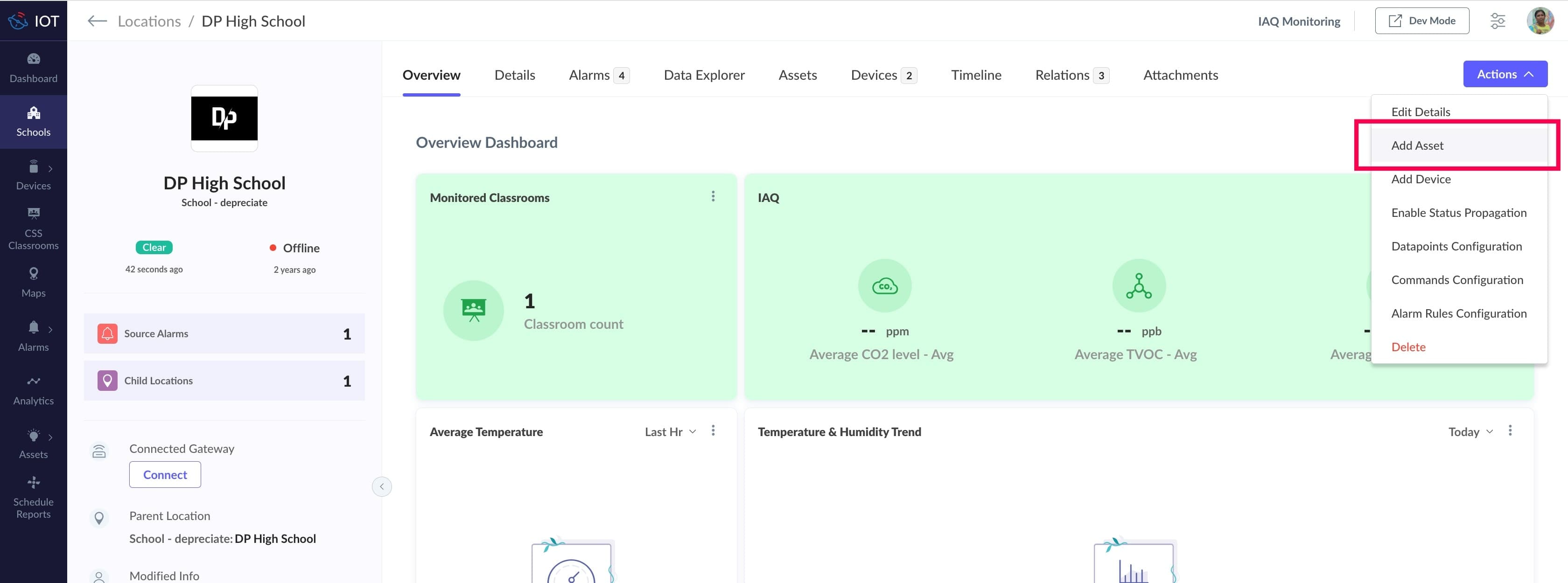 In the Hierarchy view, click Actions > Add Asset next to the location.In the List View, click Actions > Add Asset in the top right corner of the screen.
