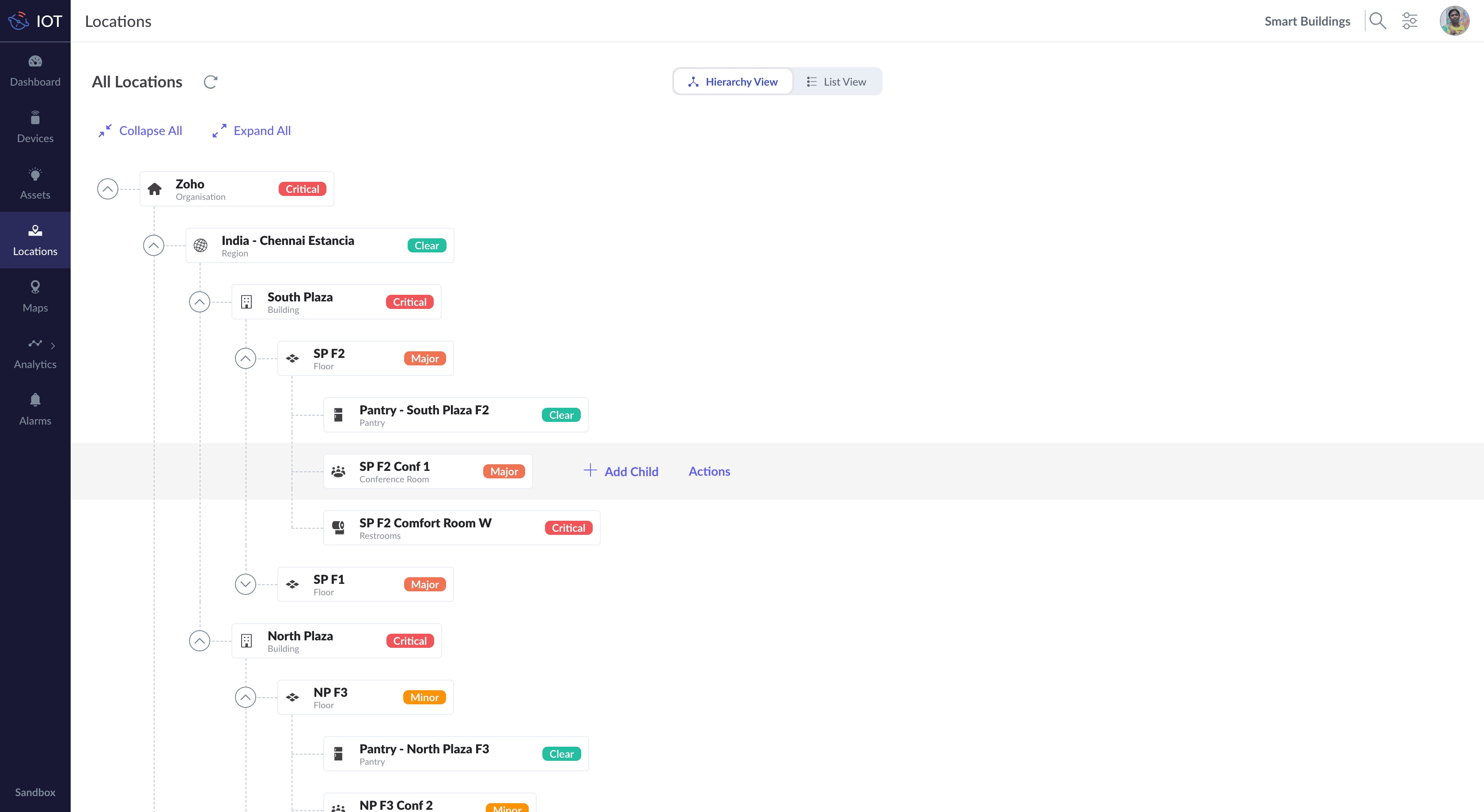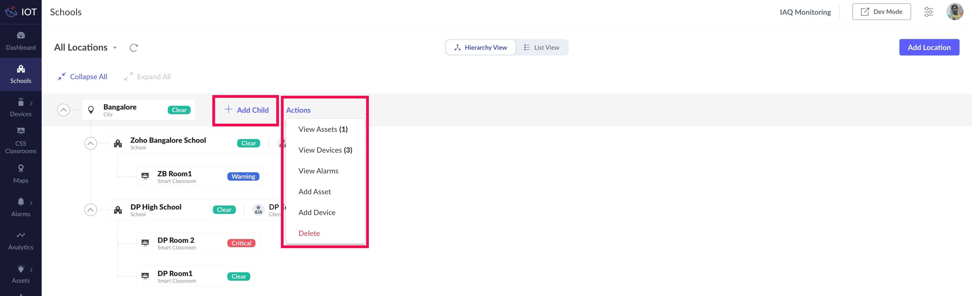 To create a child node under a parent node,1. Hover over the parent location node under which you want to create a child node.2. Click the Add Child link. Follow the step provided in the Add Location section of the document.View Associated Assets, Devices, and Alarms