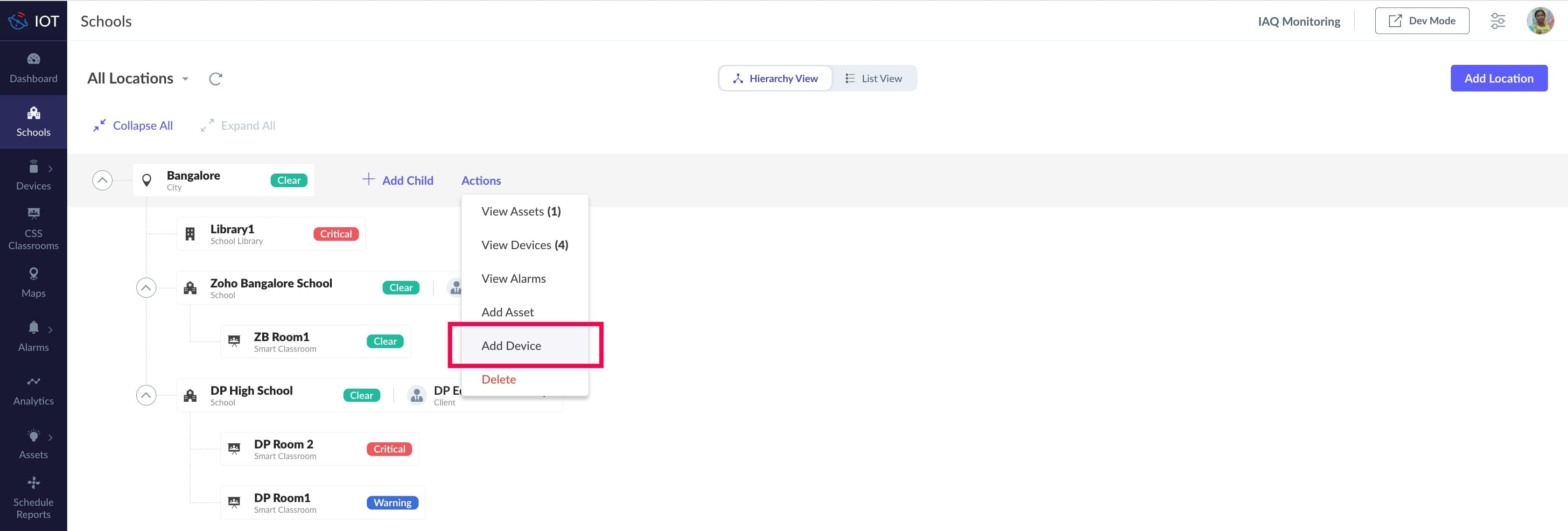 - In the Hierarchy view, click Actions > Add Device next to the location.