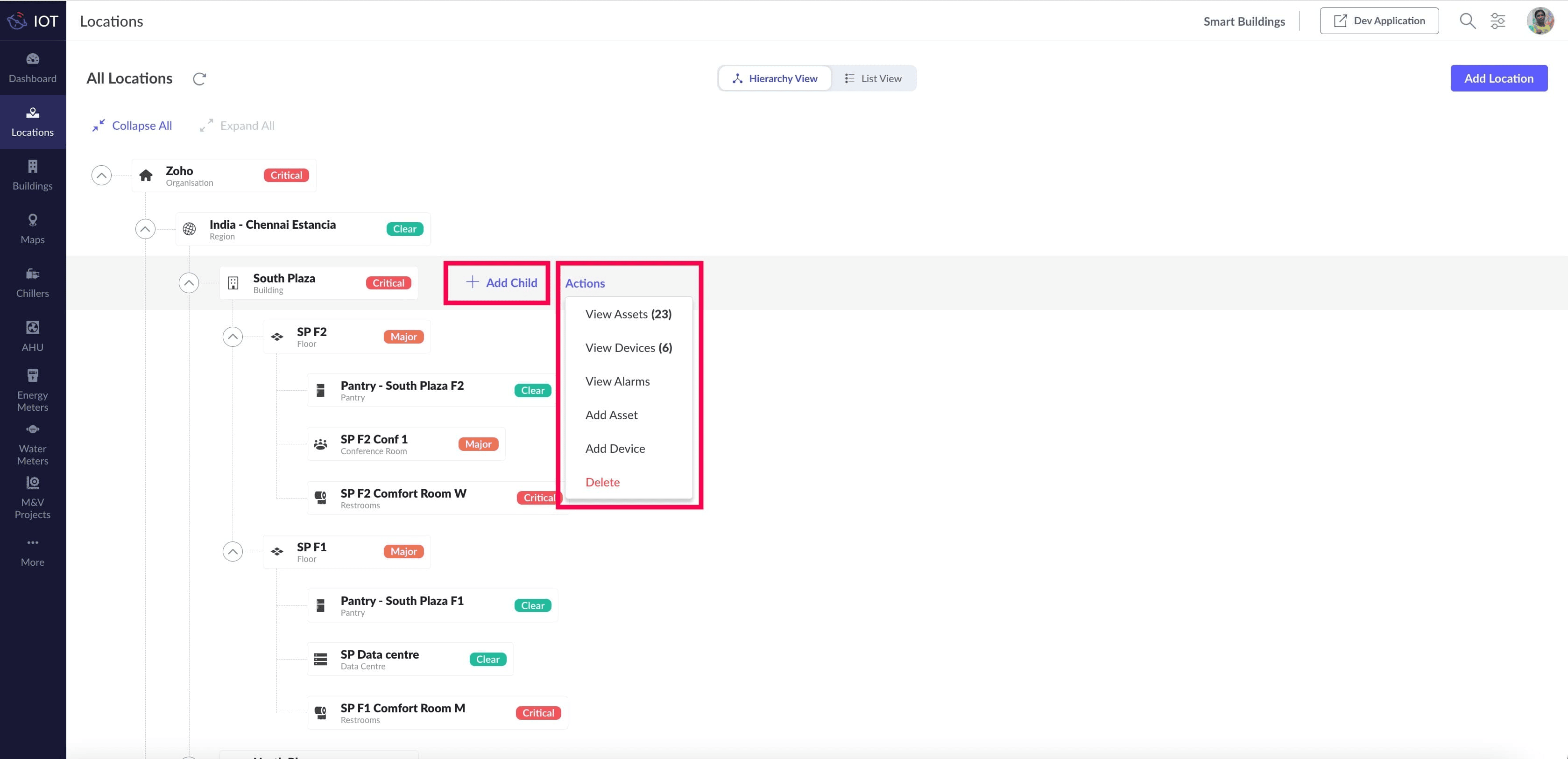 In addition to viewing devices, assets, and alarms associated with the location, you can also add child locations, add devices, and assets to the location from here. Delete location node can also be performed from the hierarchy.