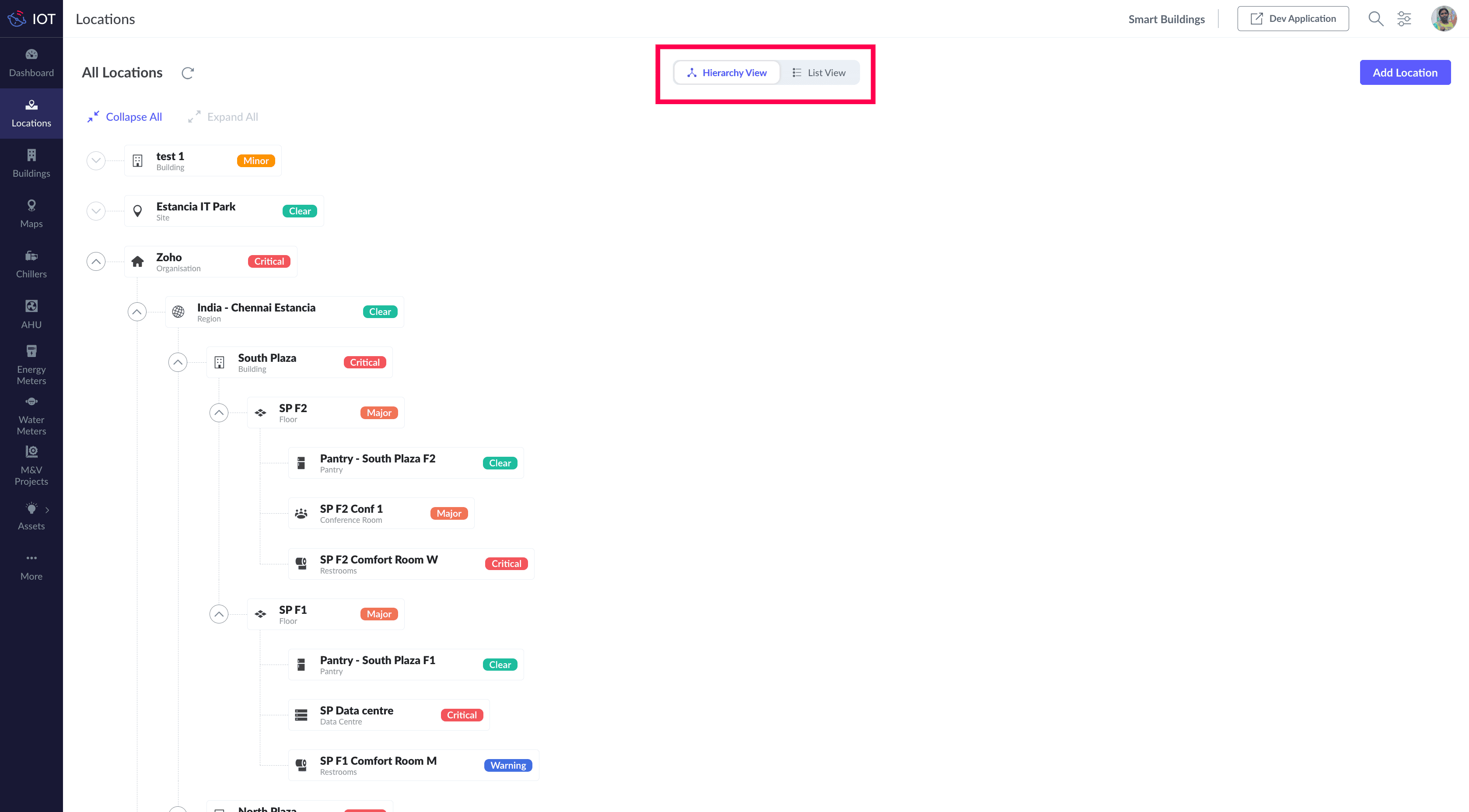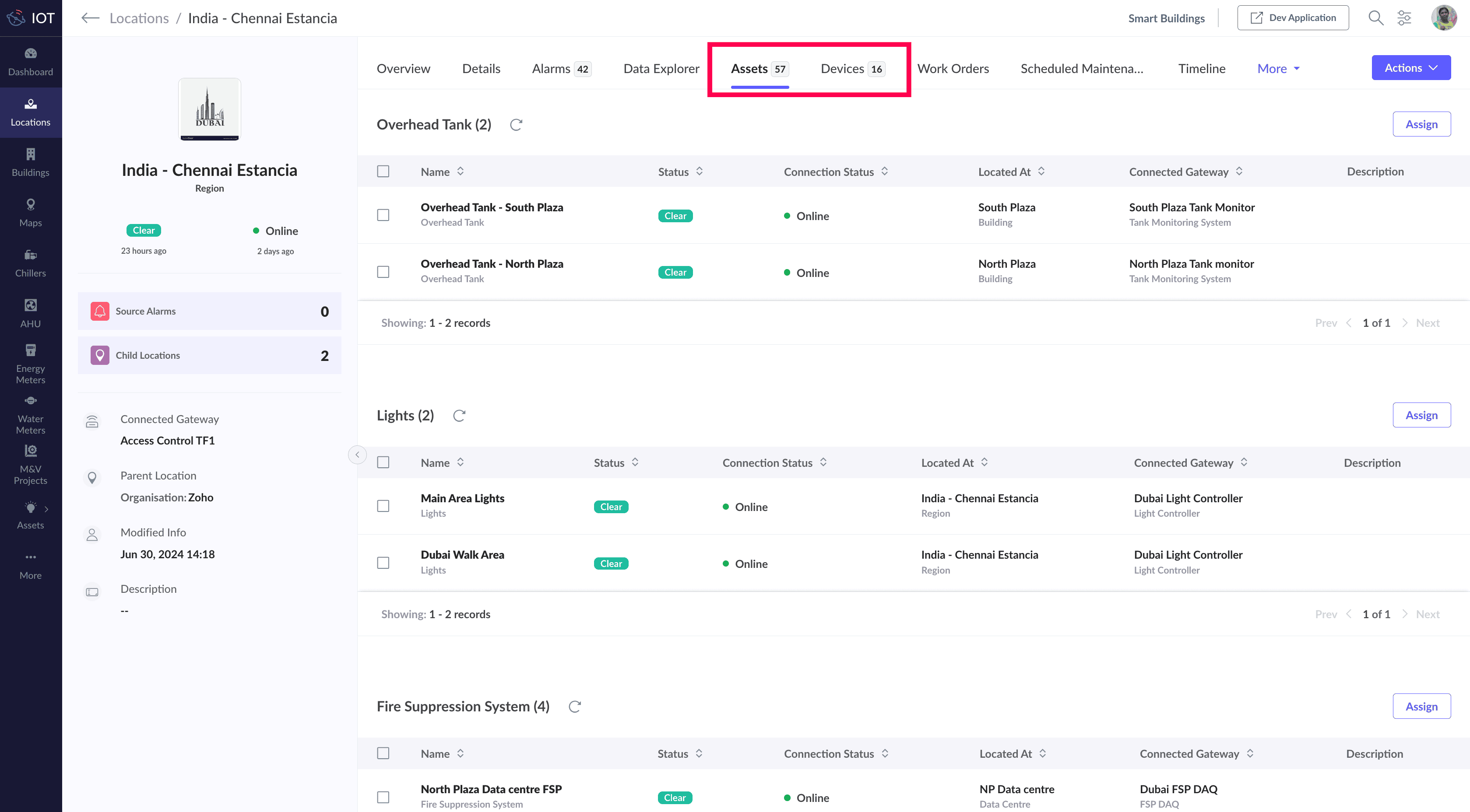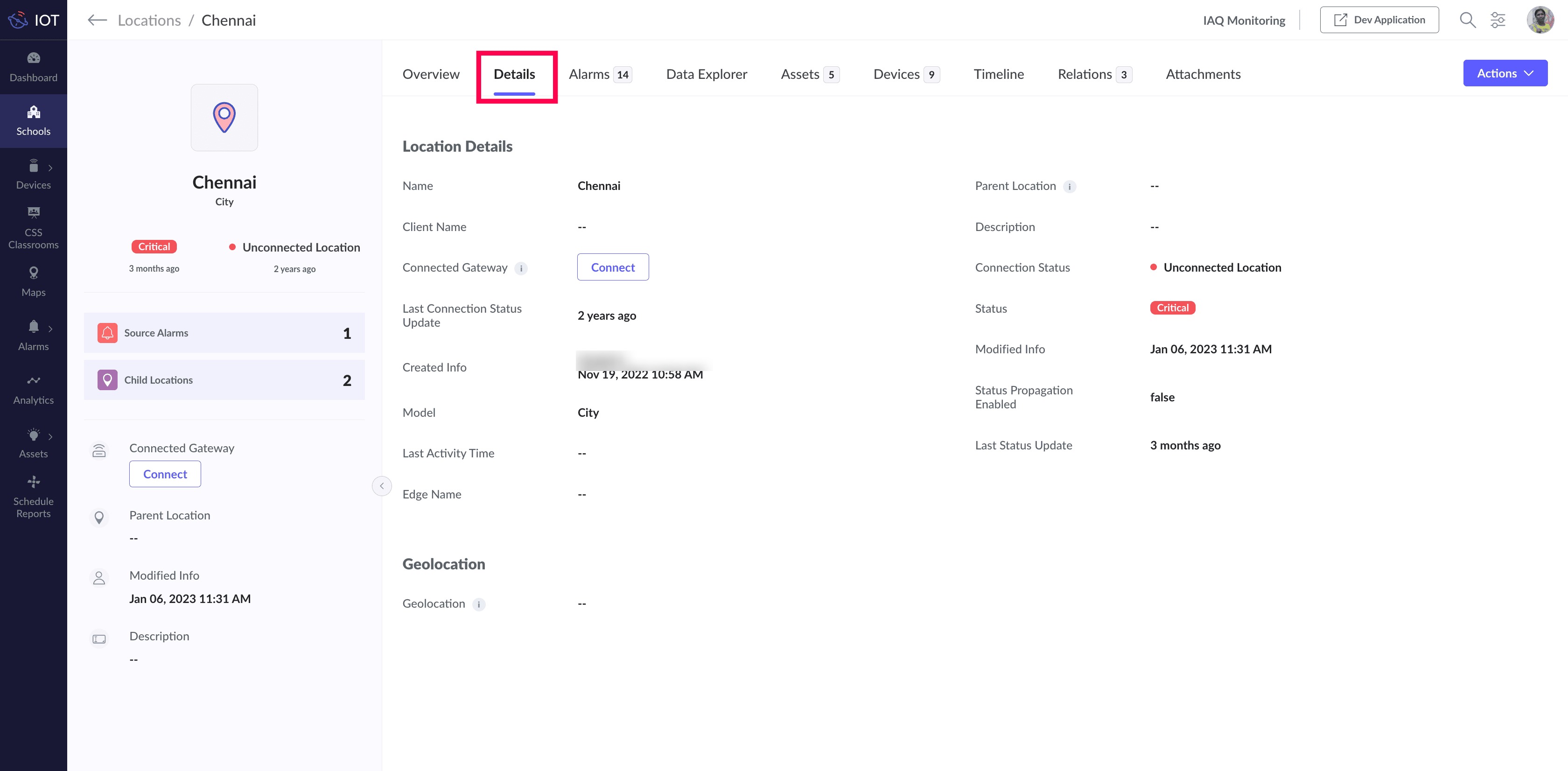 Location provides a holistic view of all the IoT devices and assets available under it. The health of each device and asset is determined by the status field. This status of the associated device and asset is reflected as the status of the particular location through the