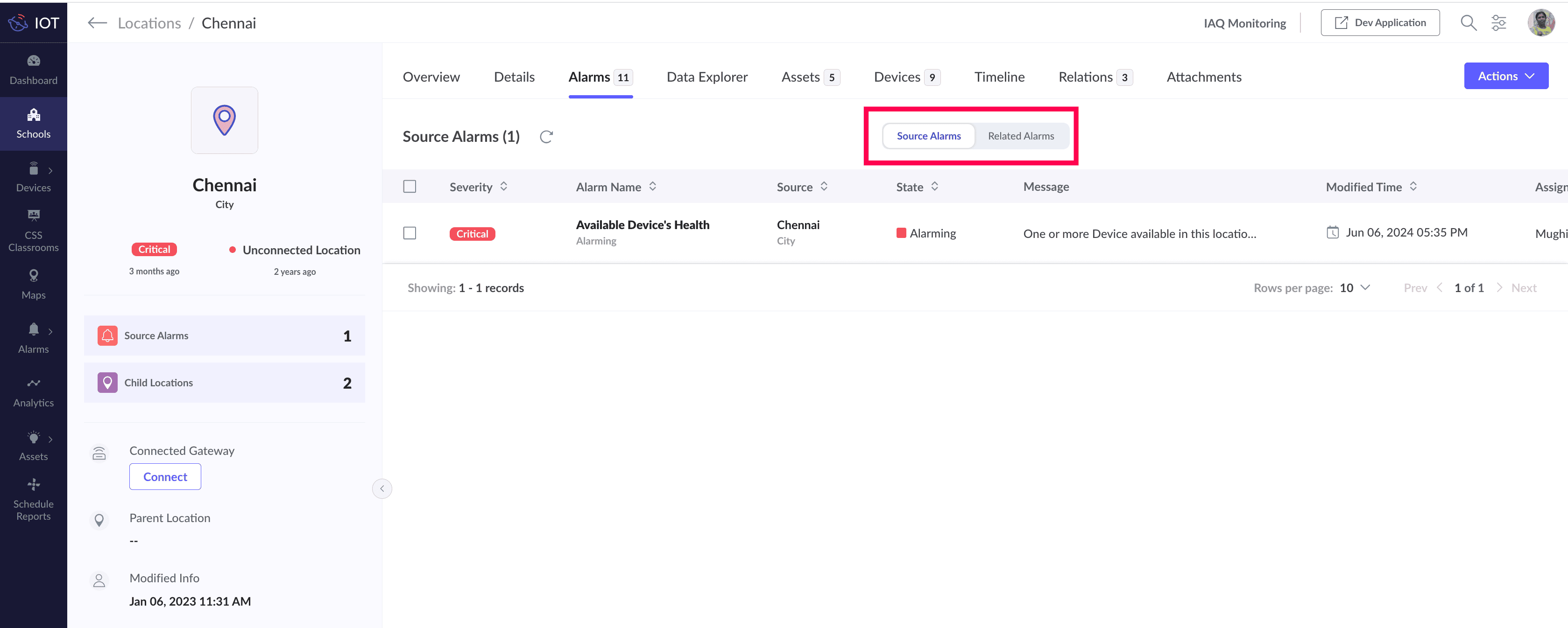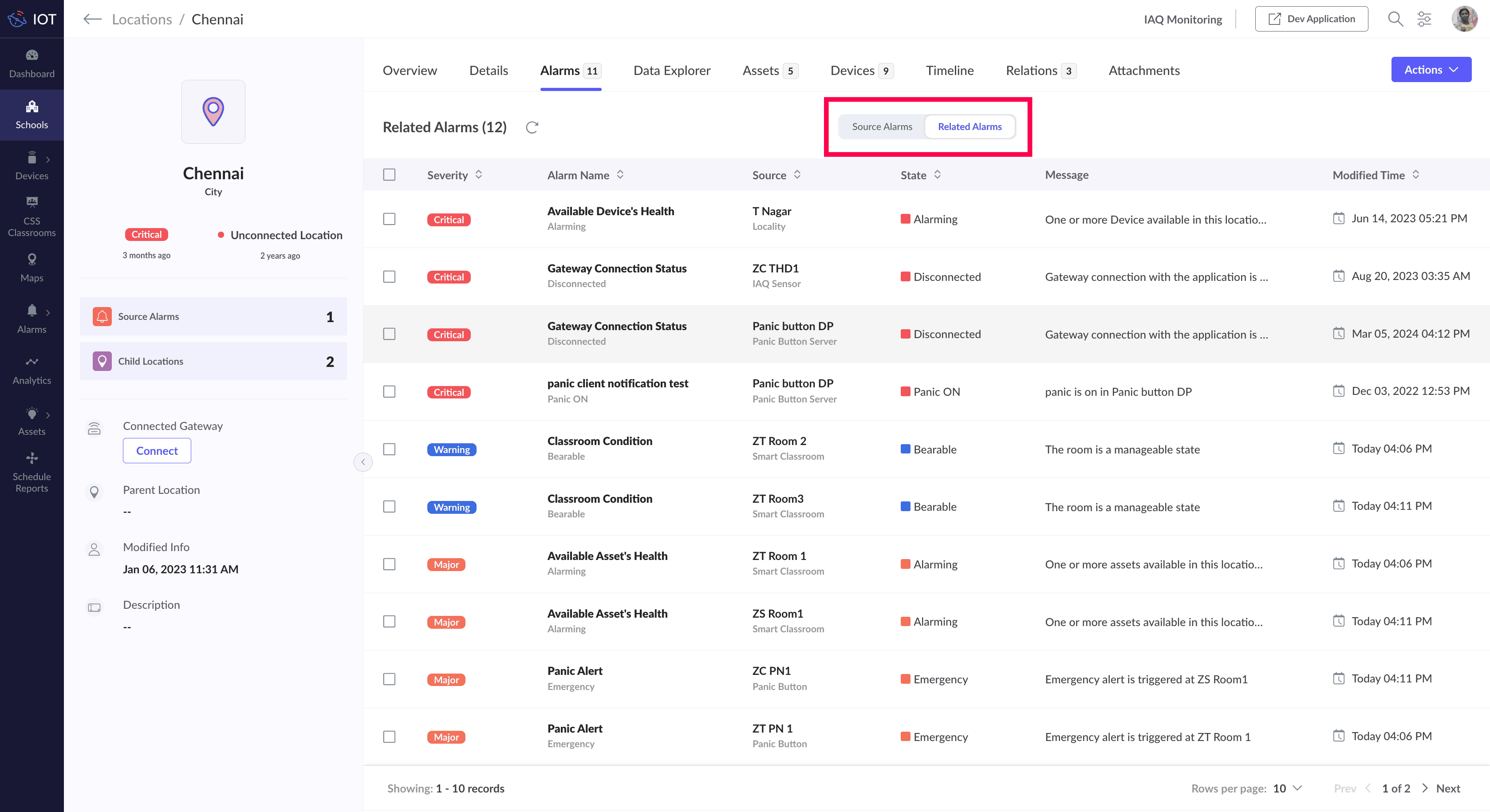 Related Alarms provides a consolidated view of all the alarms under the selected location and the alarms associated with the devices and assets mapped to the child locations of the selected location. These alarms can be viewed by using the respective toggle button.