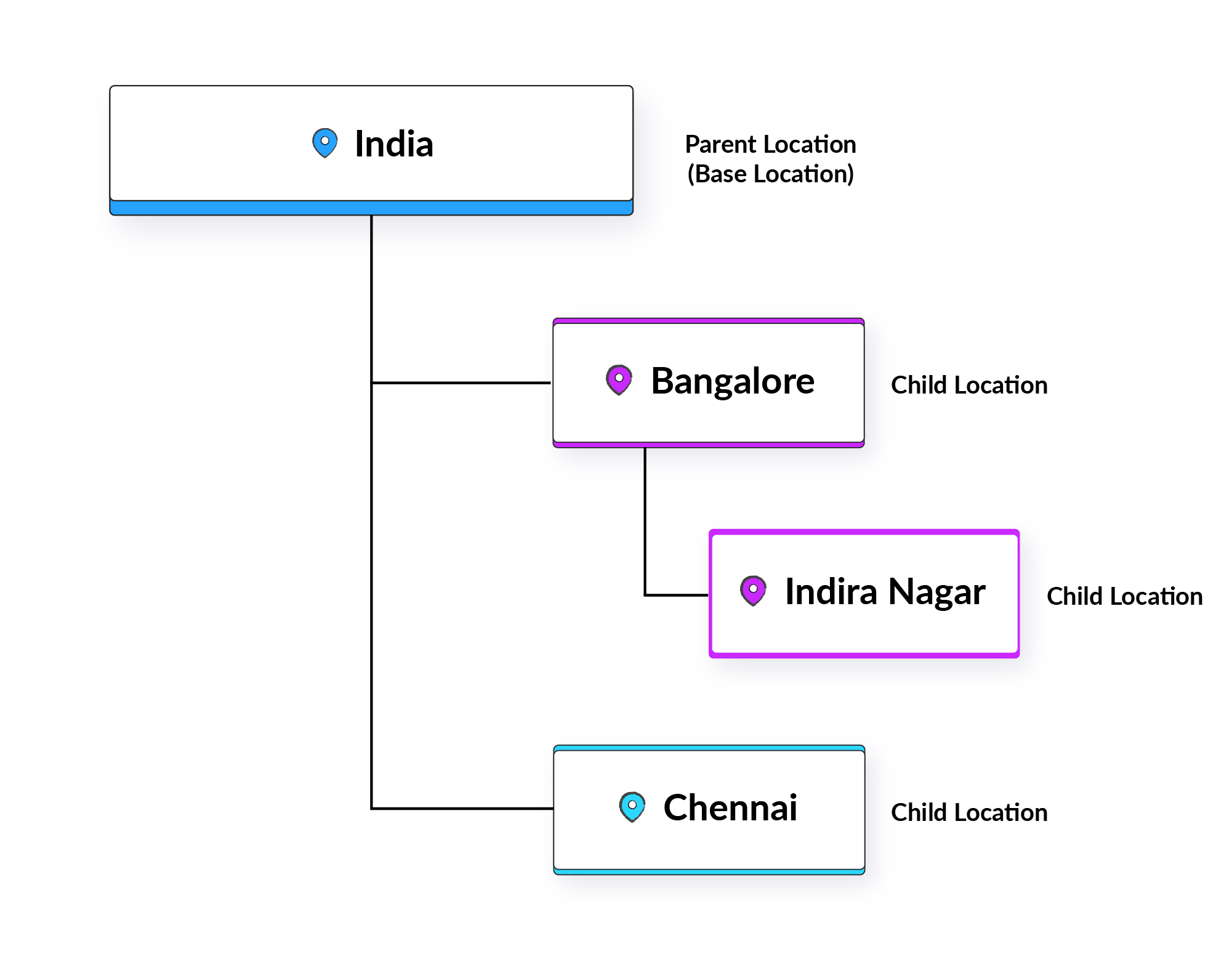 Image 2: In the multi-level hierarchy, India is the parent location, and also the base (root) location, with Bangalore and Chennai as its child location. Here, Indiranagar is mapped as the child location of Bangalore.