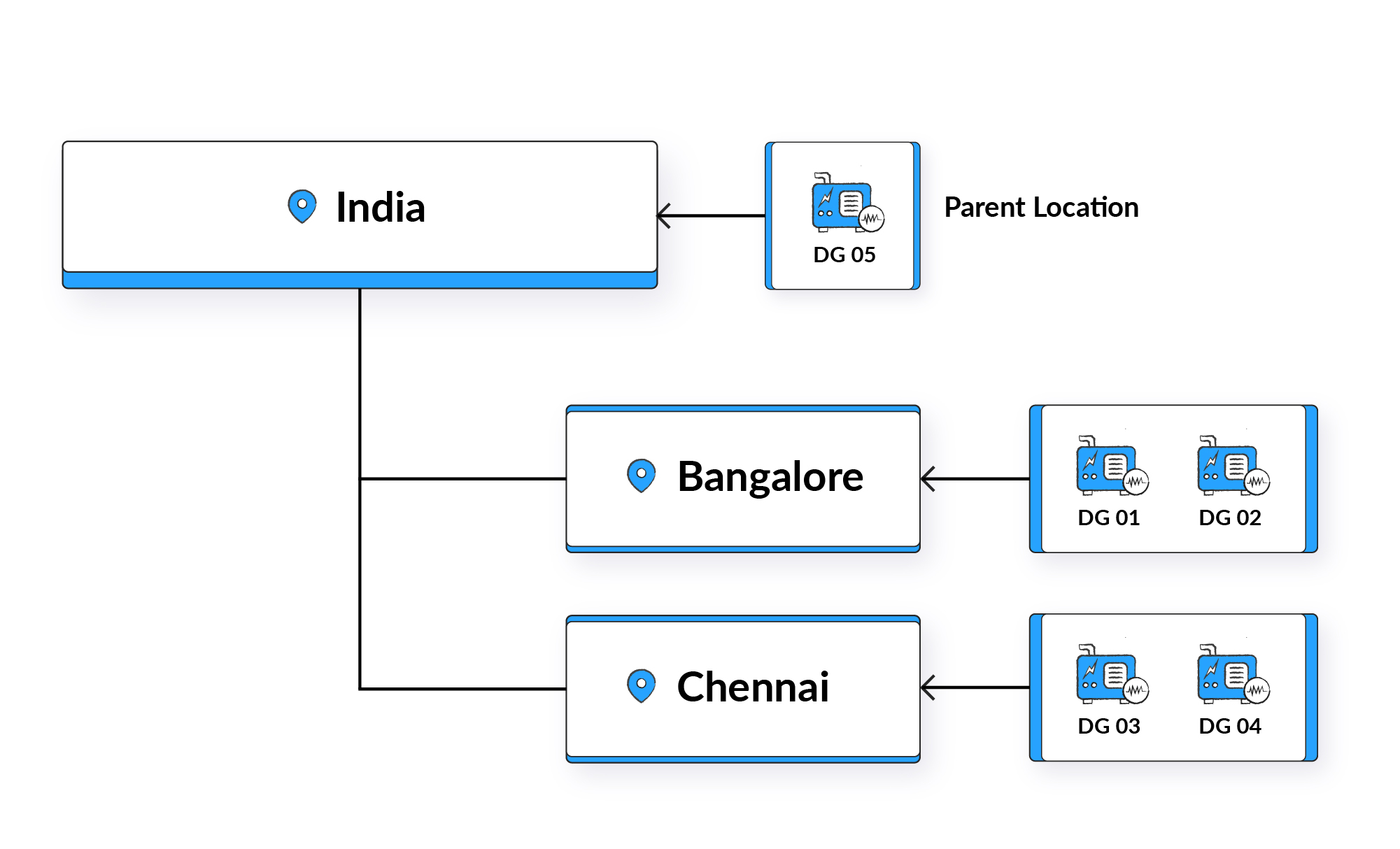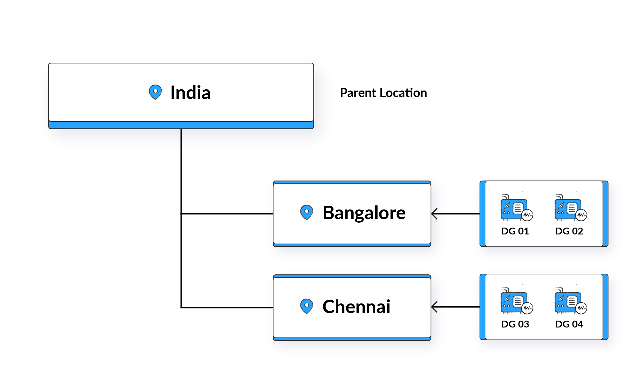Now the assets DG 1, DG 2, DG 3, DG 4, etc. and device GW_1 must be associated with their respective location. For easy understanding lets consider that the DGs are placed in the cities Bangalore and Chennai.