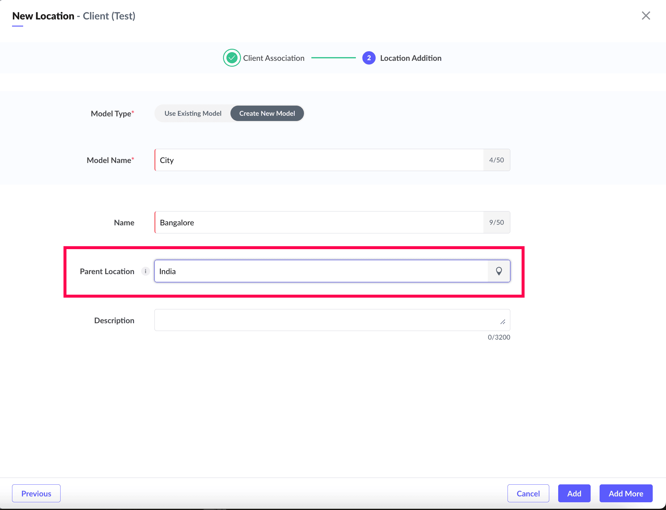 Image 4: Screenshot of location creation form with child location Bangalore configured with Parent Location as India.
