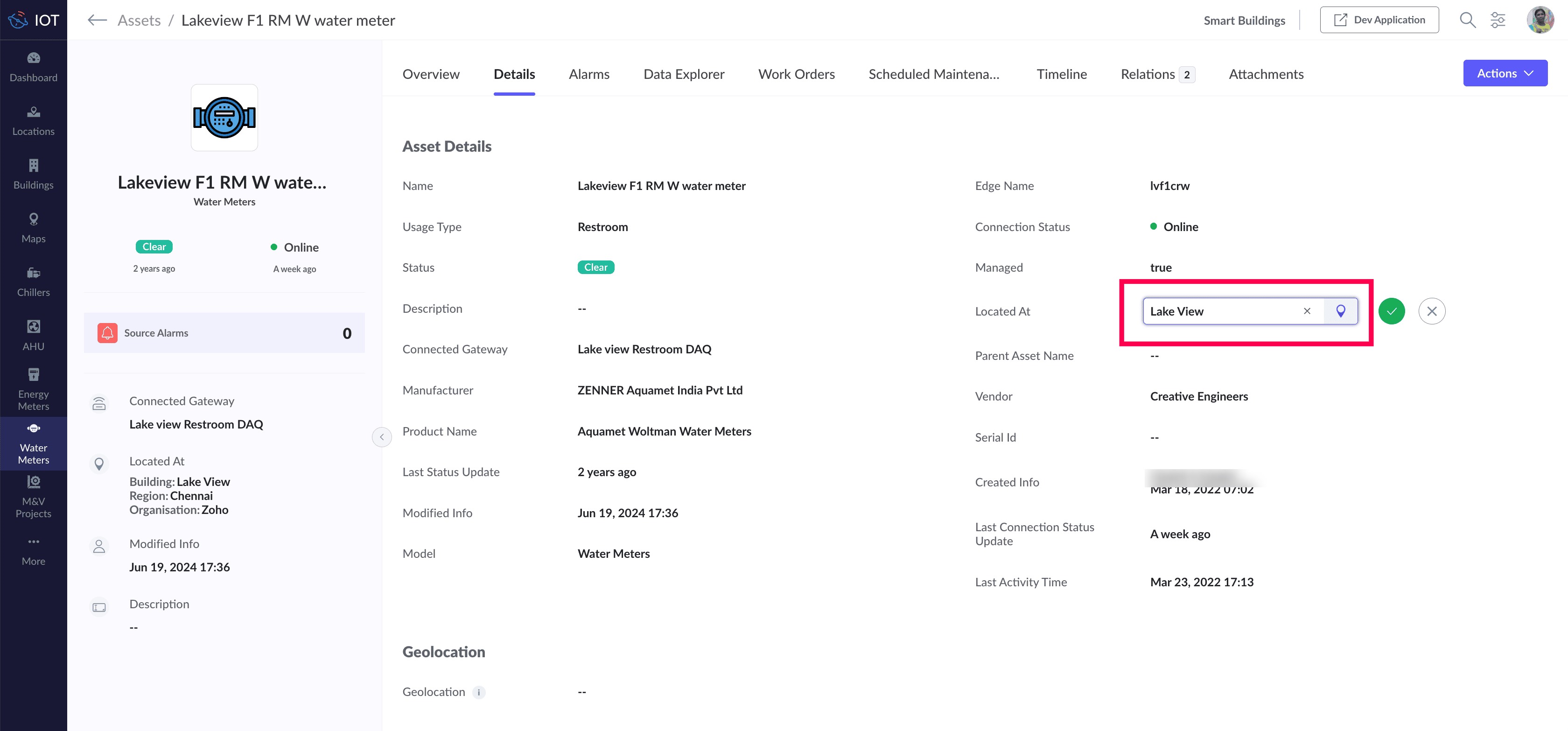 The Located At system field determines the location to which the device or asset is associated. This property can be included by editing the device or asset from its Details page.