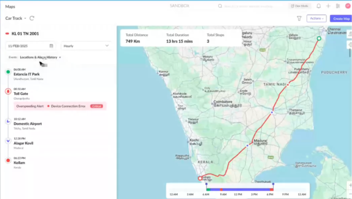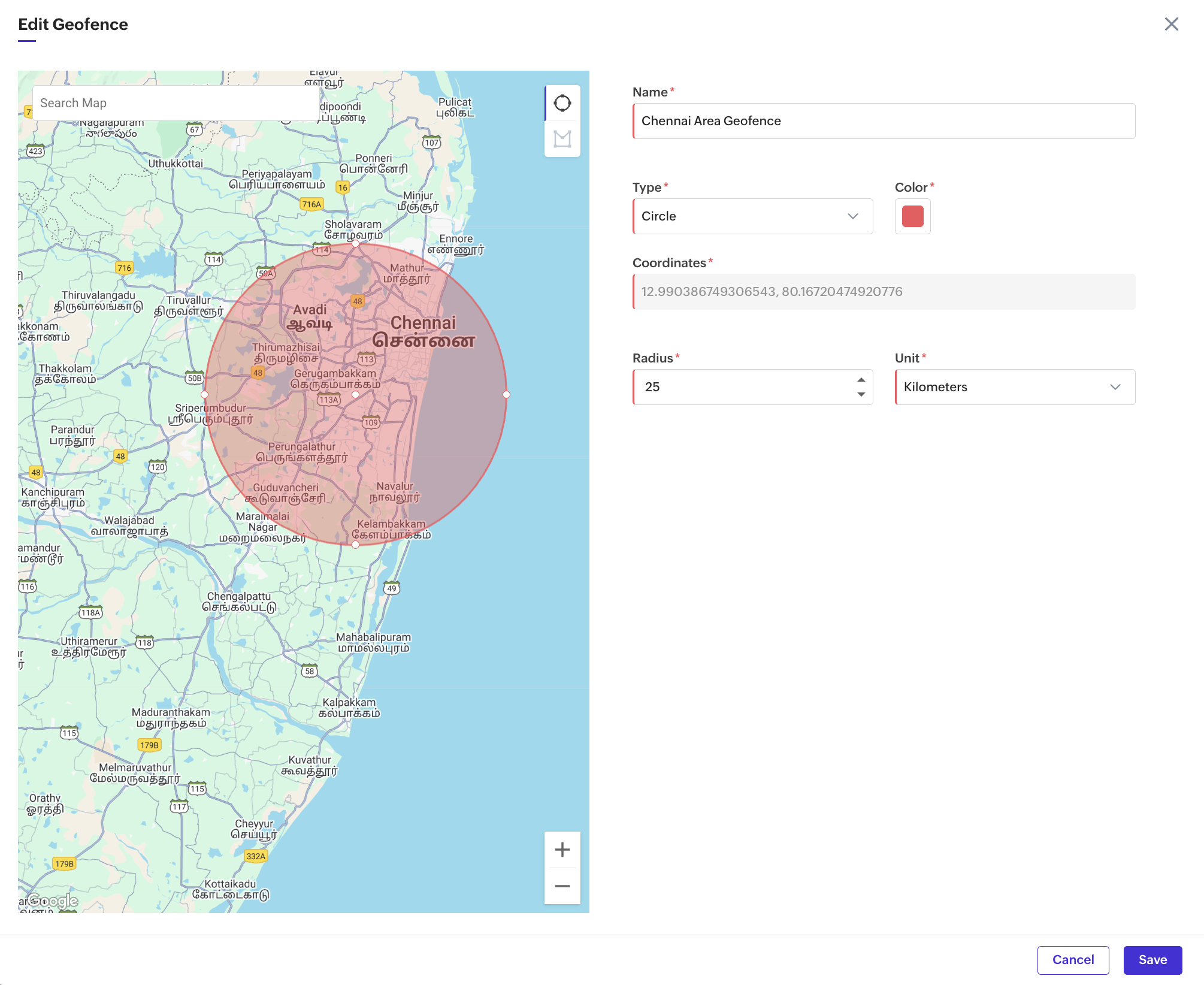 The Maps feature in Zoho IoT assists with static placement, real-time tracking, geofence boundaries setting, location history tracking of any managed entity such as devices, assets, and locations, providing clear visibility into their current placement and movements. By knowing the exact placement, you can plan new allotments, and streamline logistics efficiently. By configuring geofences you can track managed entities more attentively by associating the geofences to alarm rules, where you can set options to raise an alarm whenever an vehicle enters or exists a geofence.