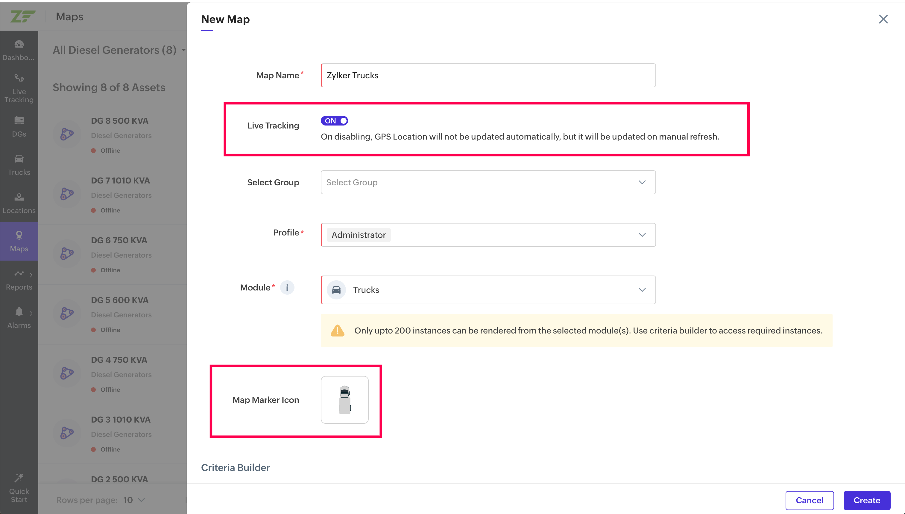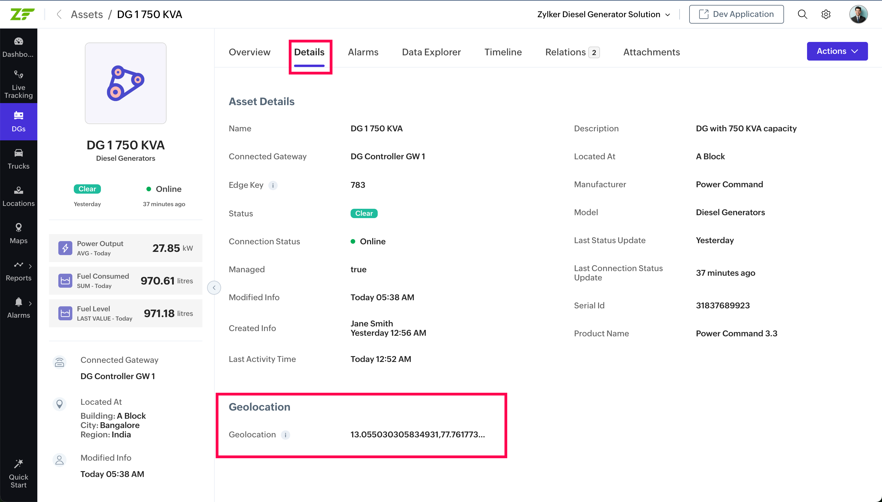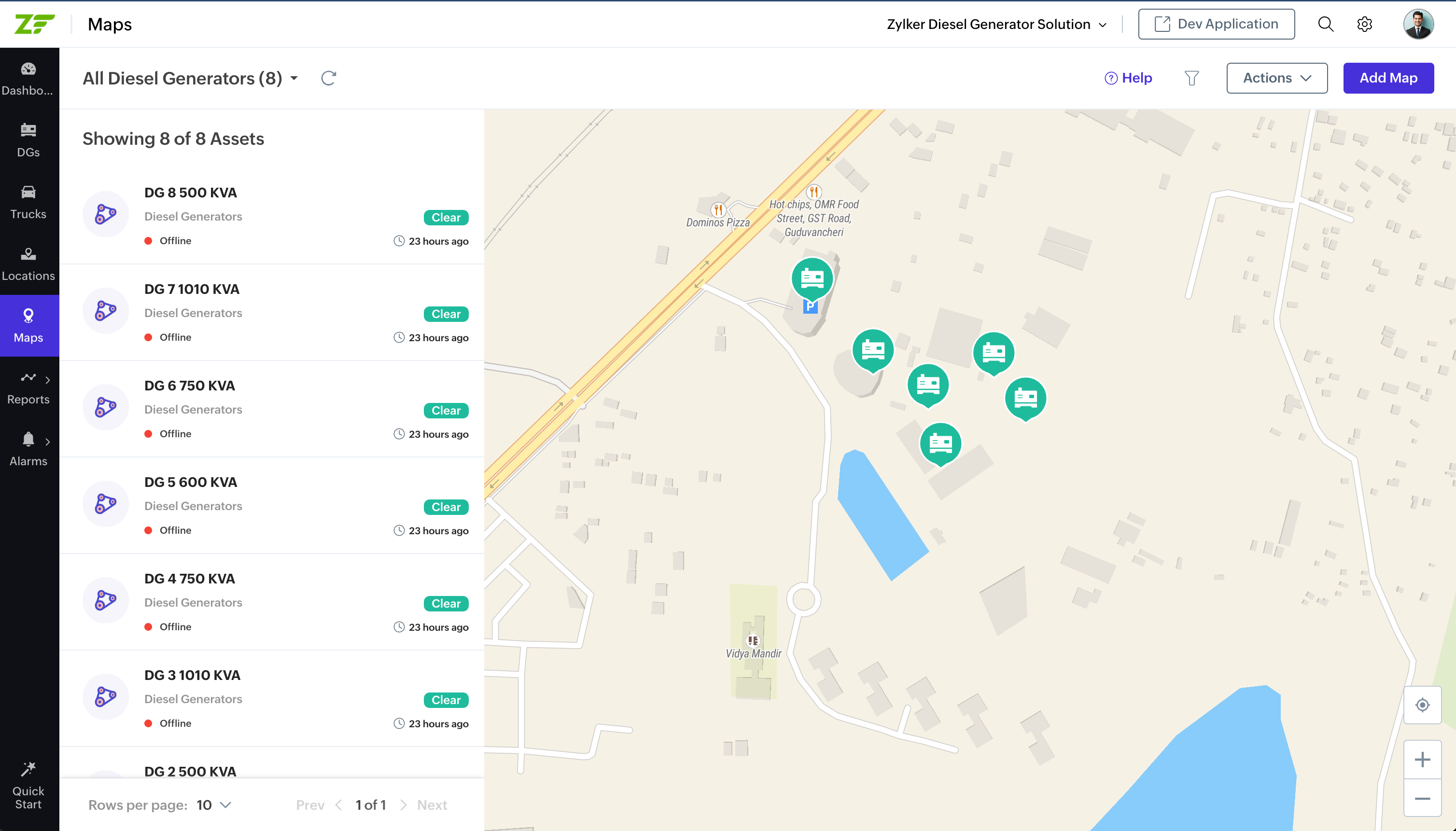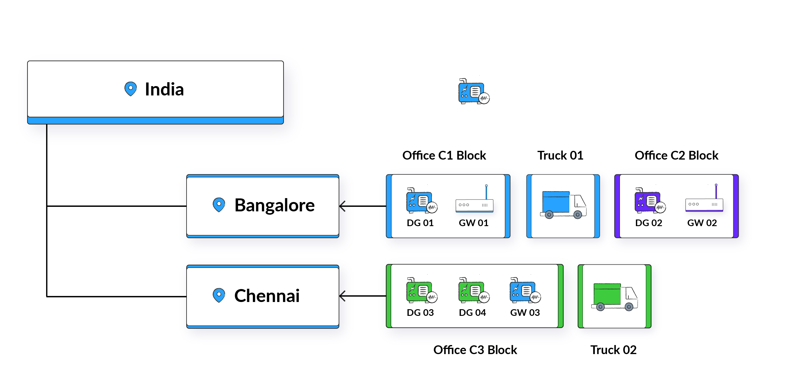 For example, consider the scenario where you have Zylker Diesel Generator Service Company with multiple branches in Bangalore(city) and Chennai(city) across India(county) with multiple Diesel Generators (DGs) and a gateway distributed in the two cities. Now, Zylker wants to create a map view "Bangalore - All Assets" and "Chennai - All Assets" to view all the assets and devices placed in Bangalore and Chennai, respectively.