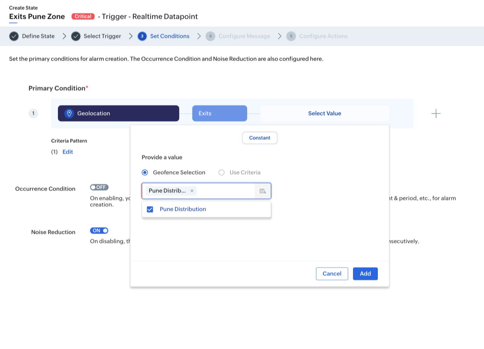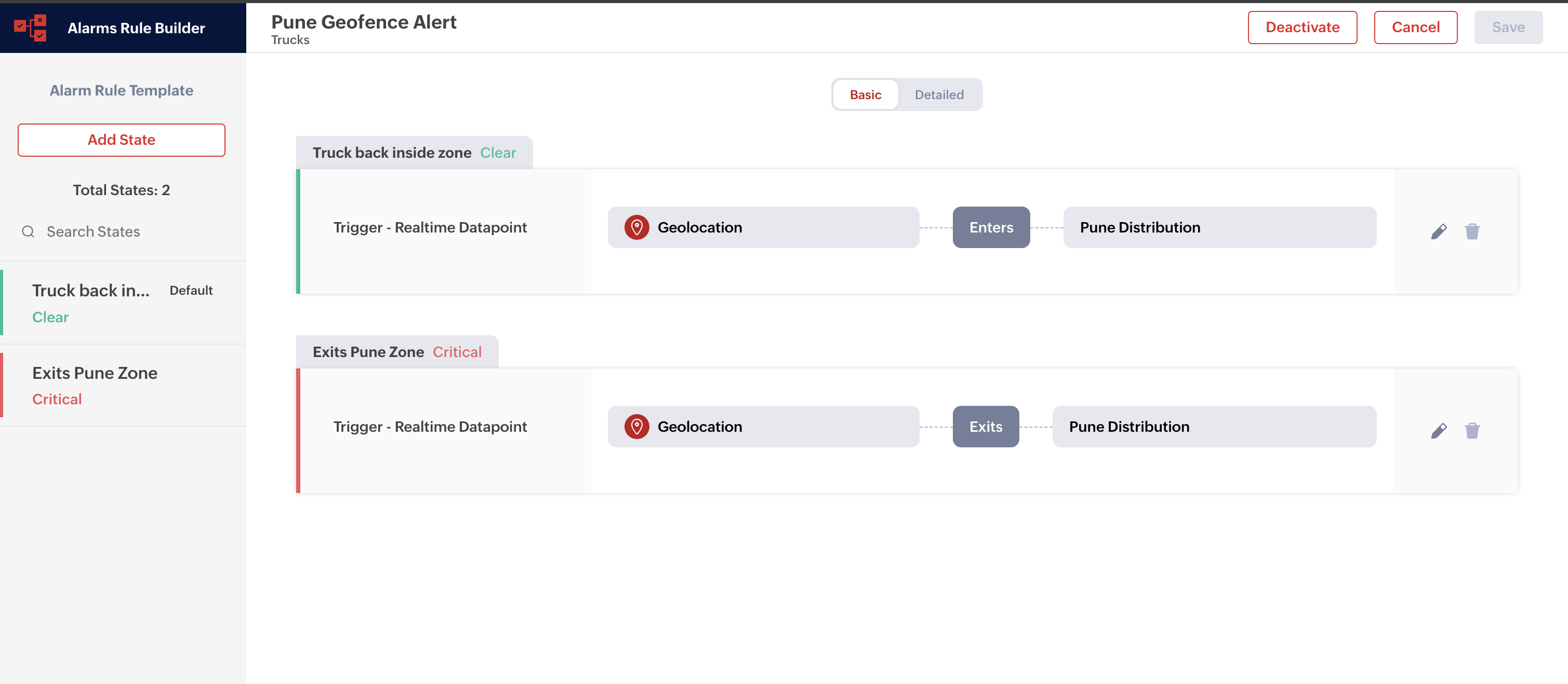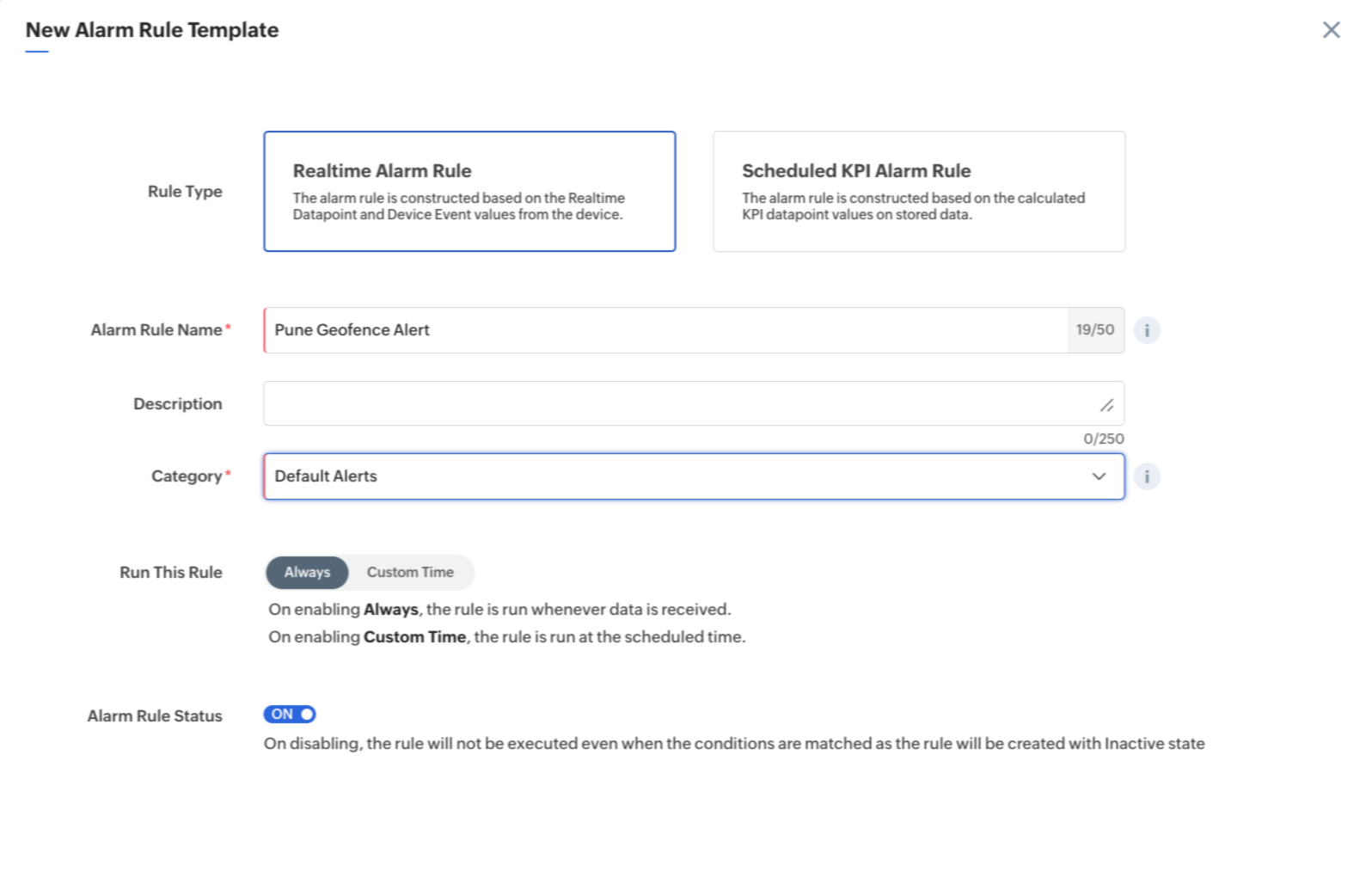 This feature allows users to configure location-based alarm rules using dynamic location datapoints rather than static geofences. Instead of defining a fixed circular geofence around a specific location, the rule dynamically compares consecutive location datapoints to detect movement or the lack thereof. This is particularly valuable in scenarios involving moving assets like vehicles, equipment, or personnel. For example, an MSP managing a fleet of delivery vehicles can configure an alarm rule to trigger when a vehicle remains within a warehouse area for longer than expected.