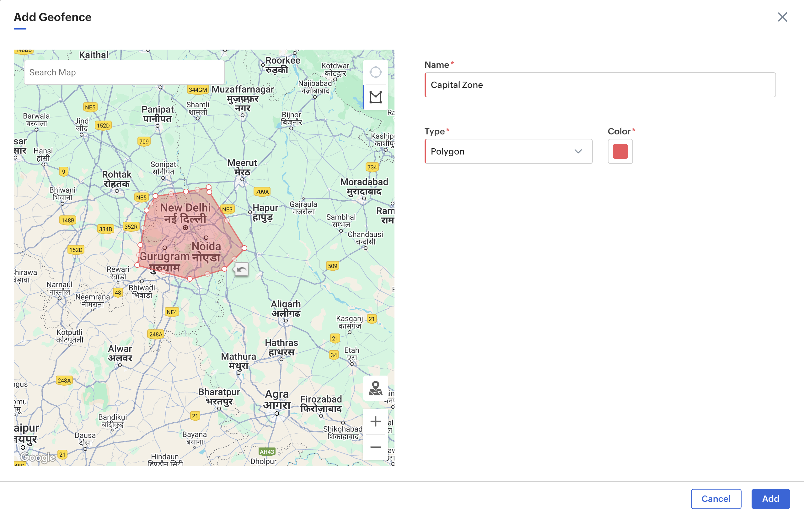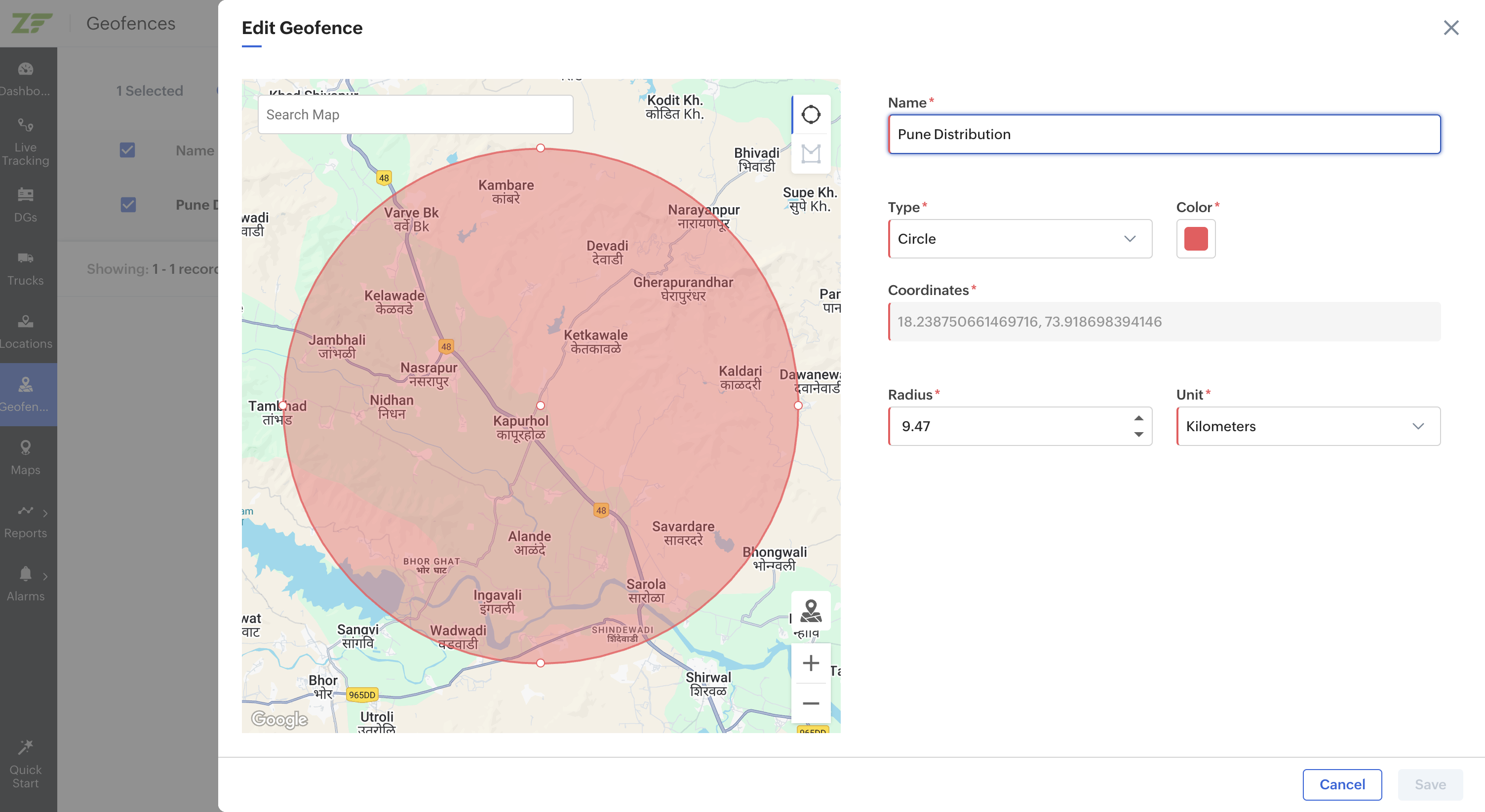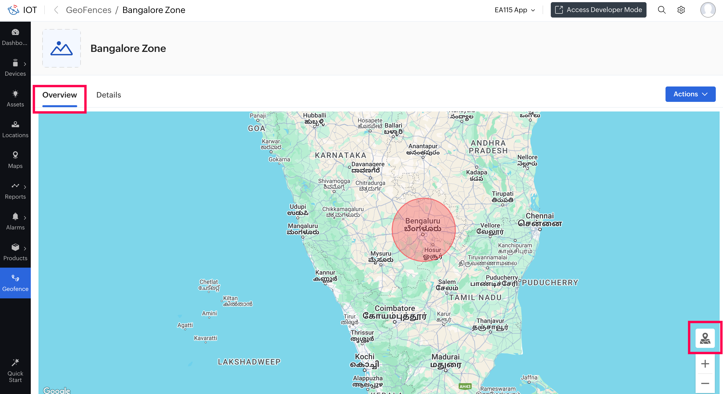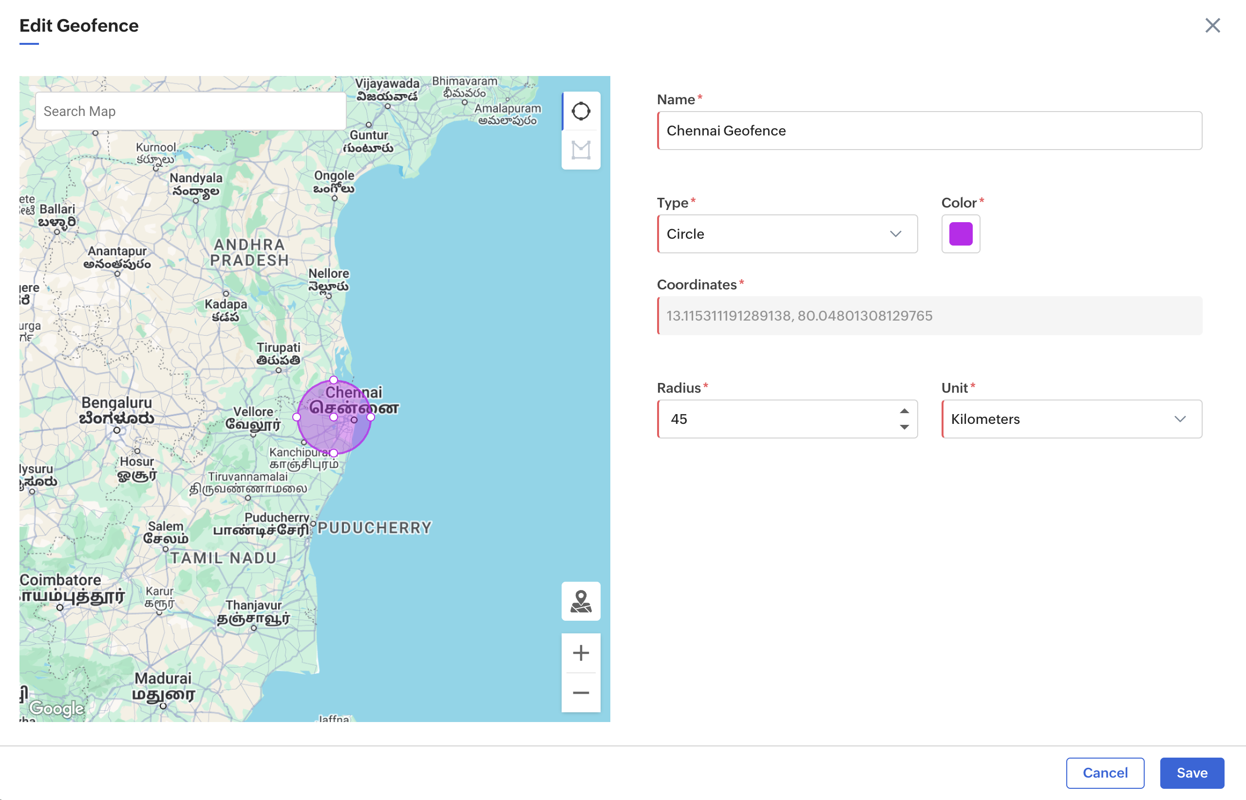 Note: If the geofence is out of focus, click on the Focusicon at the bottom right corner of the geofence to bring it to focus.