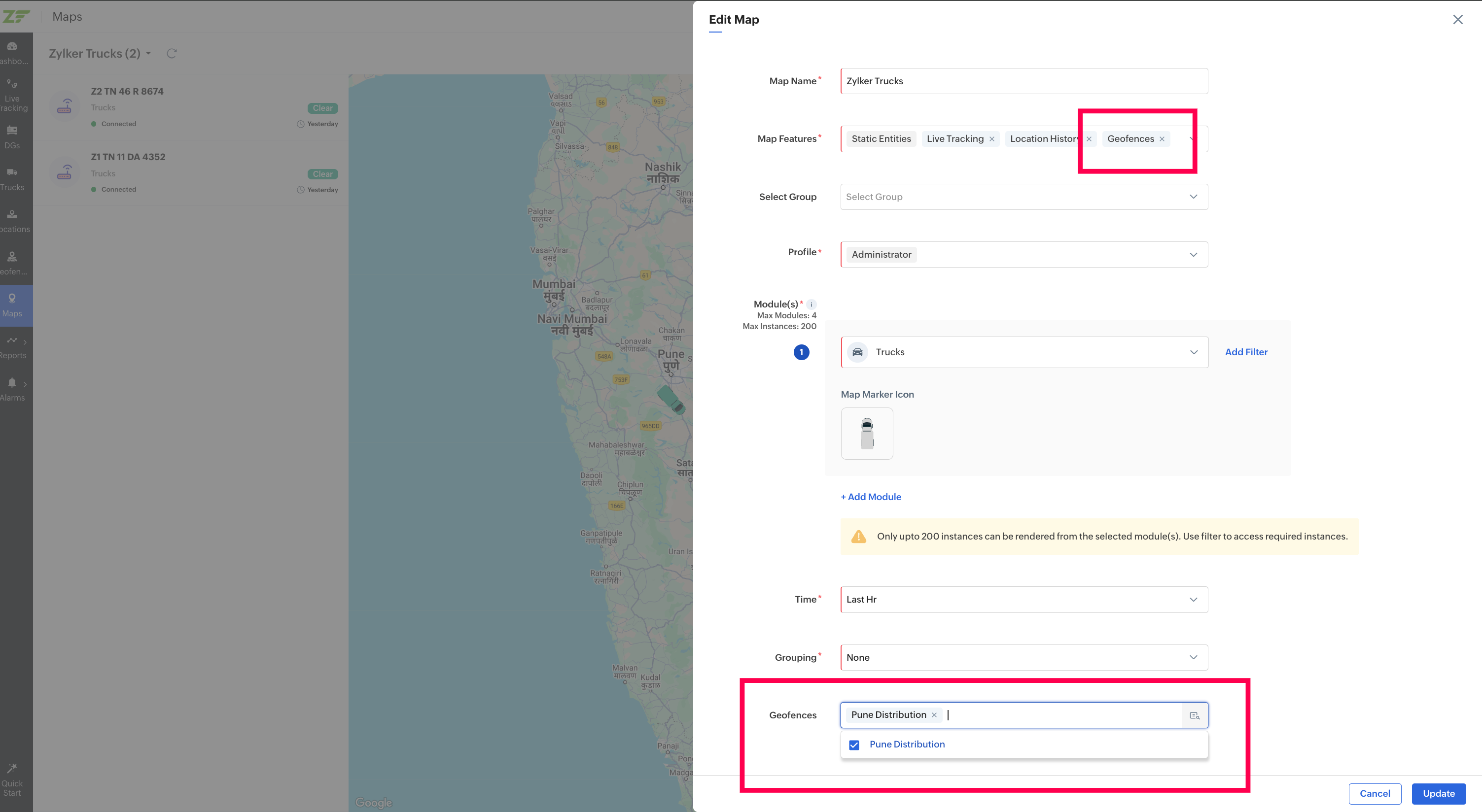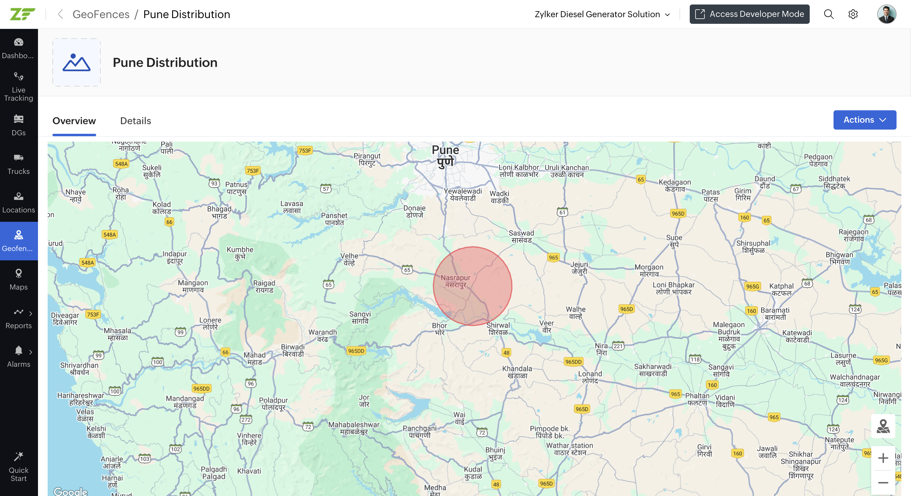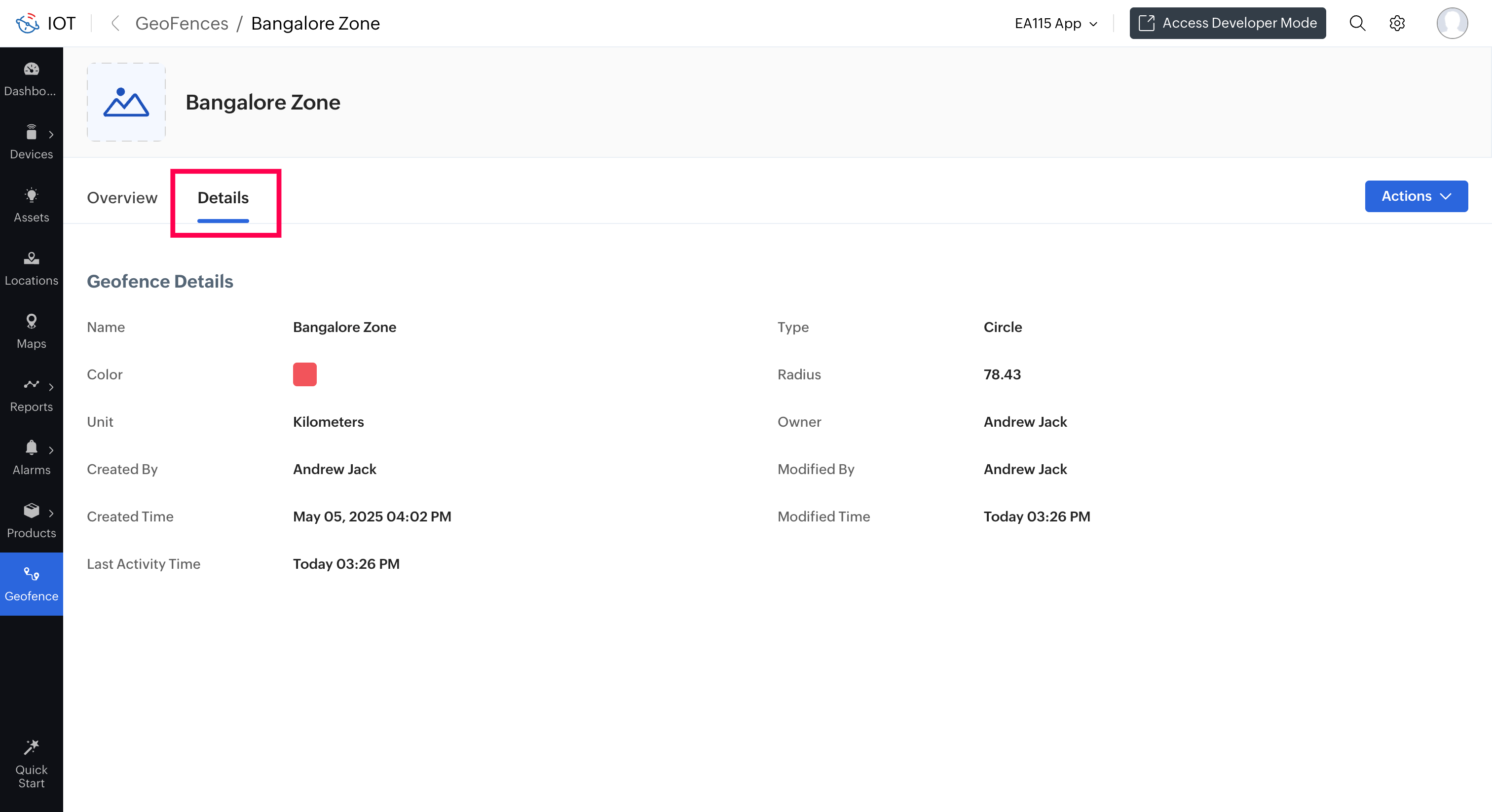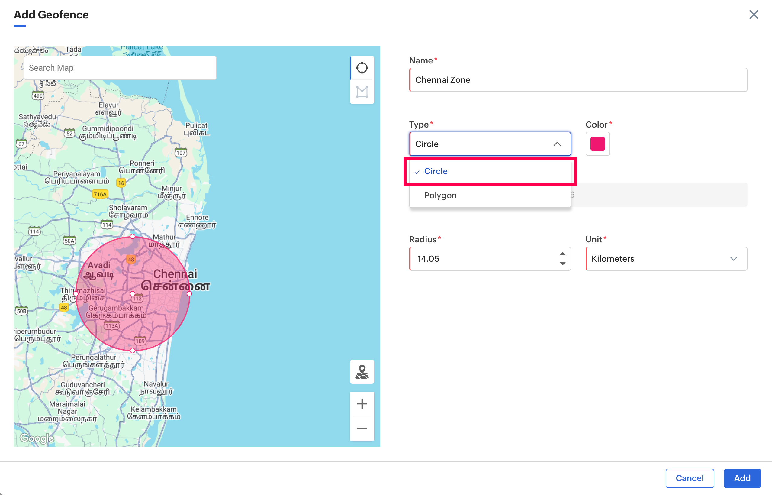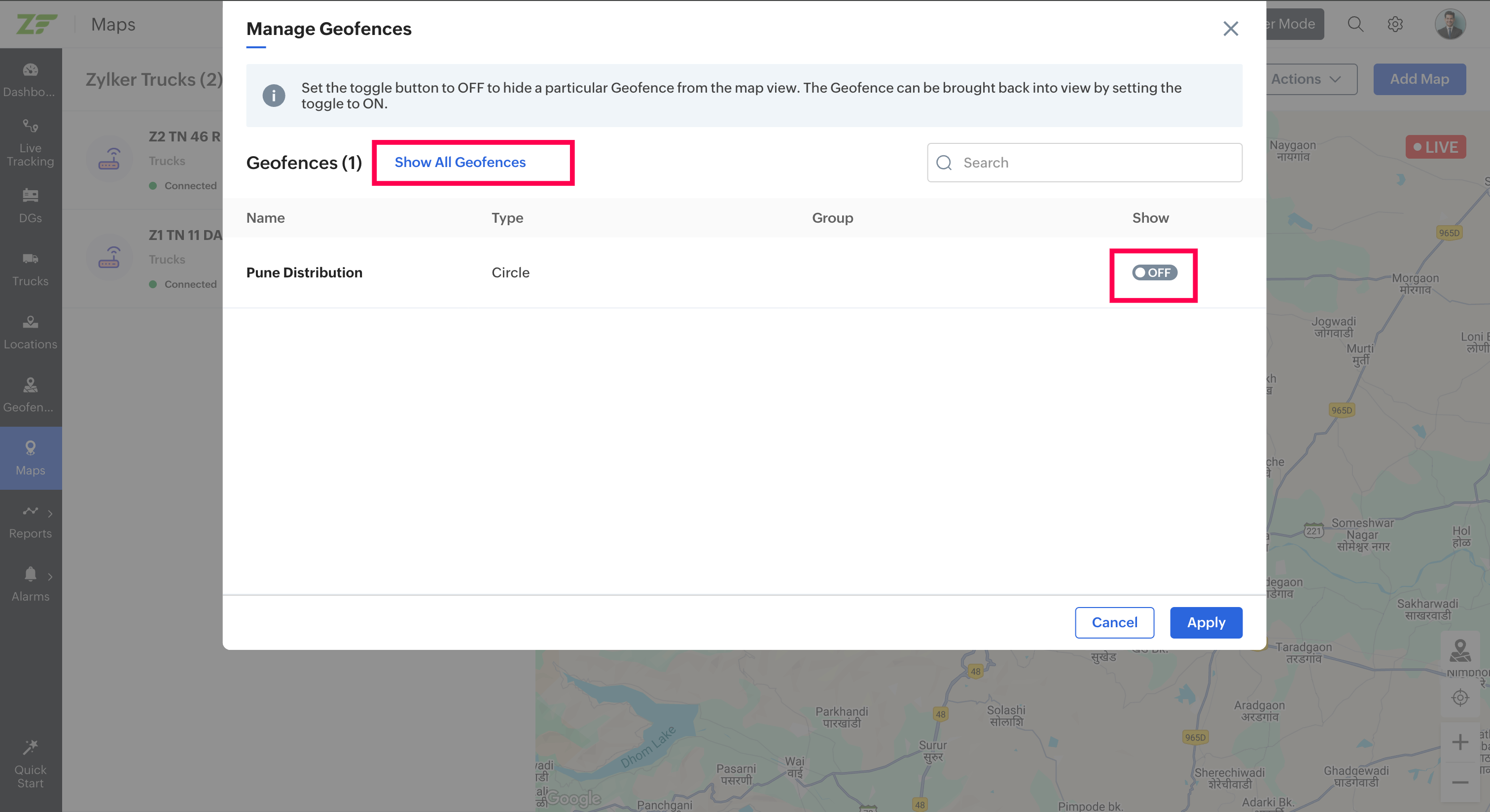 Note: If the geofence is out of focus, click on the Focusicon at the bottom right corner of the geofence to bring it to focus.