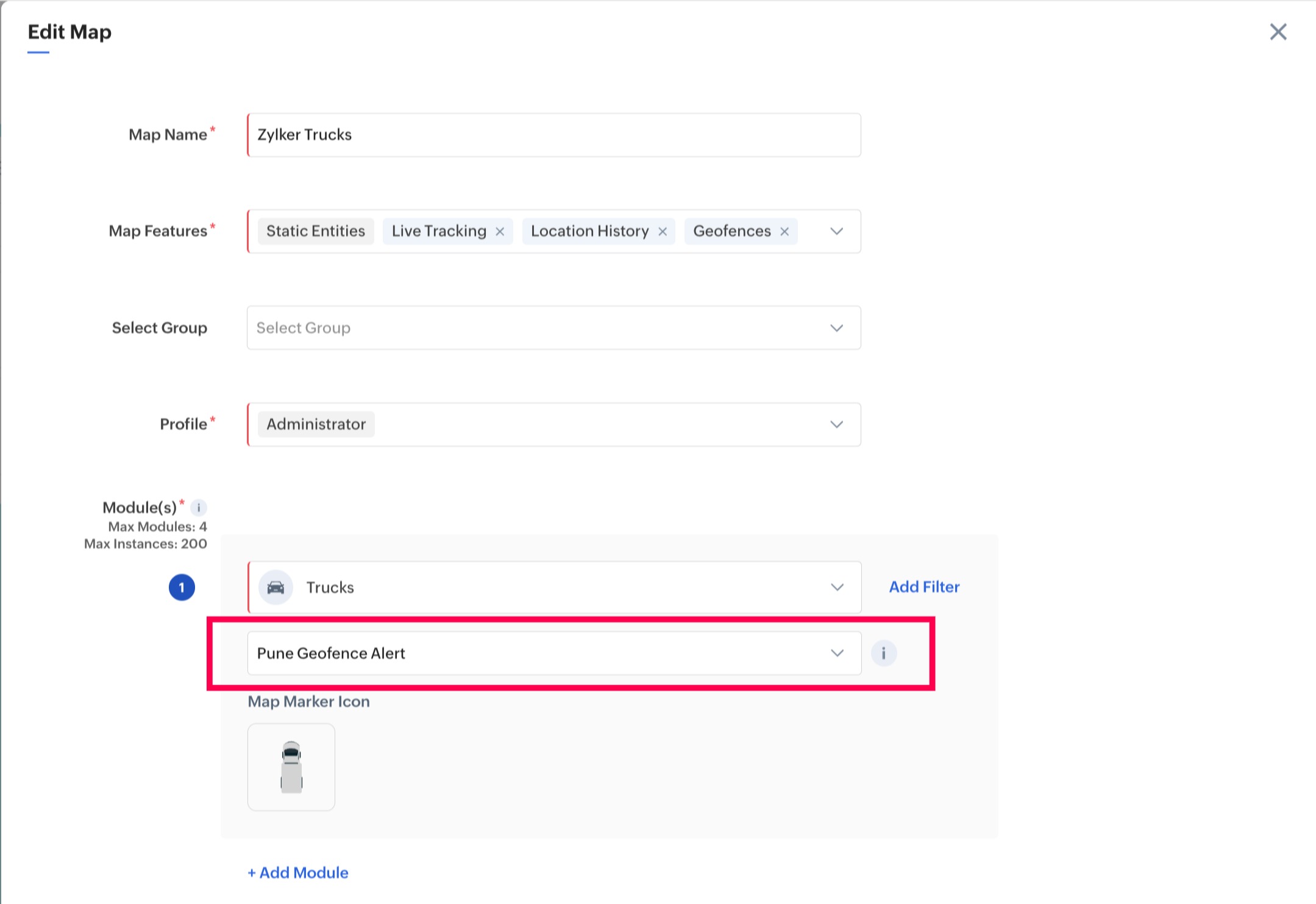 - Select the Map Marker icon if you selected a particular device/asset/location model as the module.