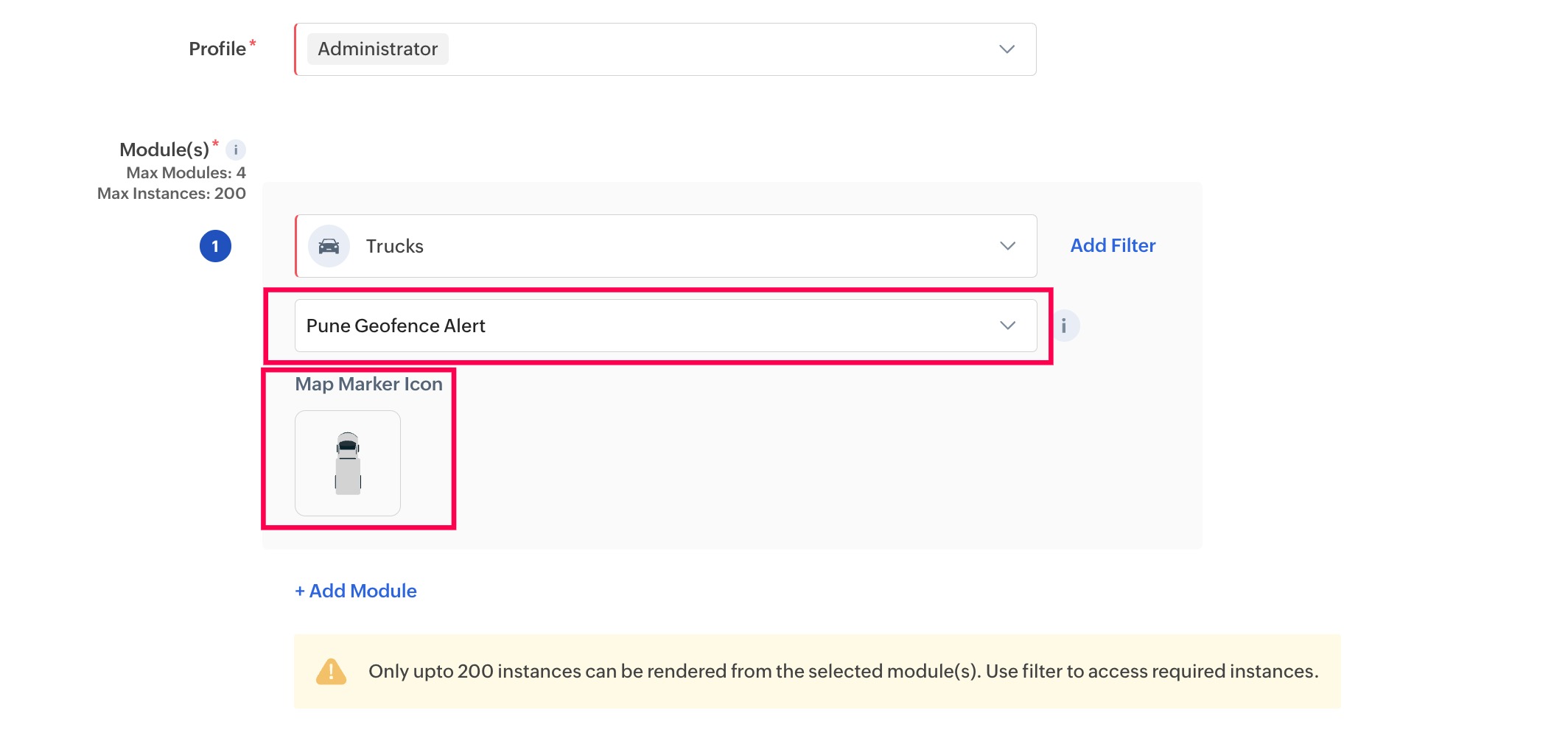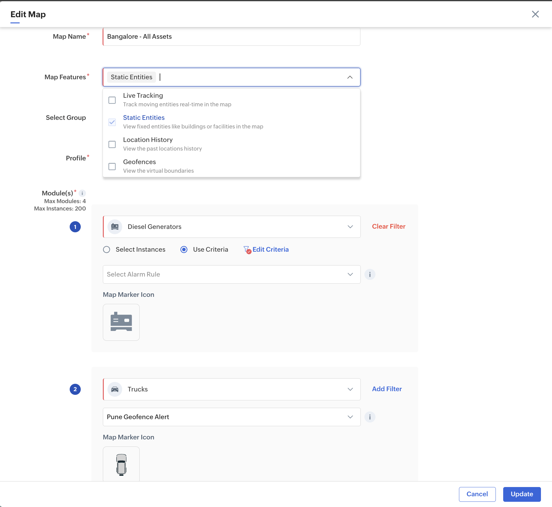 Note: You can choose upto a total of 200 instances from multiple modules to be rendered on the map.
