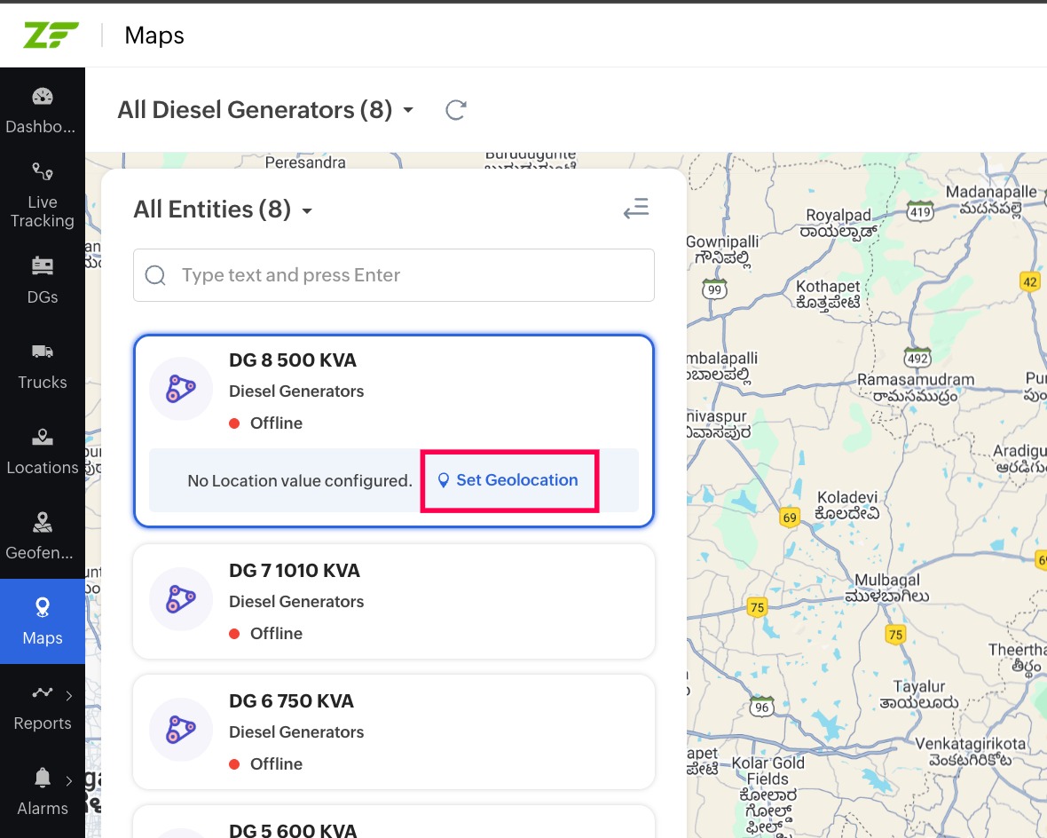 A note "No location data is received" is displayed if no location data has been received. You can set the geofence parameter for an entity from here by clicking on the Set Geofence option.