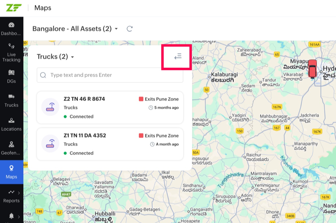 Note: You can select multiple instances of assets from difference modules/models and monitor their location on a single map.