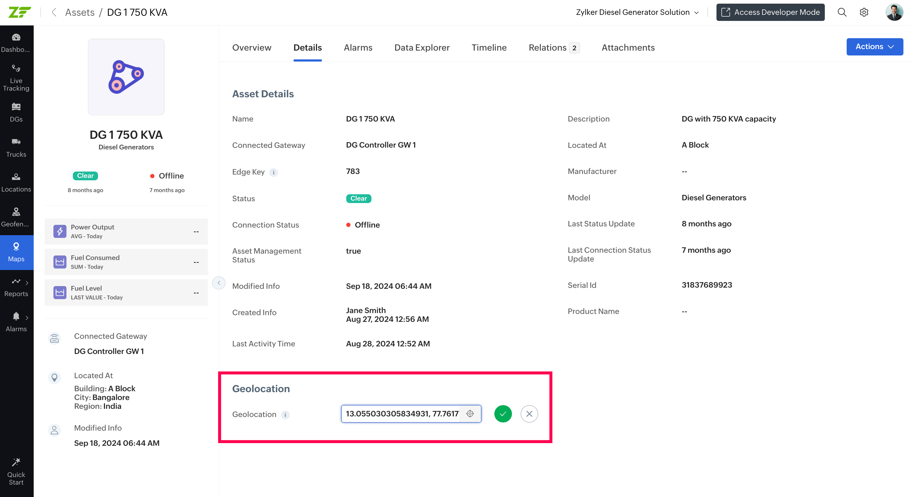 As a first step, configure the geolocation property for the managed entities such as assets, devices, and locations that must be placed on the map.