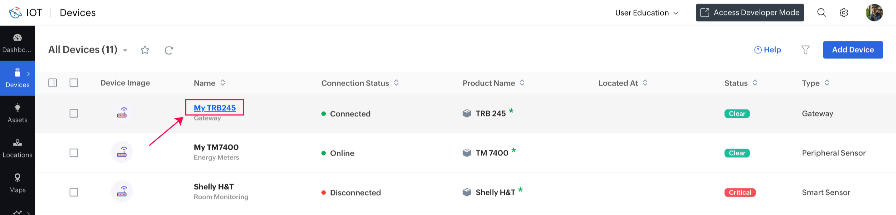 3. Click on the Gateway device to which the configuration must be sent. For this illustration, a device named My TRB245 is selected.