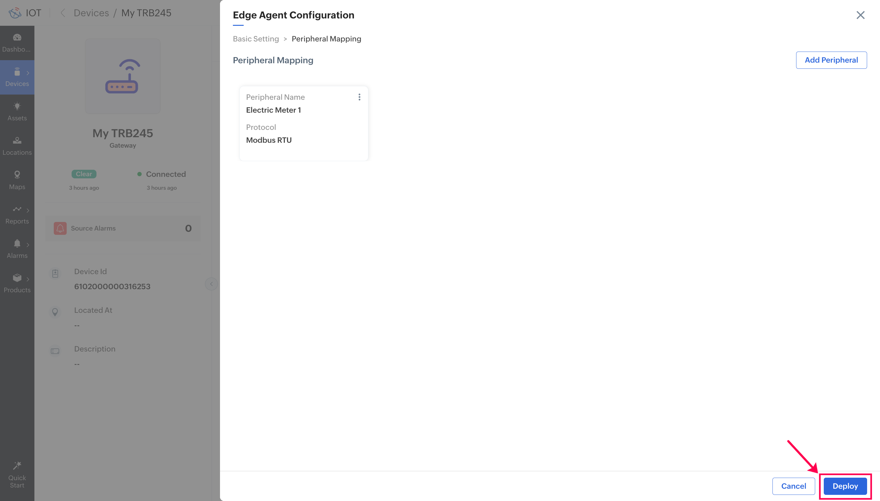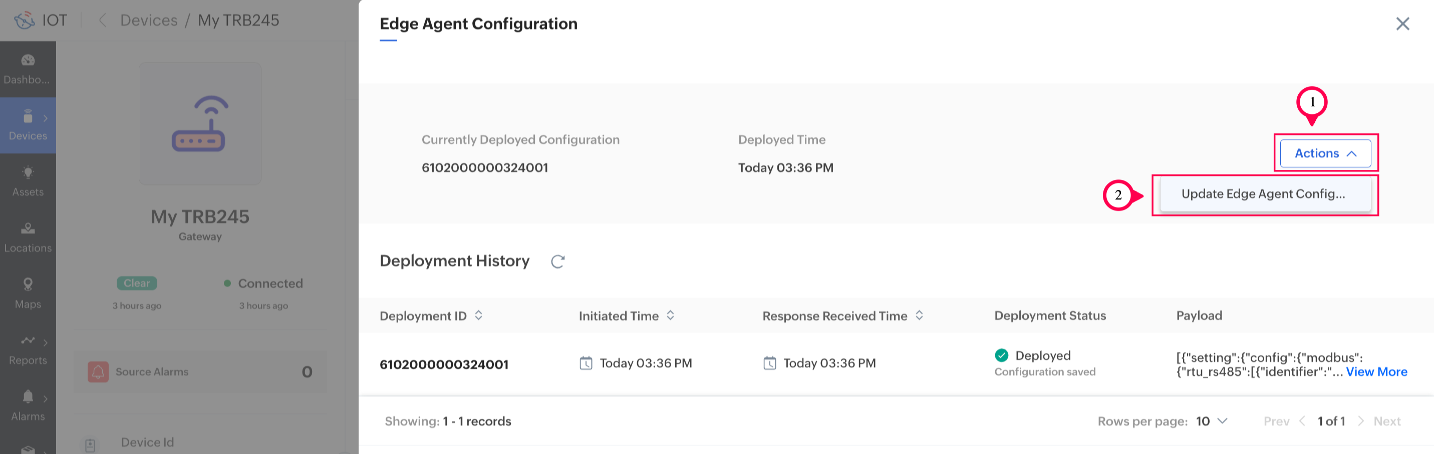 Once a configuration has been deployed, the Edge Agent configuration form will display the success or failure status of the deployment. To map a new peripheral, click Actions > Update Edge configuration settings and repeat the steps above to deploy it.