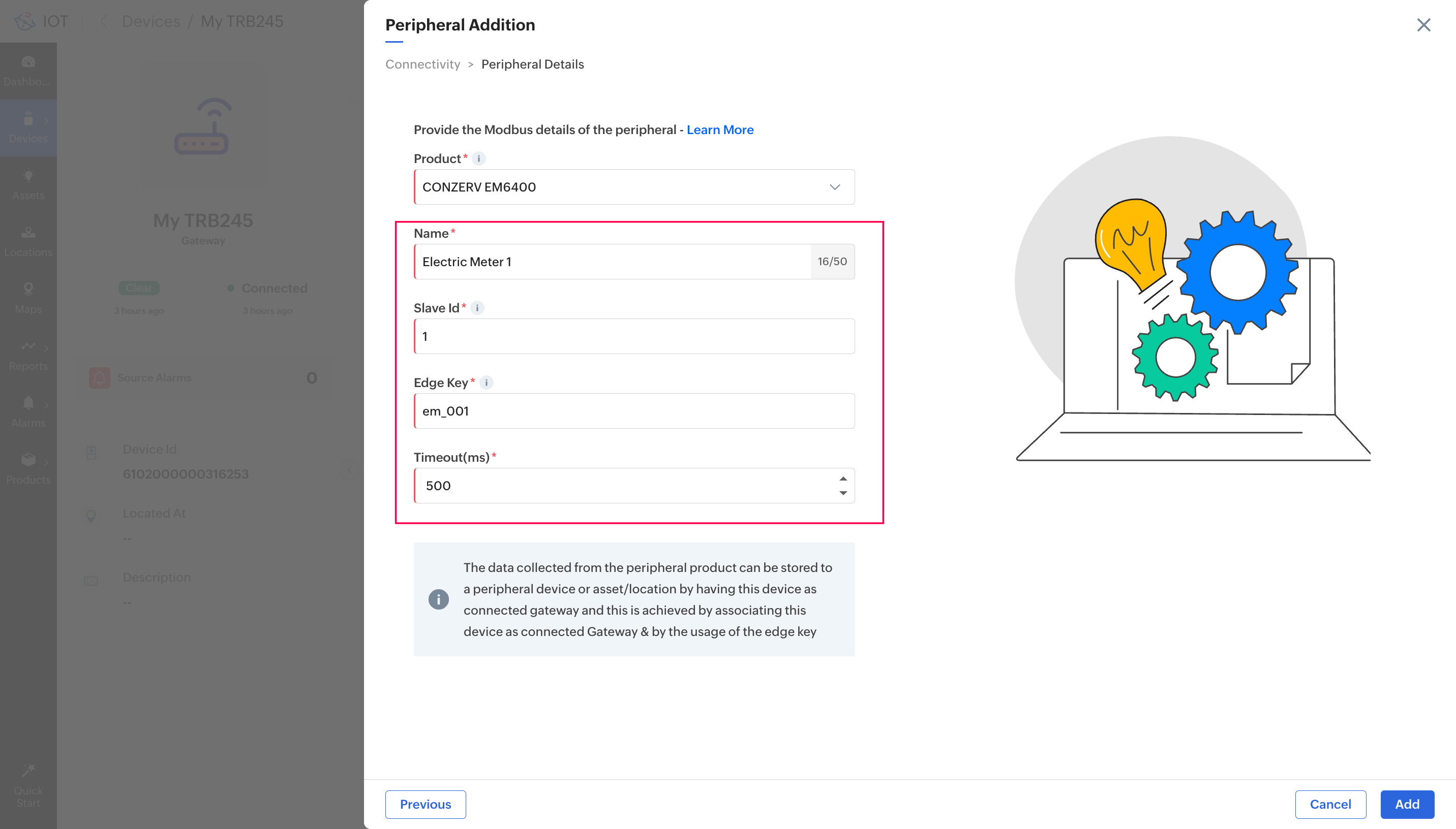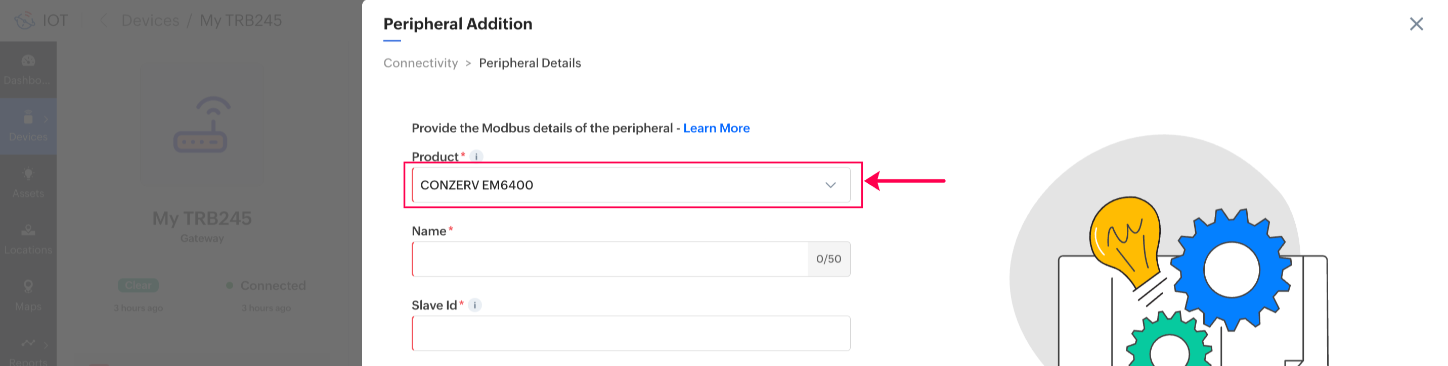 For this illustration, we will consider a TRB245 as the gateway (master) device and a CONZERV6400 as the connected peripheral (slave) device.