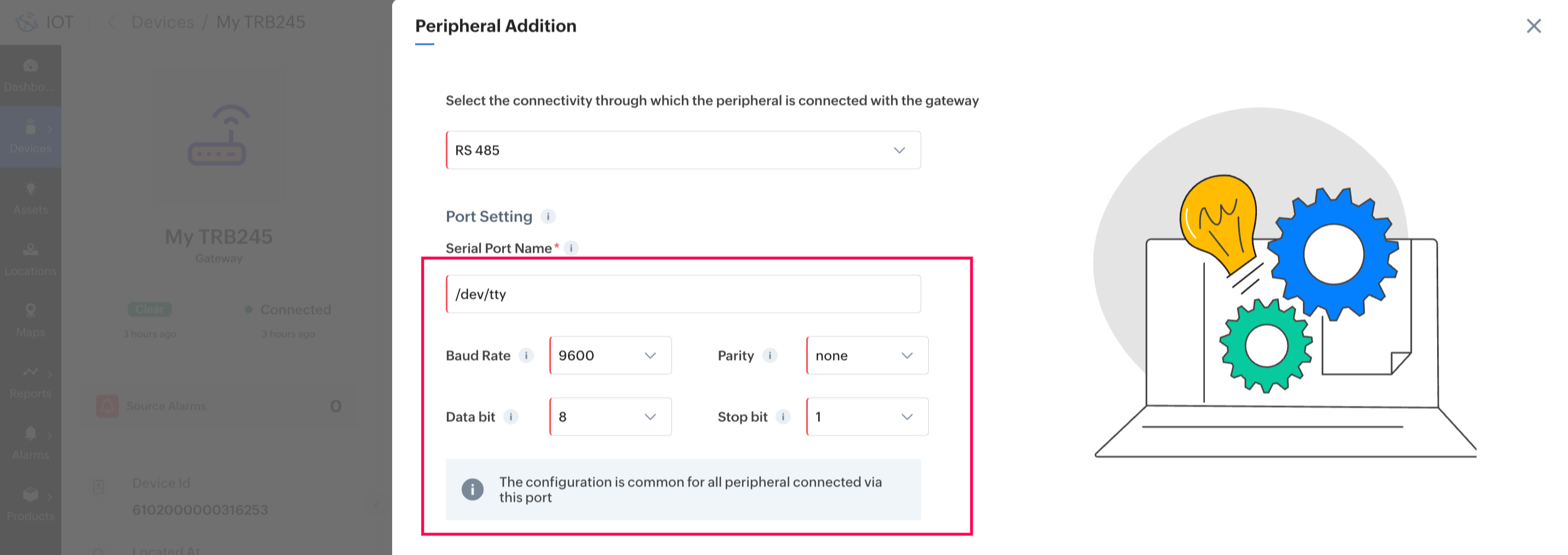 Zoho IoT applications allow you to remotely configure the RS485 port settings of a connected gateway and the required Modbus registry mapping for the slave devices, then deploy them to the gateway.