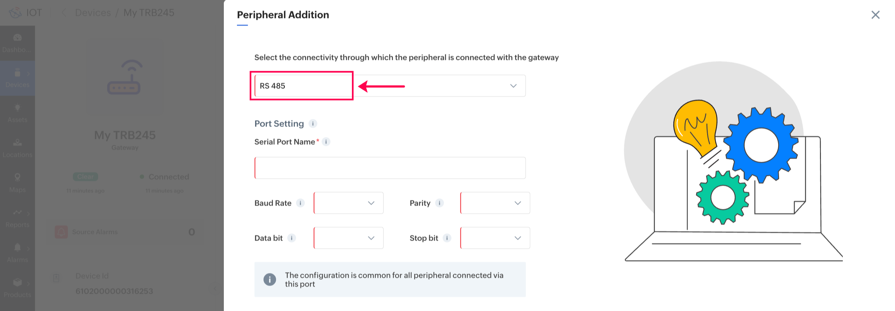 8. In the Peripheral Addition form, select RS 485 as the connectivity between the gateway and the peripheral device.