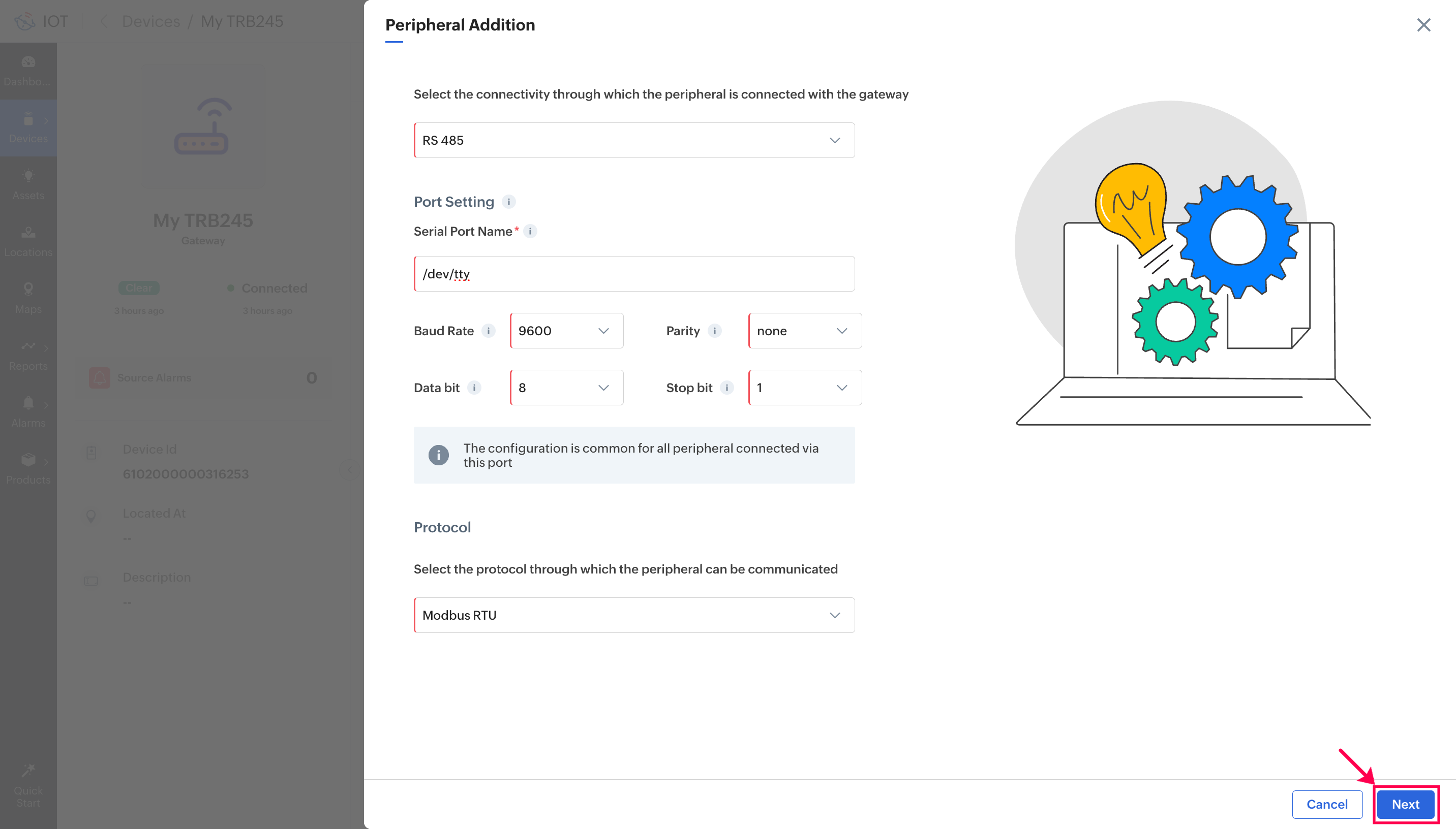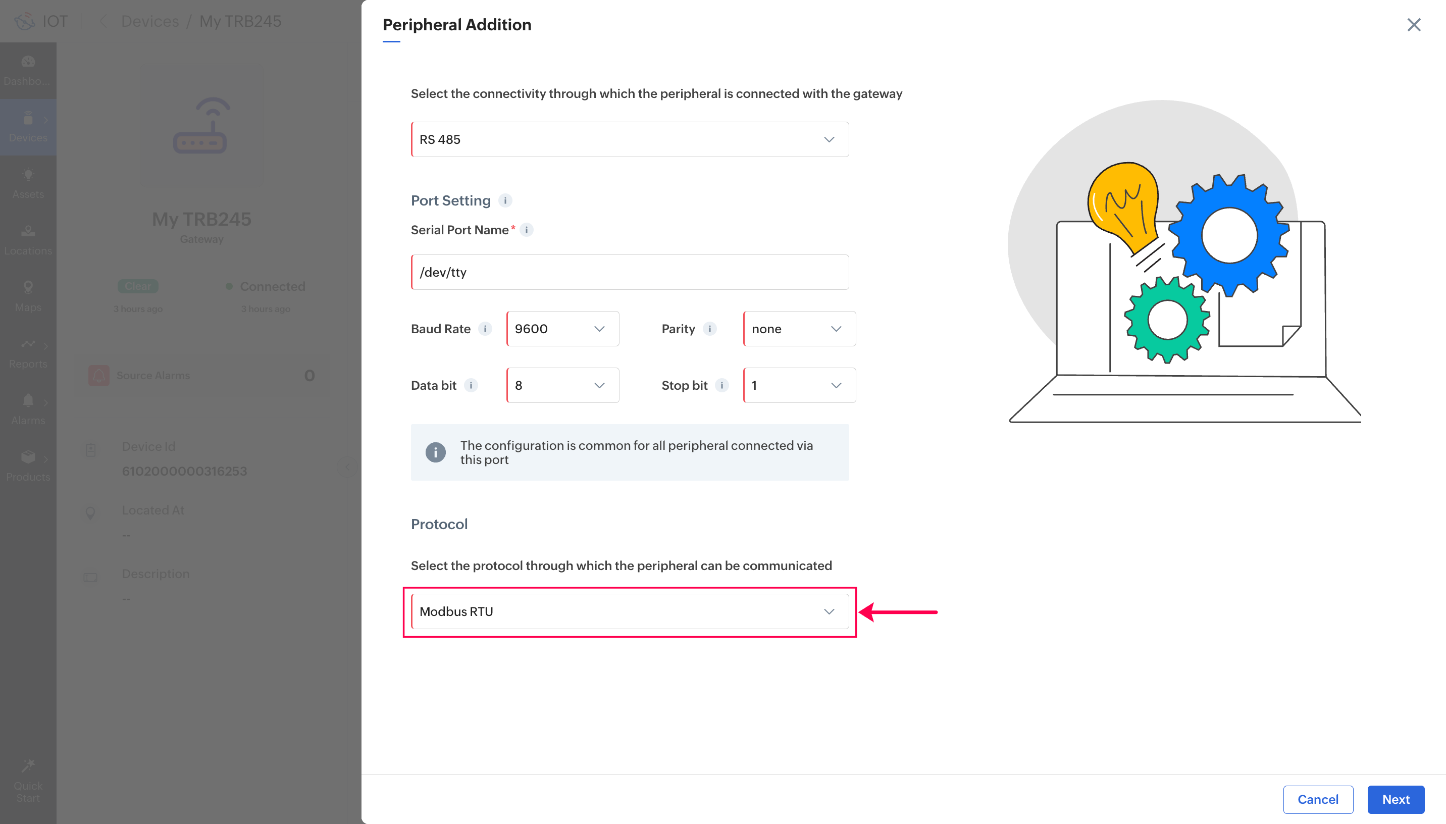 10. Select Modbus RTU as the protocol used for communication between the gateway and the peripheral.