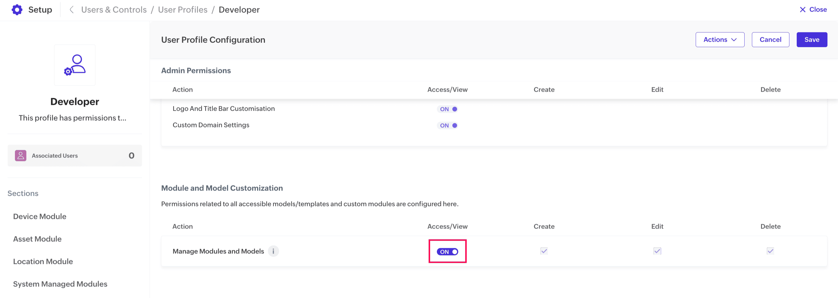 To add an instance specific monitor and control module (datapoints, commands, and alarm rules) to any managed entity (device, asset, or location) in the Zoho IOT application, users must have the same profile permissions as required for a model template with access to the model for which the instance specific monitor and control modules need to be added, along with the following permissions.