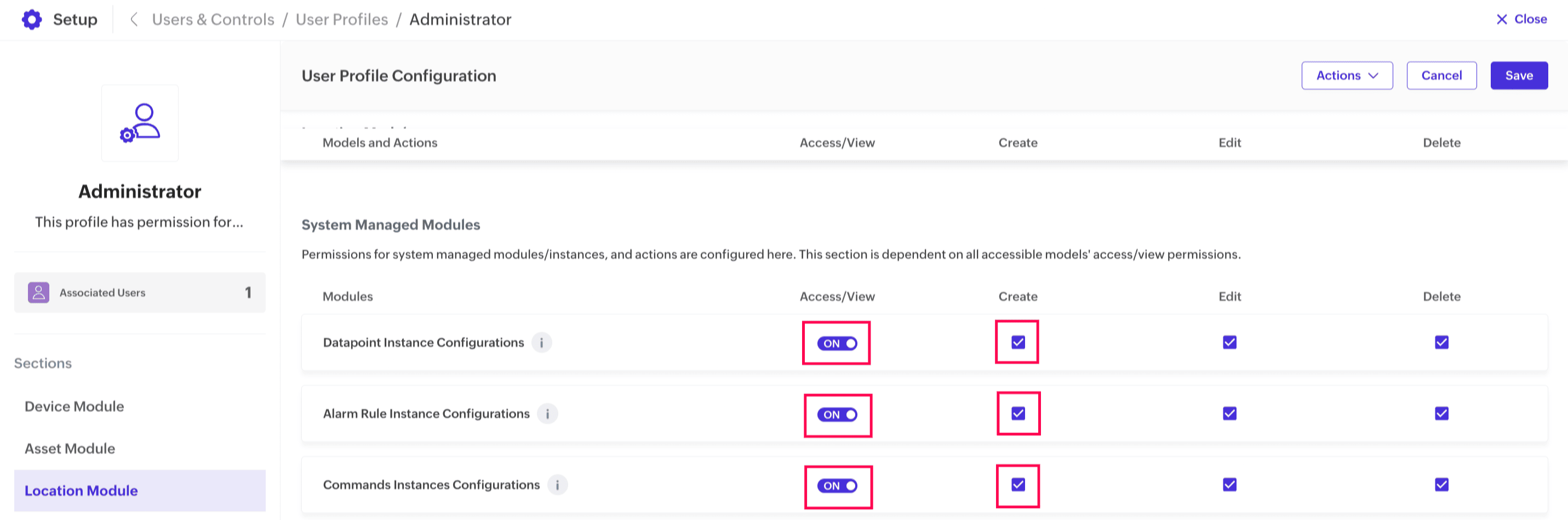 • Access/View for Datapoint, Command, or Alarm Rule configuration under the system module must be enabled with the Create/Edit/Delete permission as required.