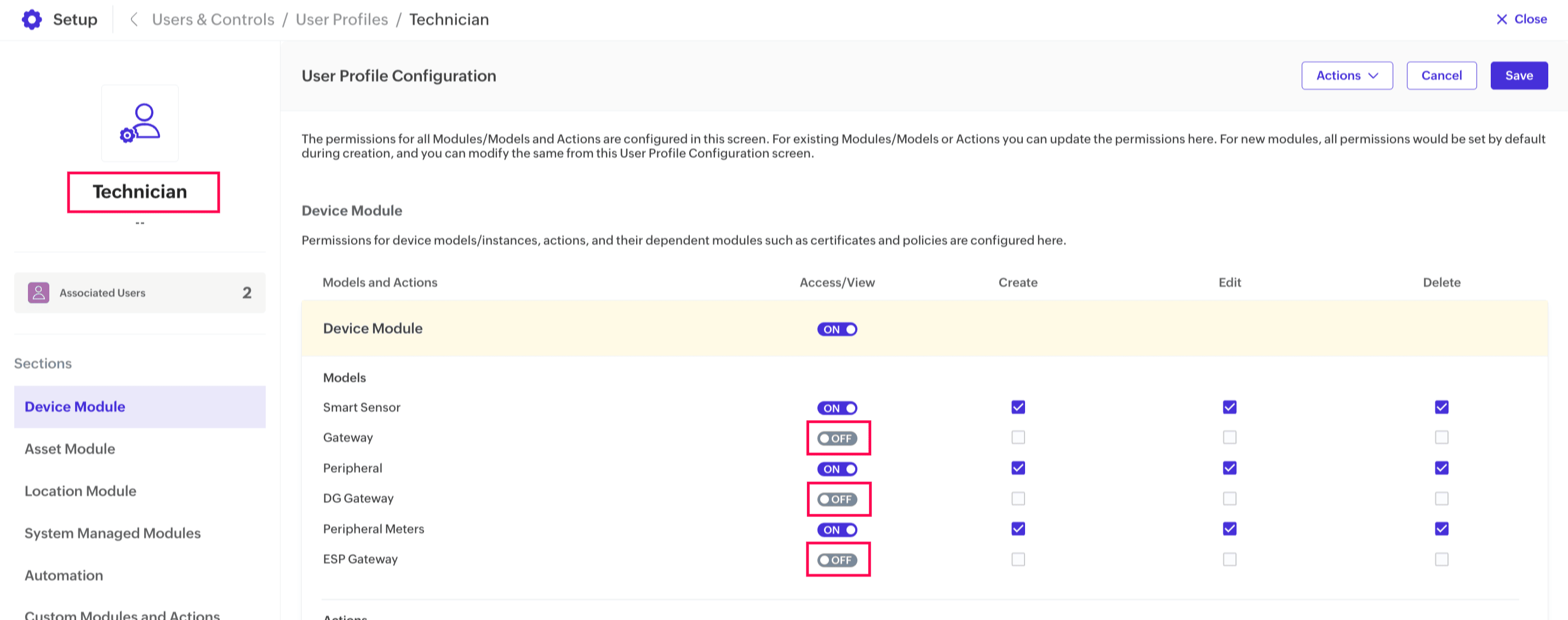 For example in the below displayed profile configuration, the user associated with the technician profile will not be able to add monitor and control templates to the device models Gateway, DG Gateway, and ESP Gateway.