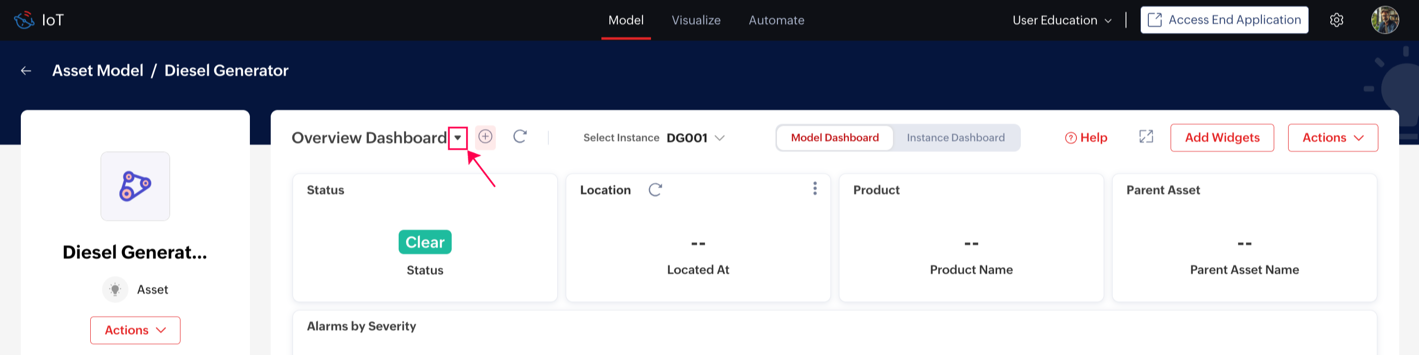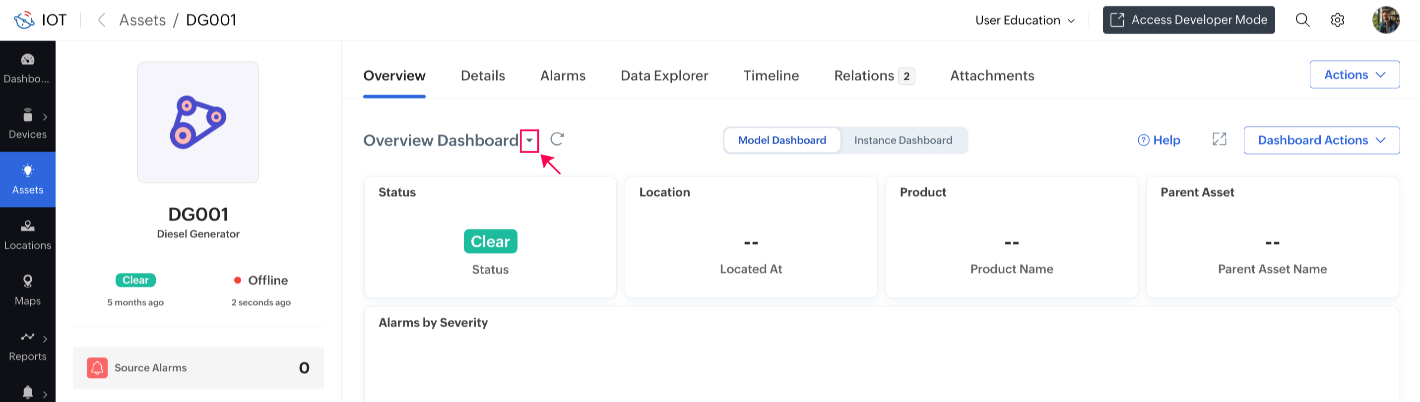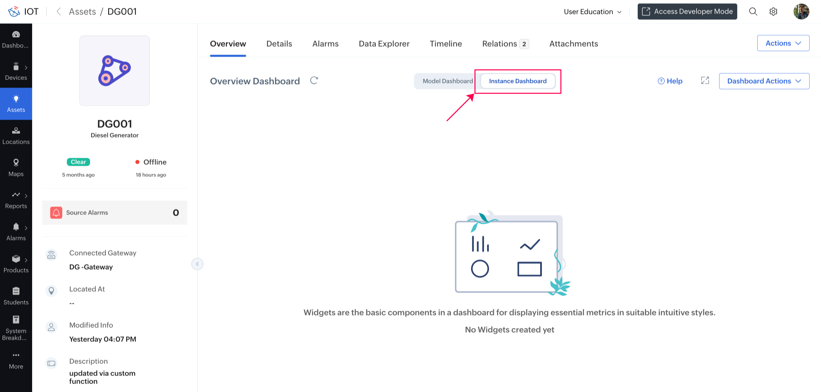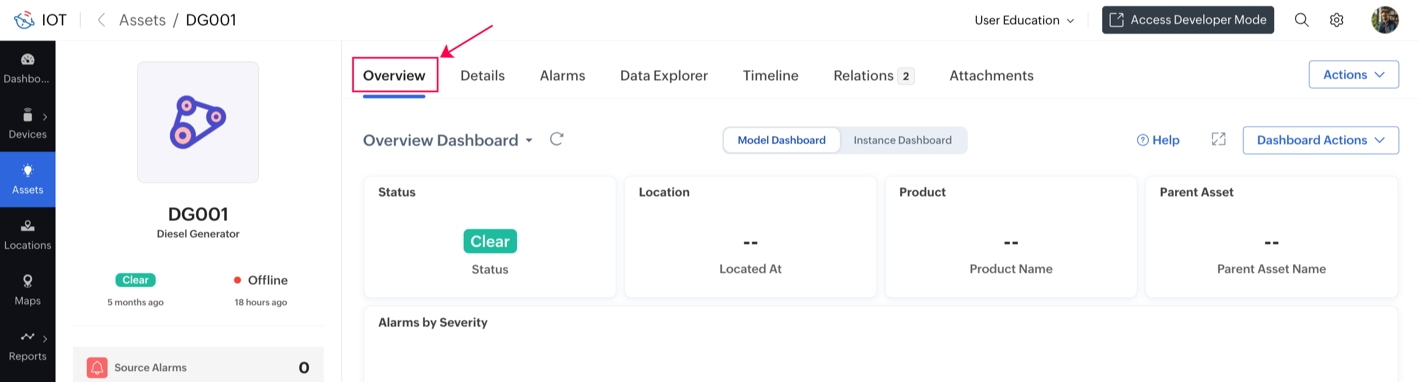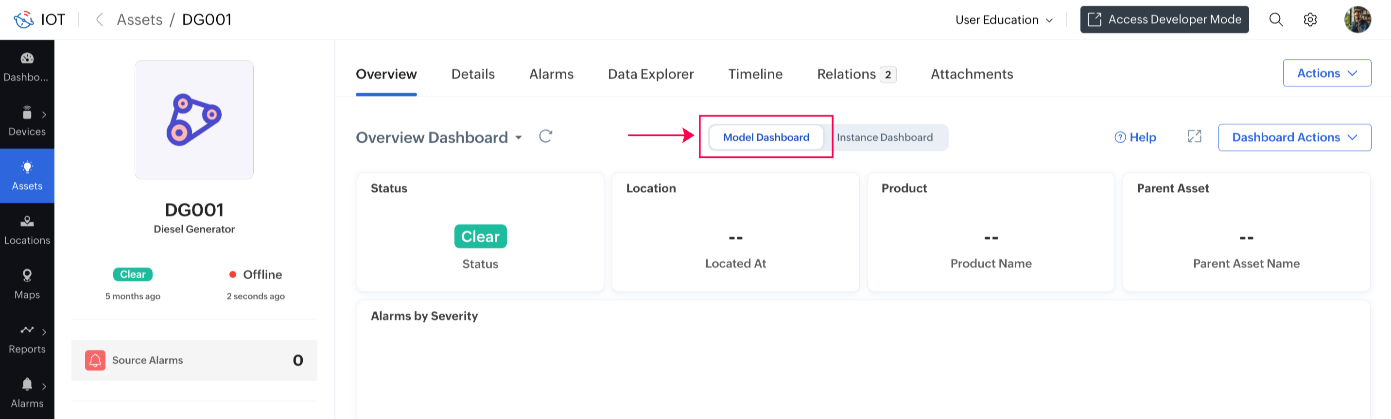 In the Developer Application, go to the model (device, asset, or location) on which the instance is based.For example, to enable the instance dashboard for DG001, access the Diesel Generator asset model in the developer application.