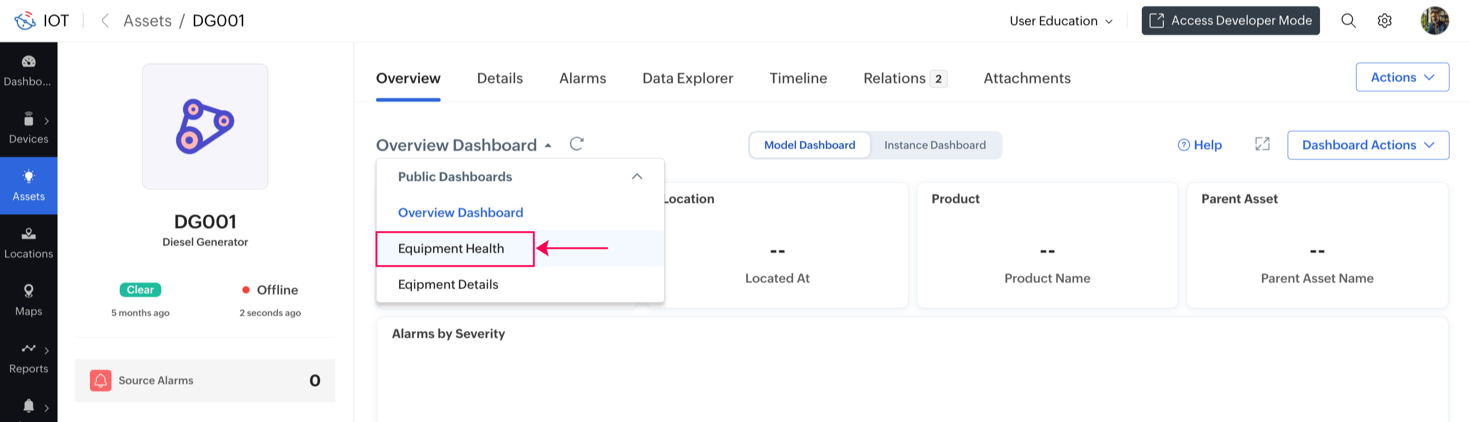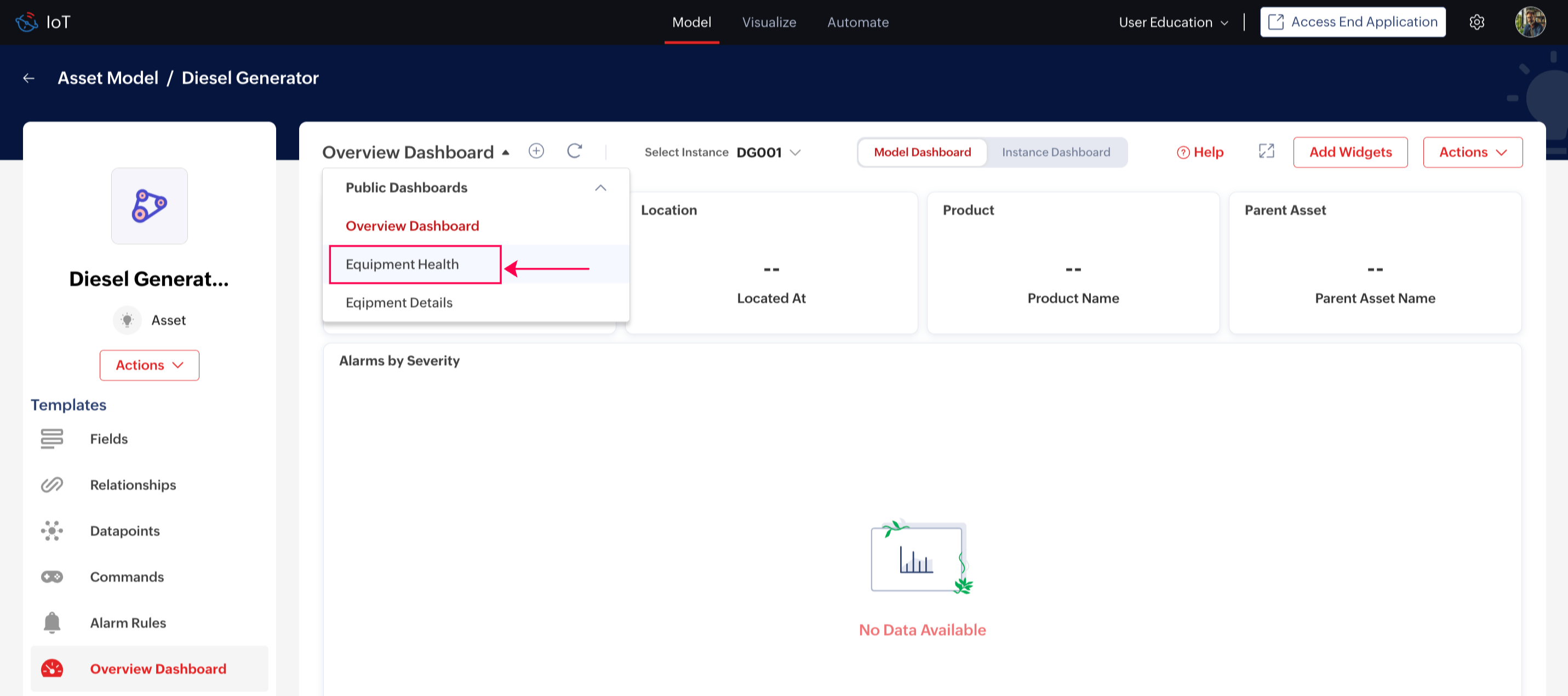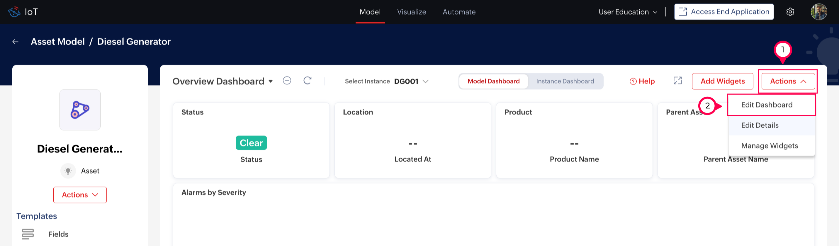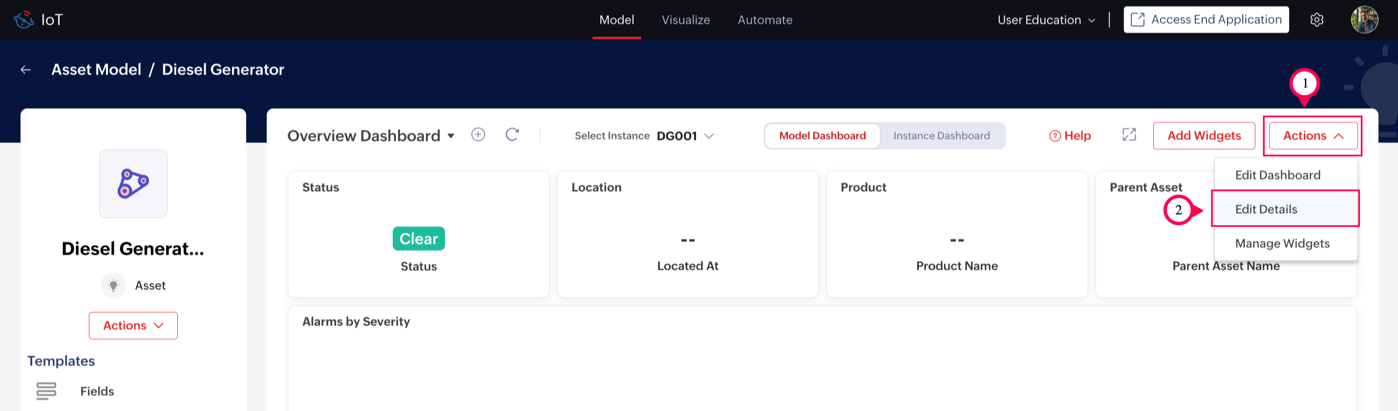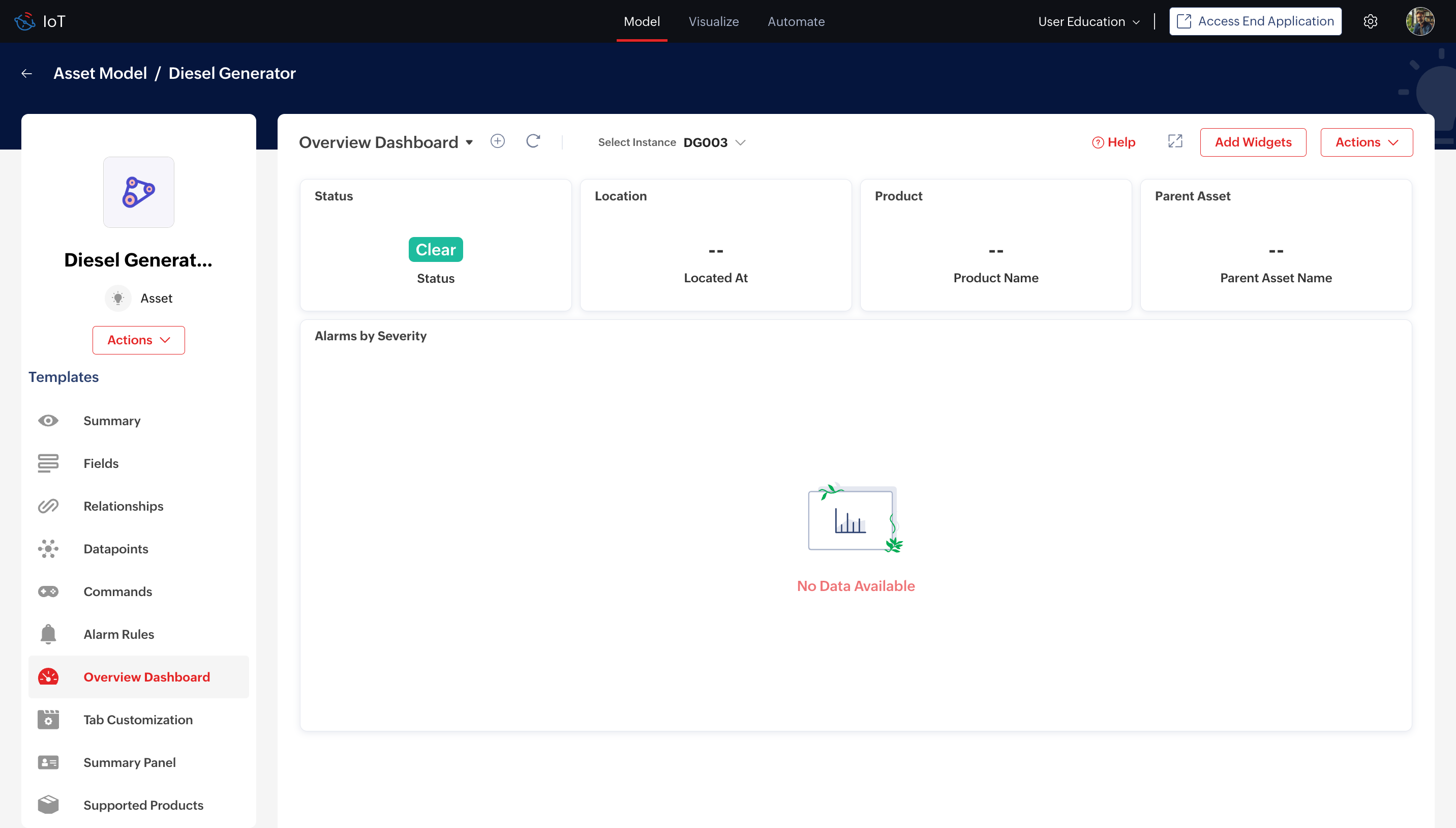 In the Developer Application, go to the model (device, asset, or location) on which the instance is based.For example, to enable the instance dashboard for DG001, access the Diesel Generator asset model in the developer application.
