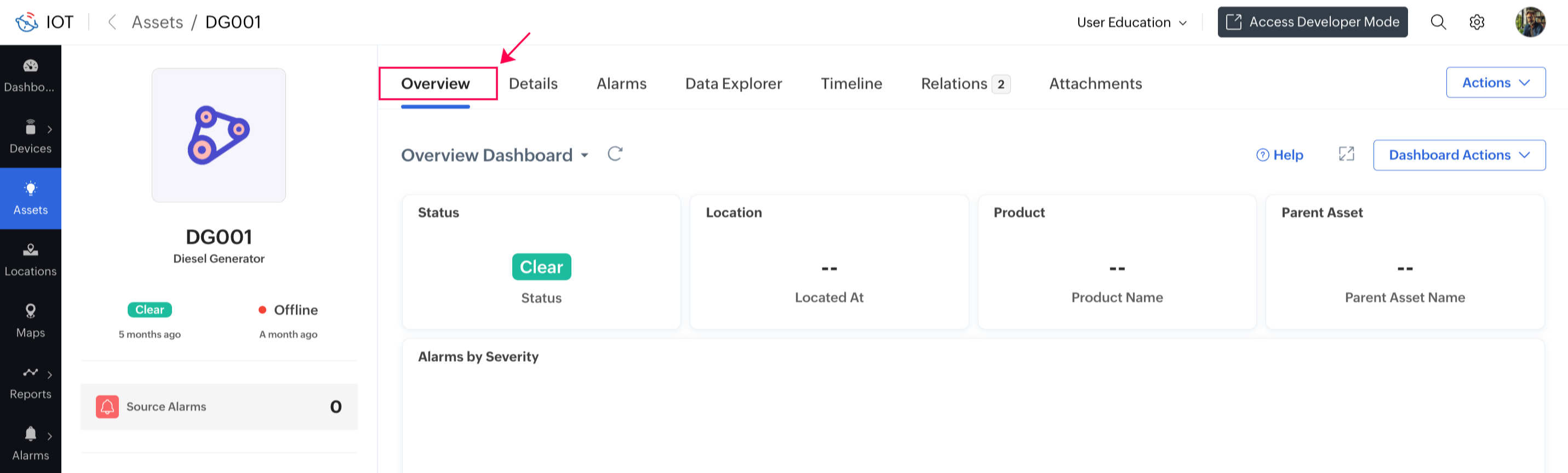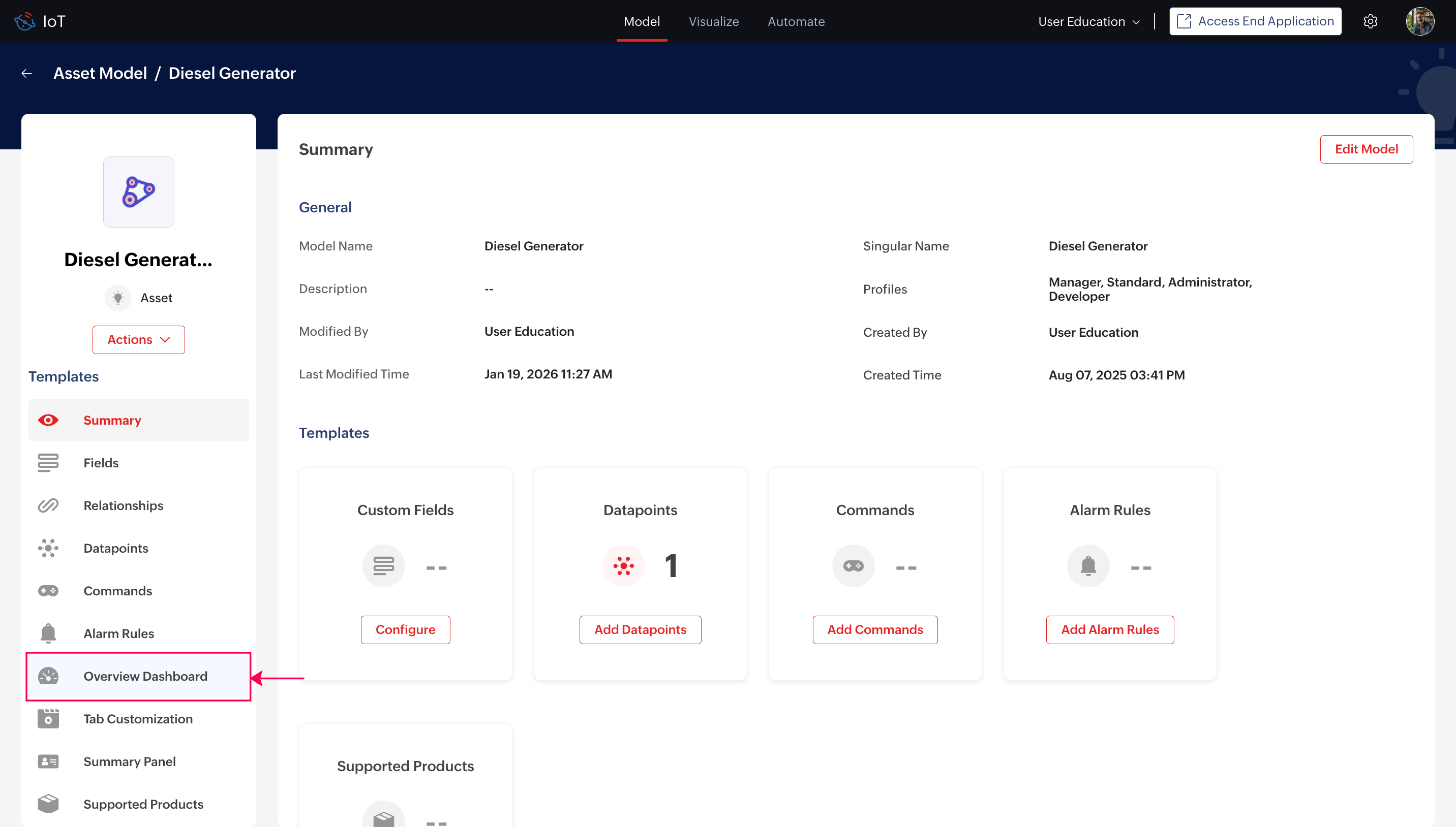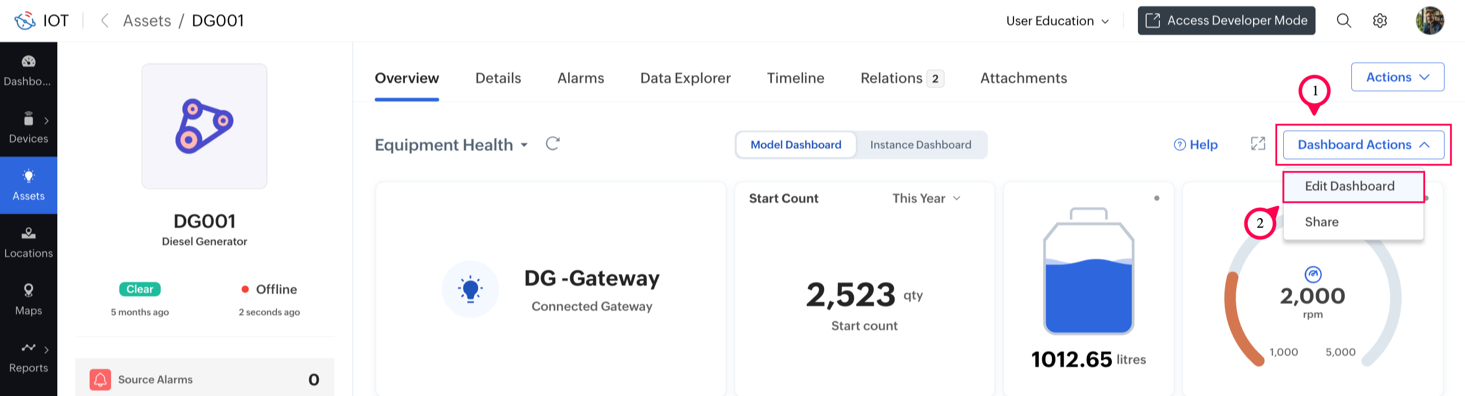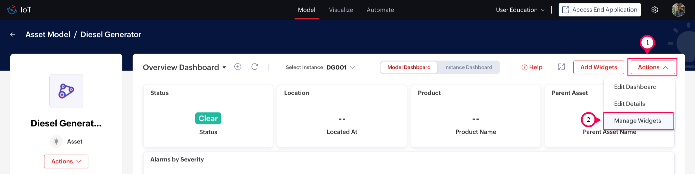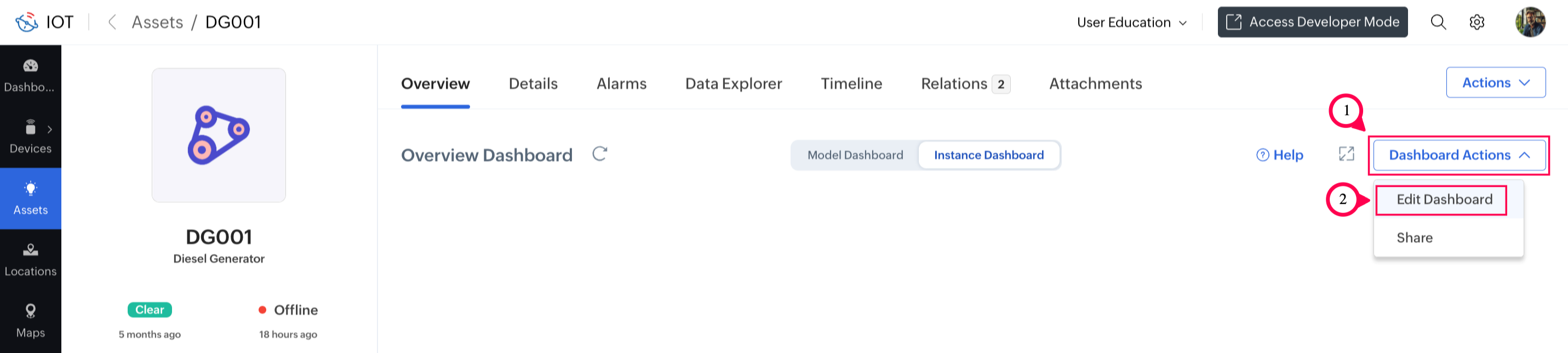 In the Developer Application, go to the model (device, asset, or location) on which the instance is based.For example, to enable the instance dashboard for DG001, access the Diesel Generator asset model in the developer application.