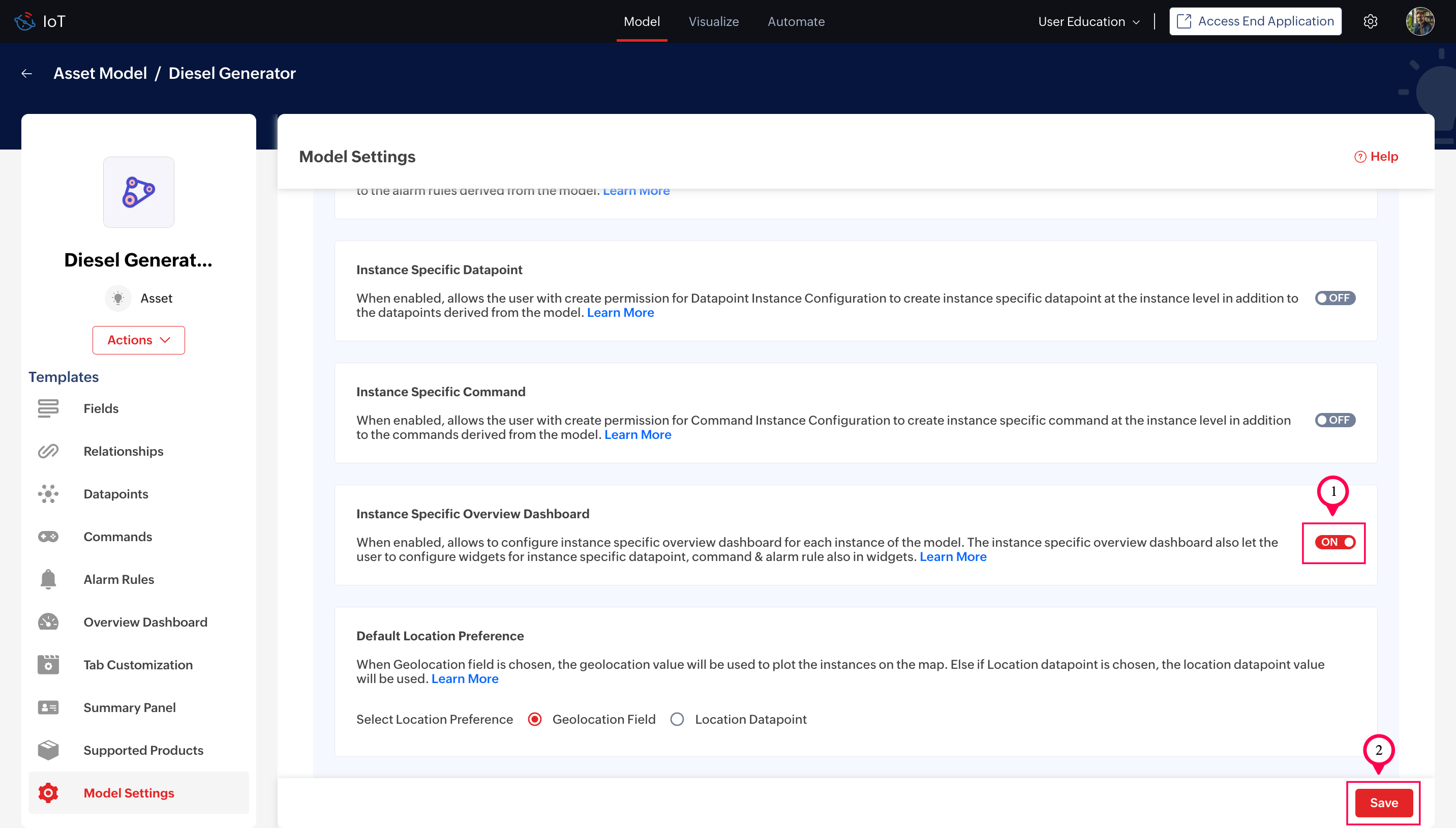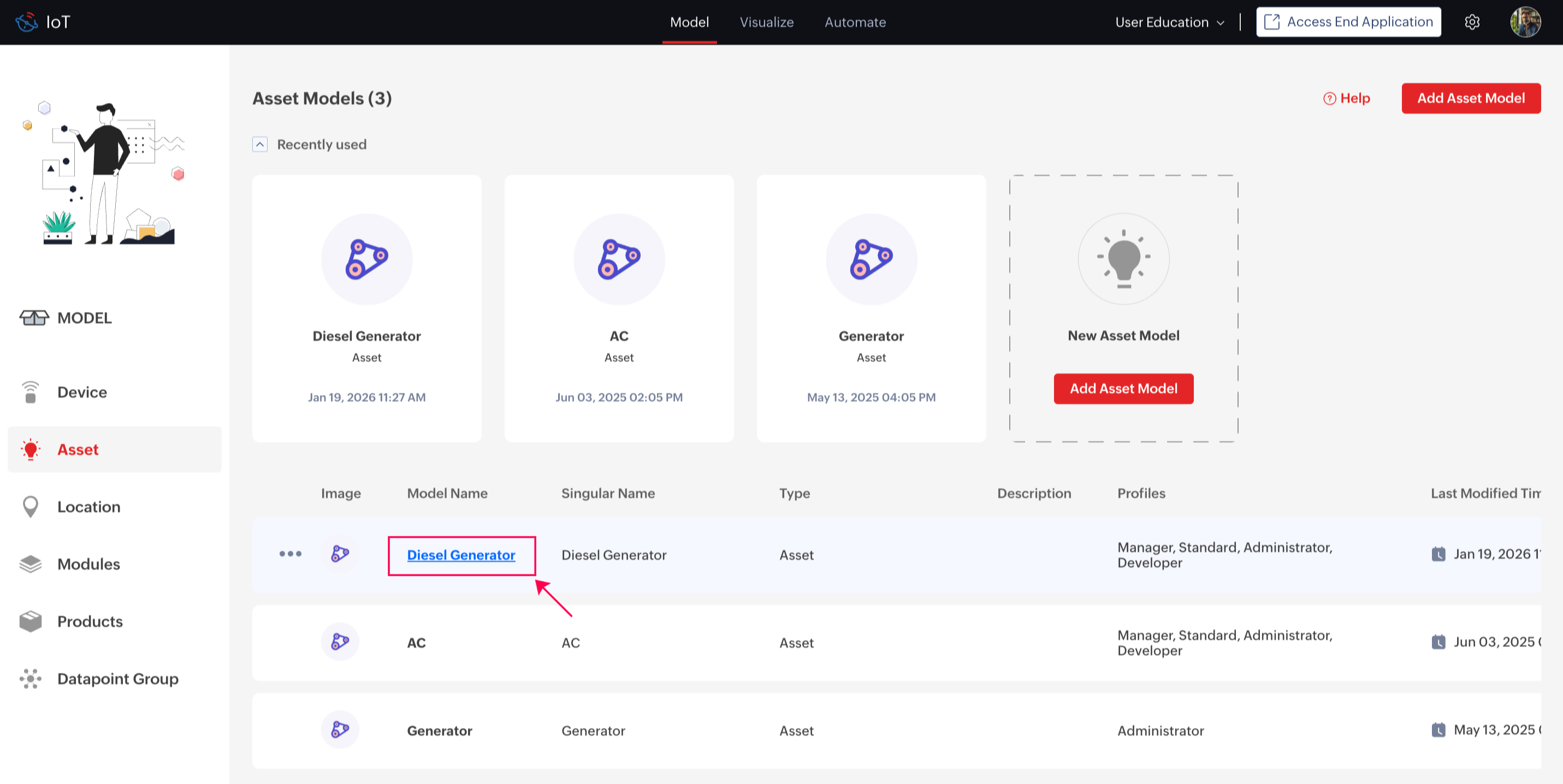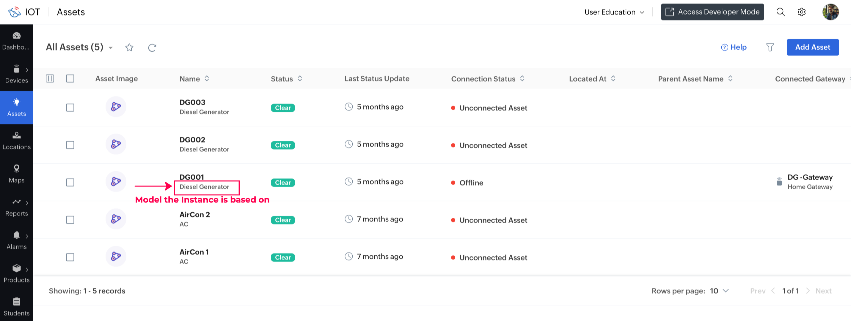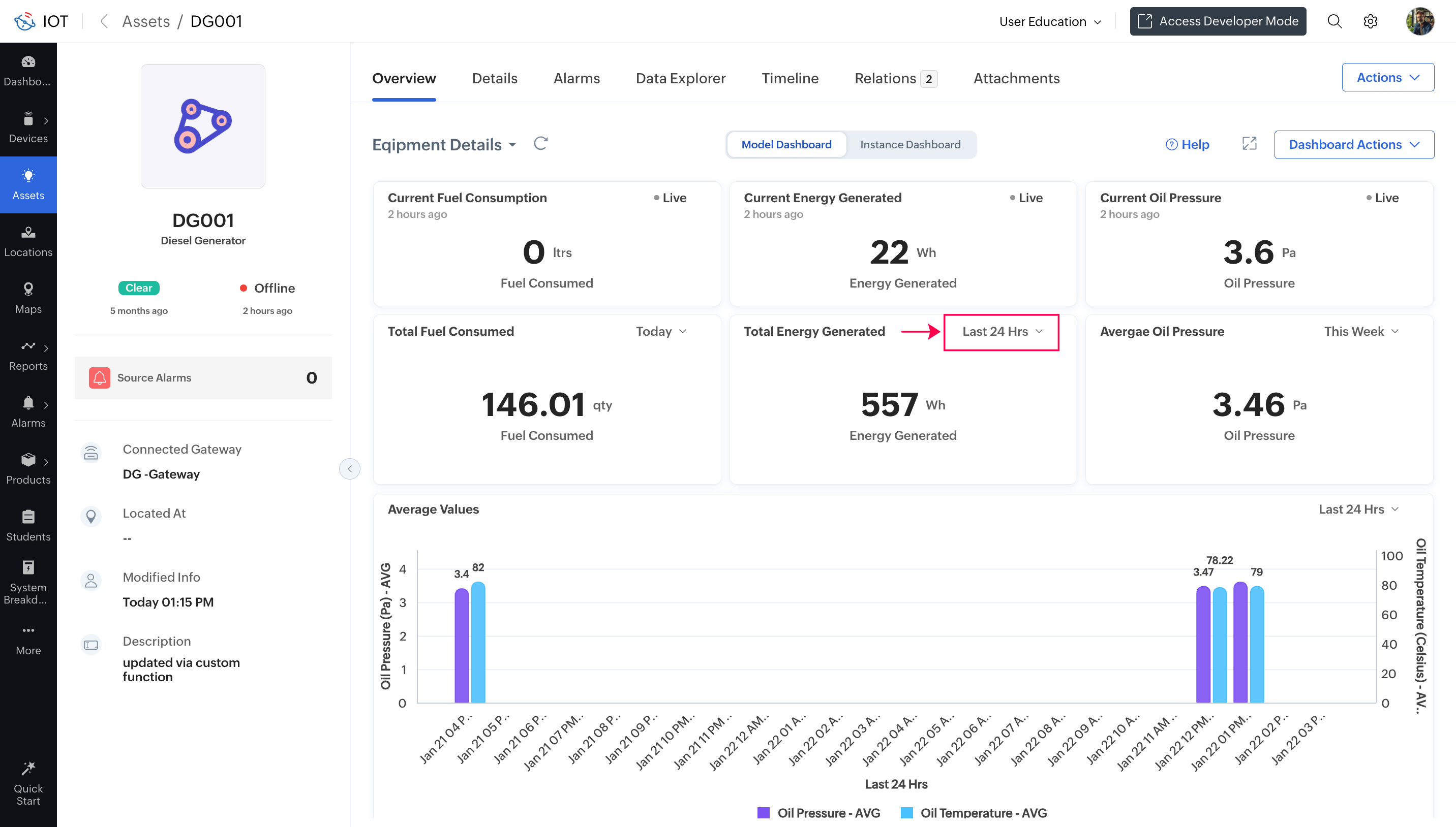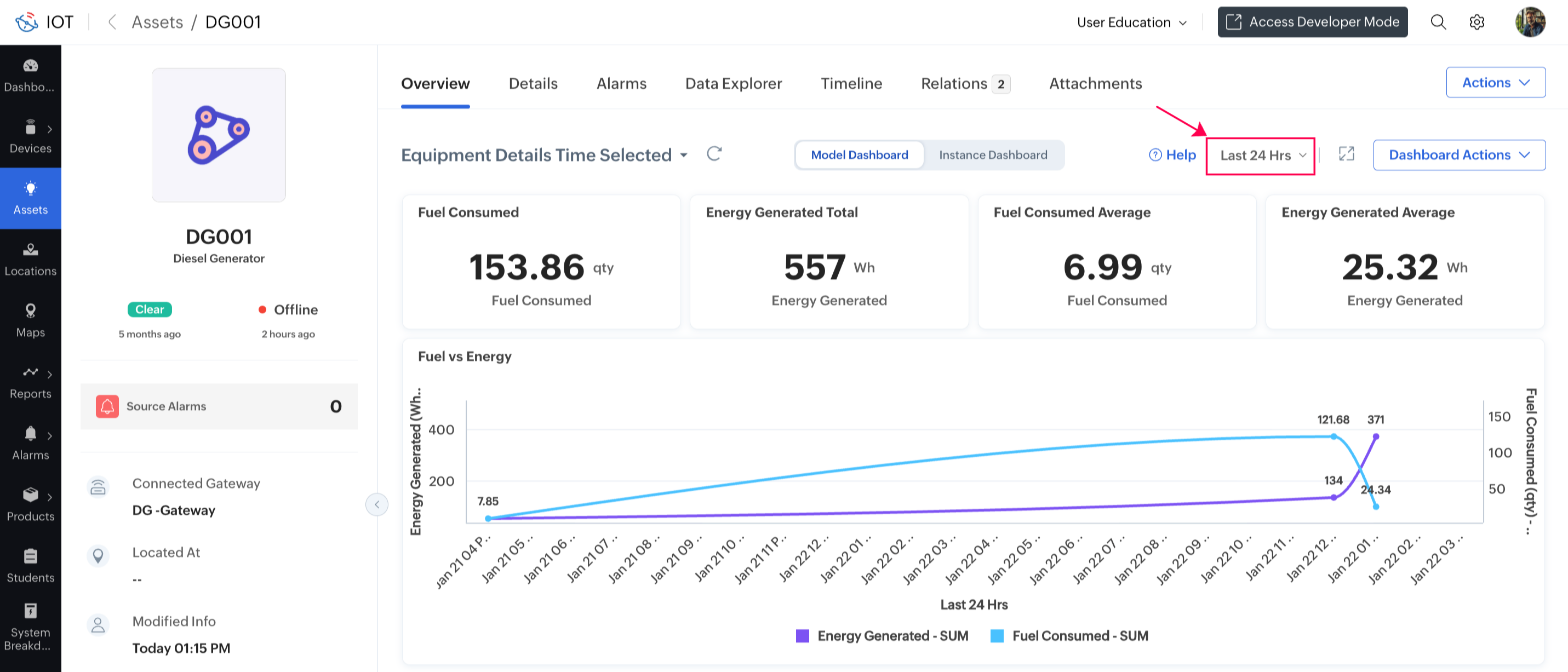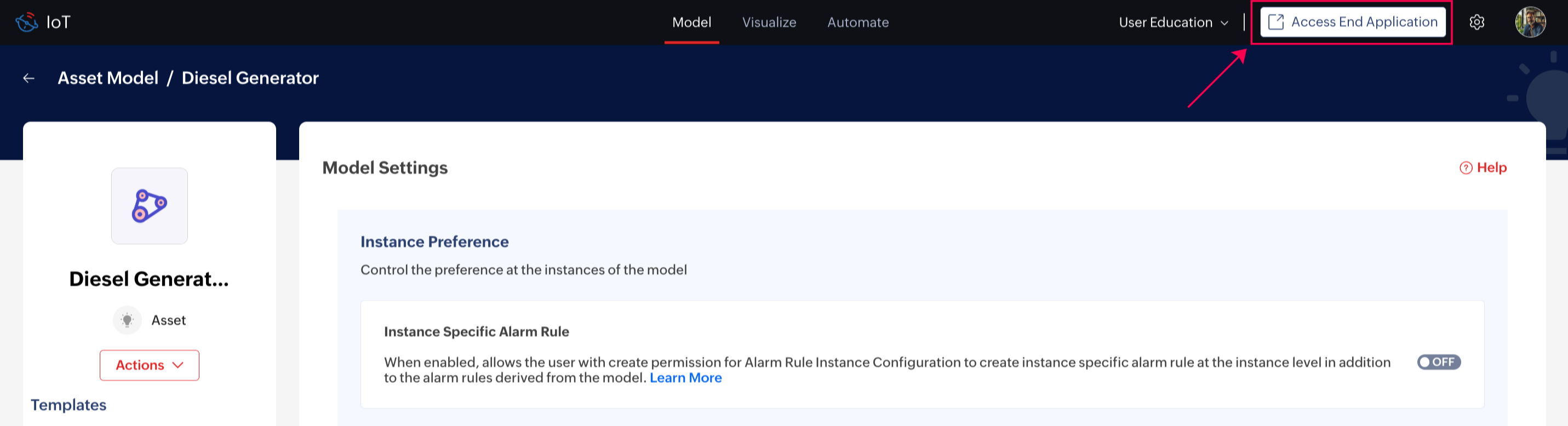 In the Developer Application, go to the model (device, asset, or location) on which the instance is based.For example, to enable the instance dashboard for DG001, access the Diesel Generator asset model in the developer application.