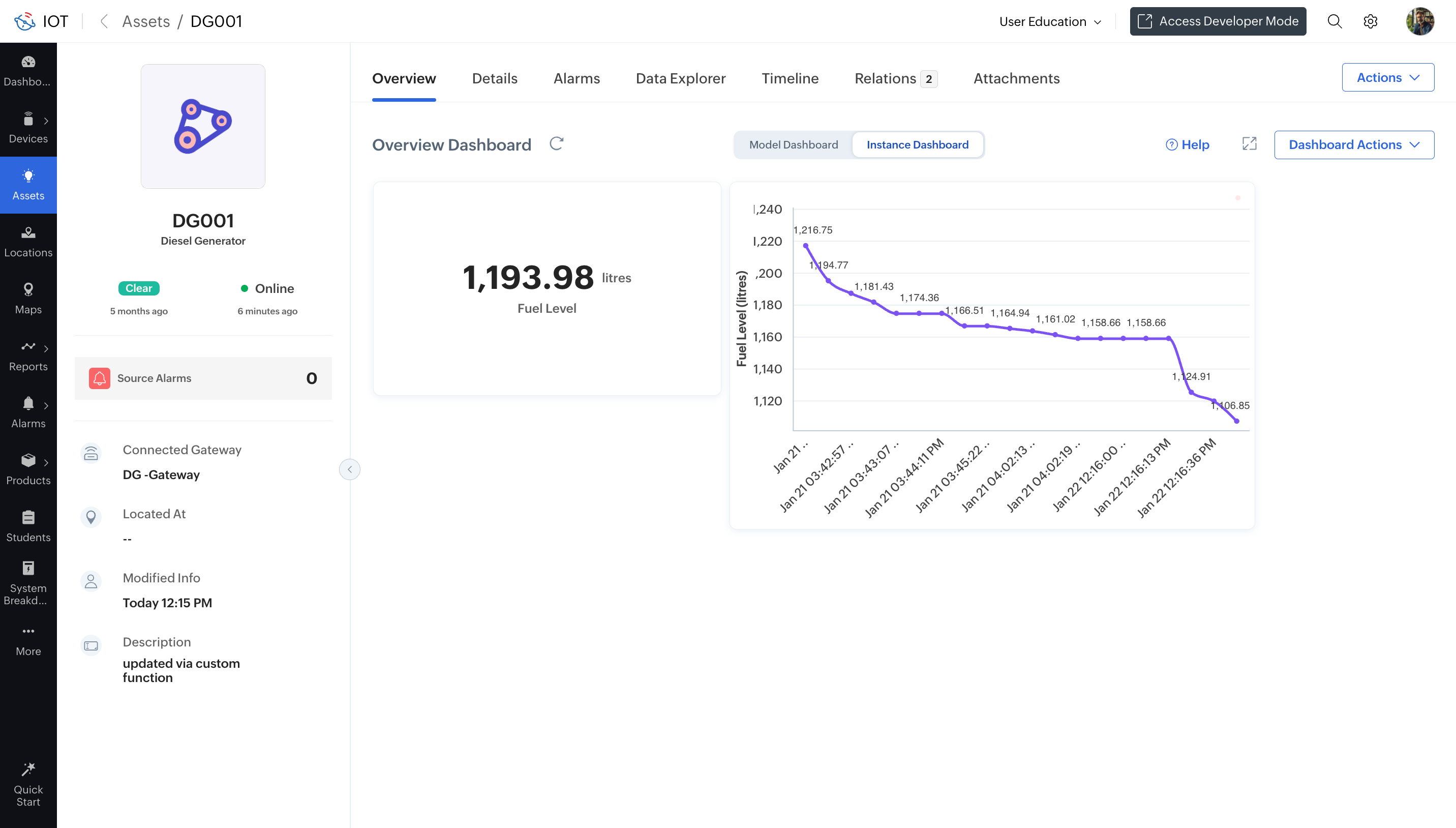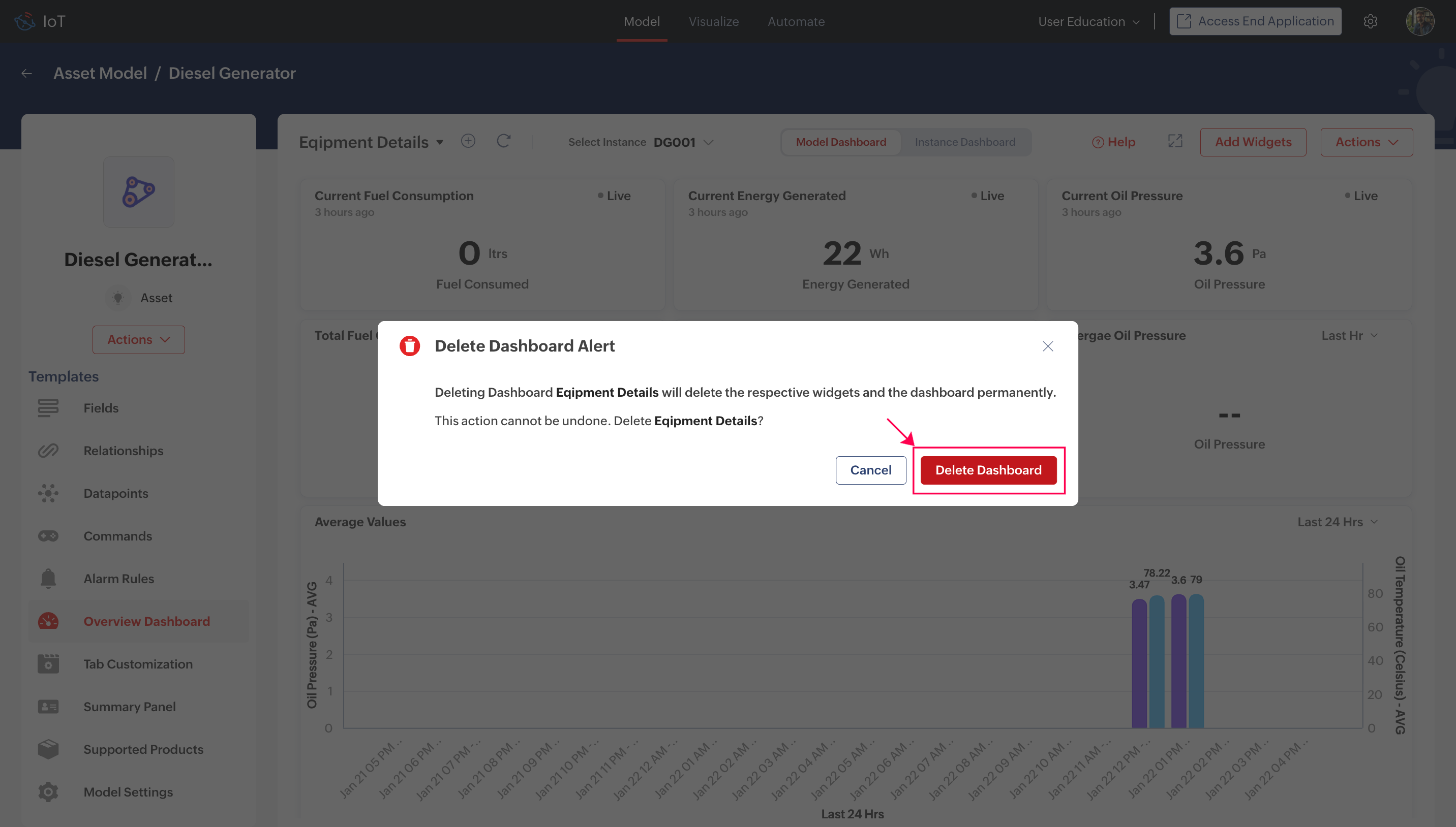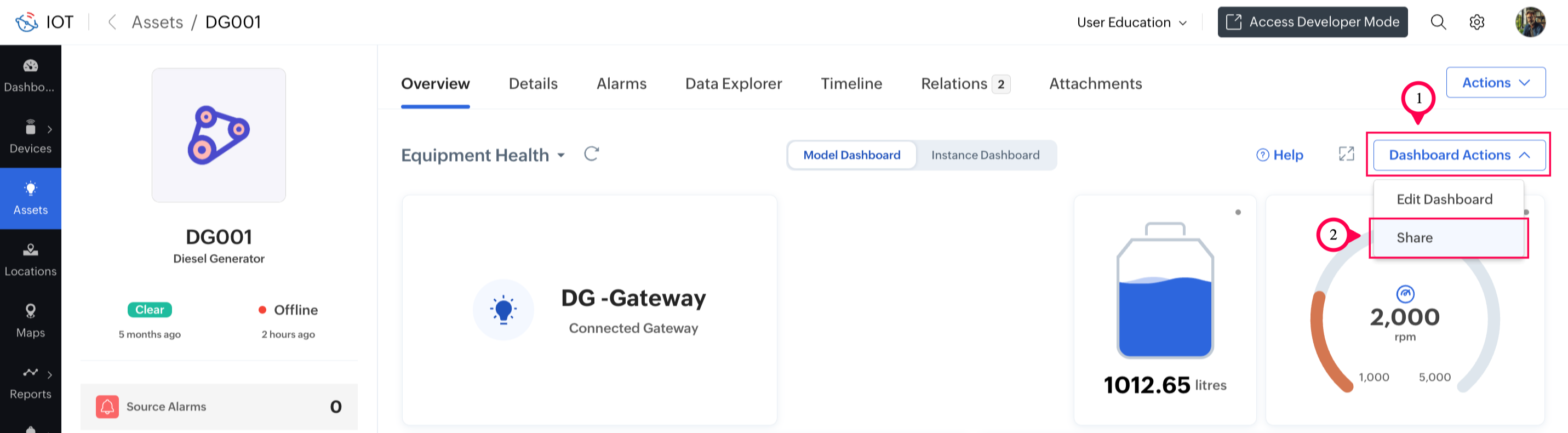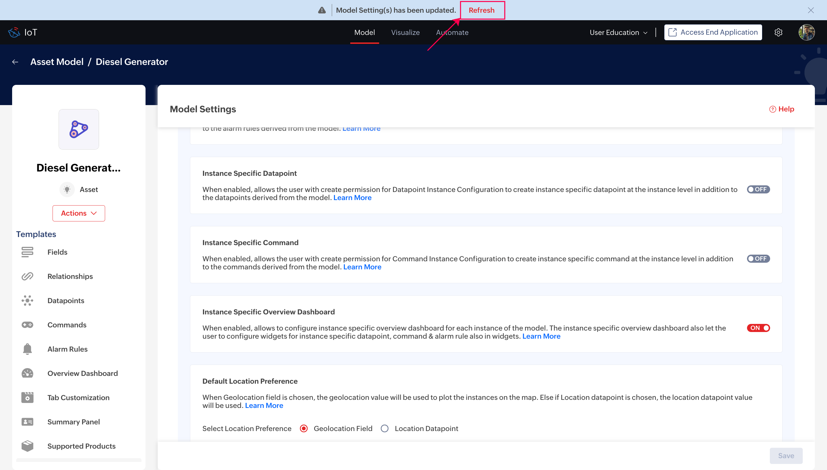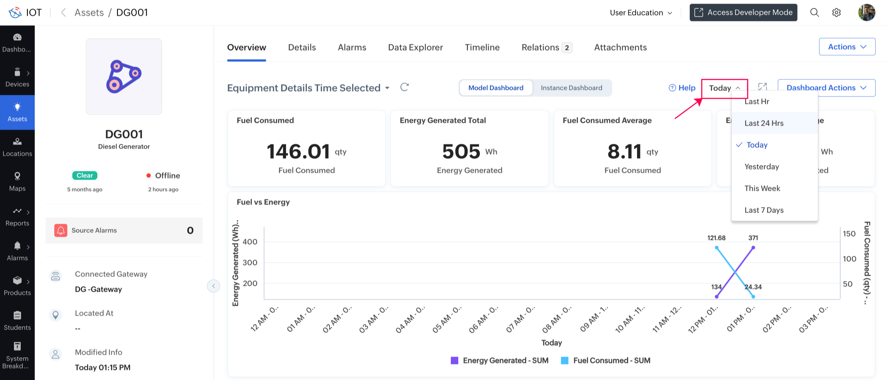 In the Developer Application, go to the model (device, asset, or location) on which the instance is based.For example, to enable the instance dashboard for DG001, access the Diesel Generator asset model in the developer application.