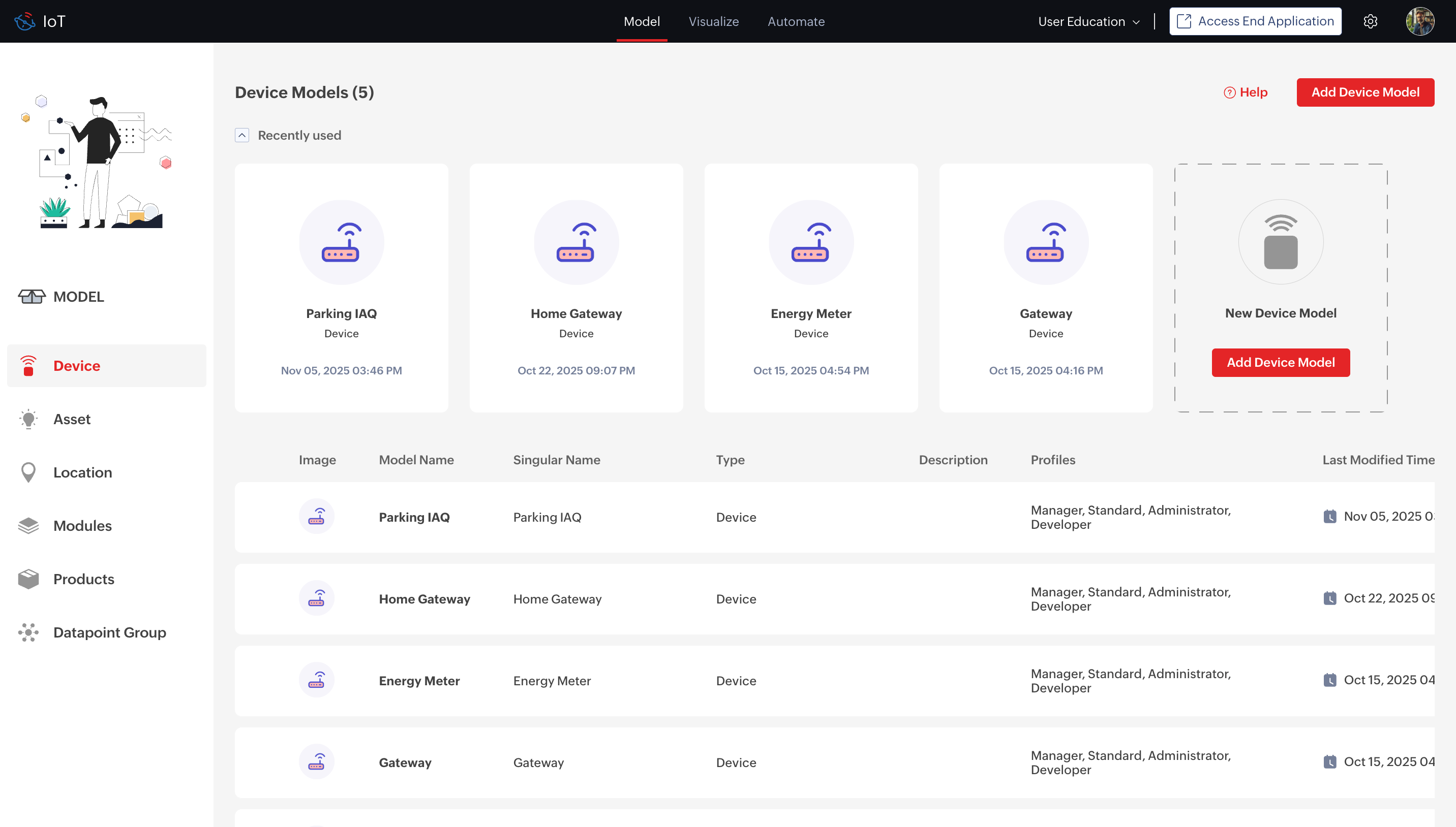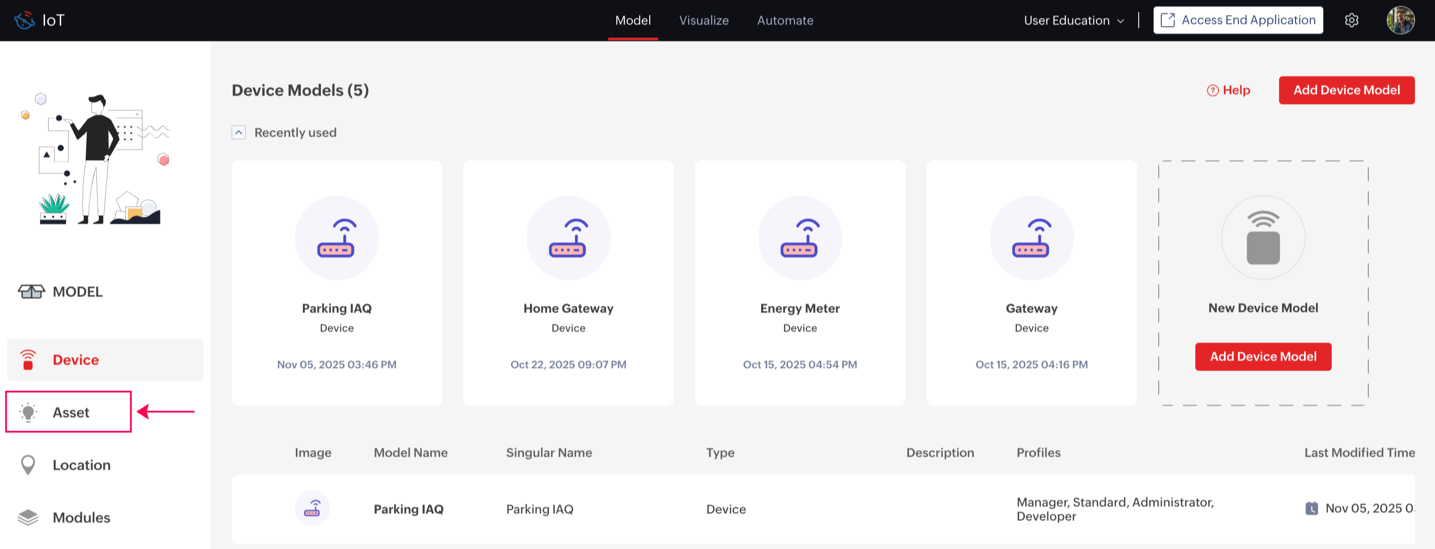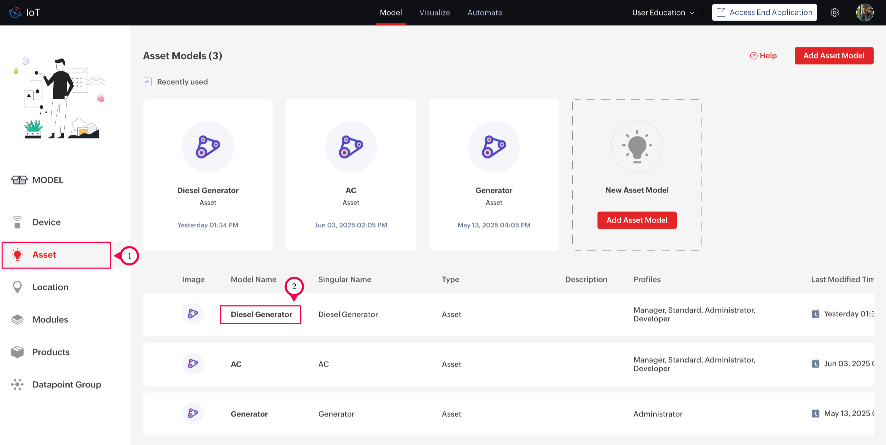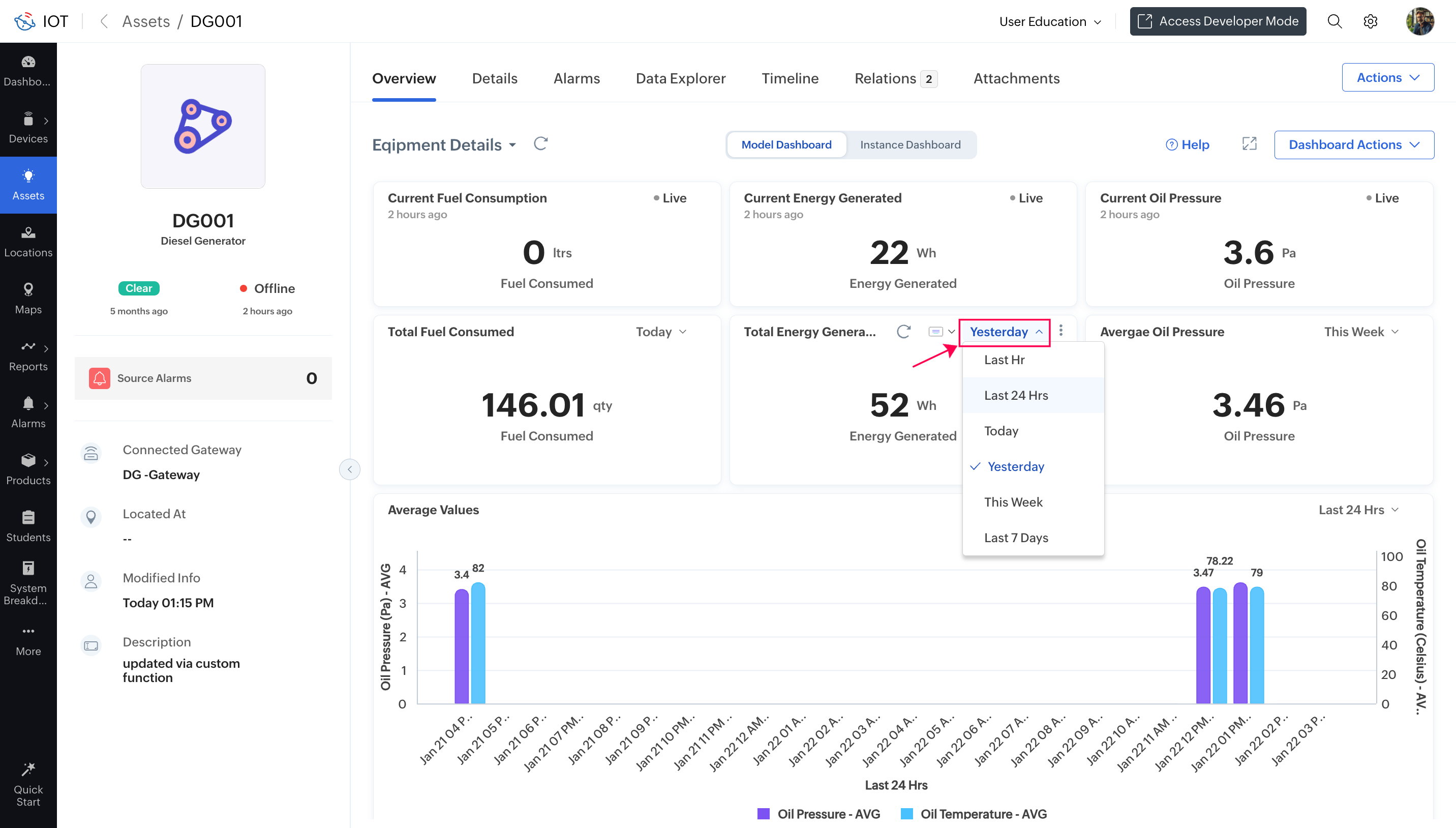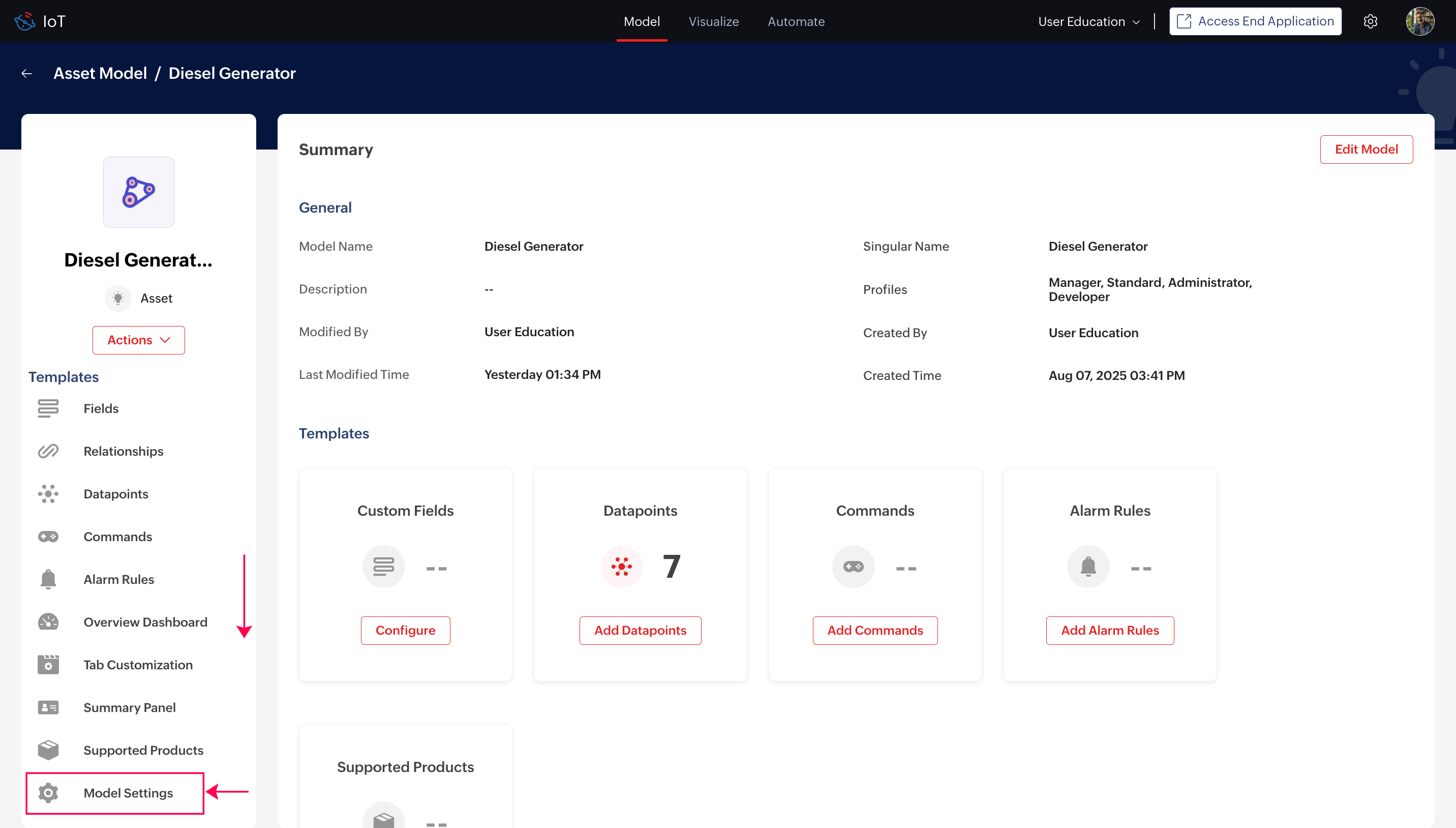 In the Developer Application, go to the model (device, asset, or location) on which the instance is based.For example, to enable the instance dashboard for DG001, access the Diesel Generator asset model in the developer application.