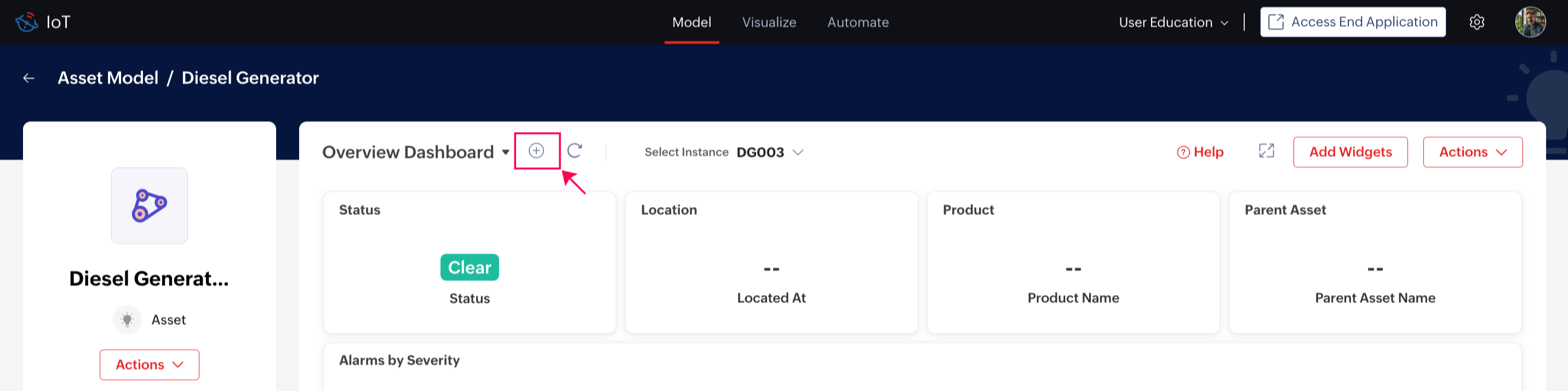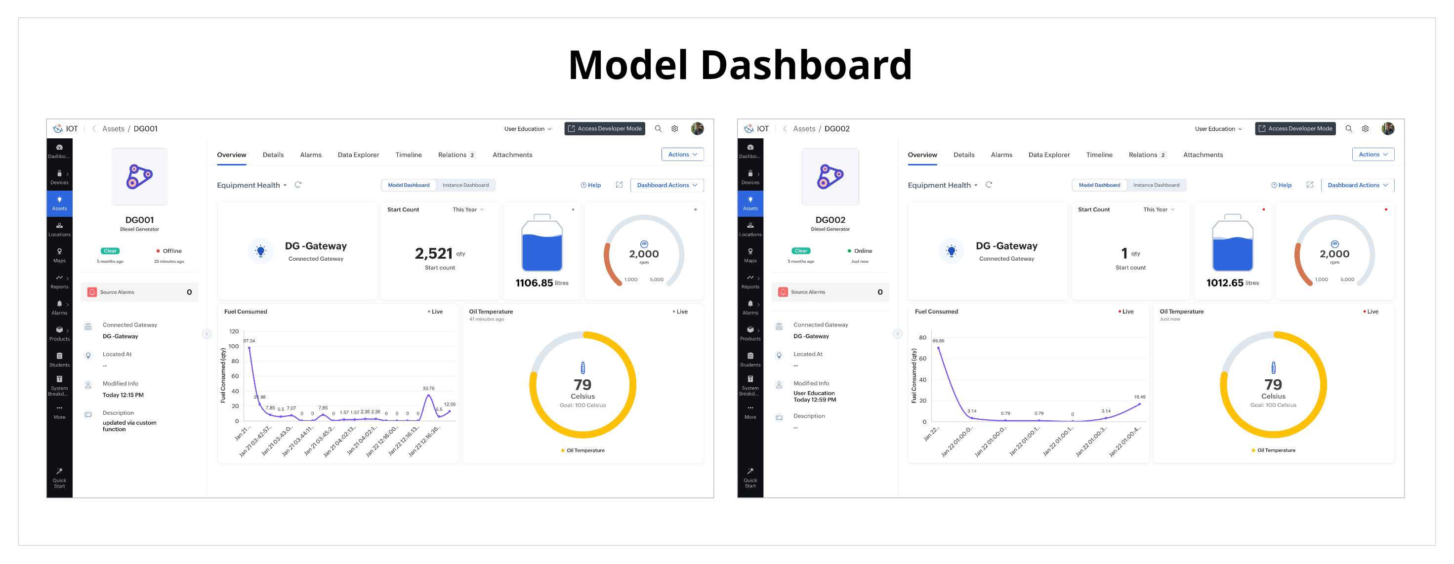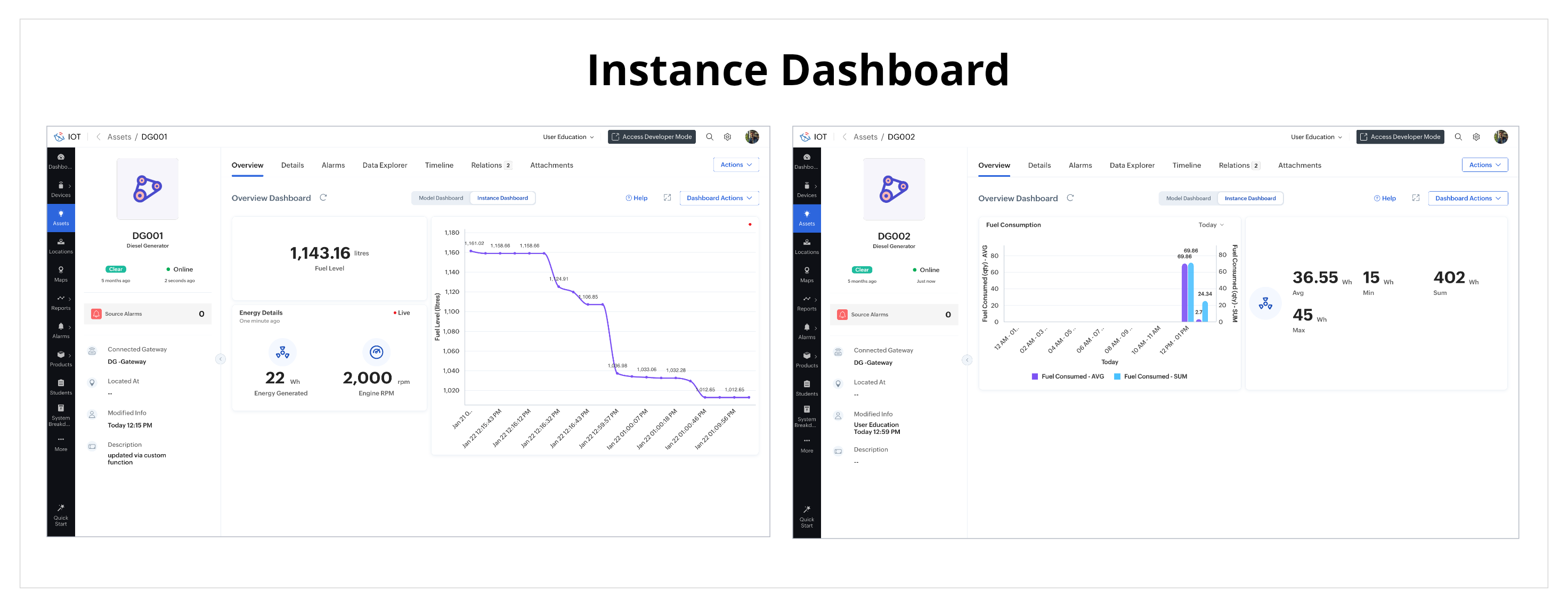 An instance dashboard is available only for a particular device, asset, or location instance and is not added to the model. For example, if a model named Diesel Generator has two instances, DG001 and DG002, the overview dashboard template provides the same set of widgets for each instance, displaying their specific values. In contrast, an instance dashboard for DG001 can include widgets, patterns, and layouts that are unique only to it.