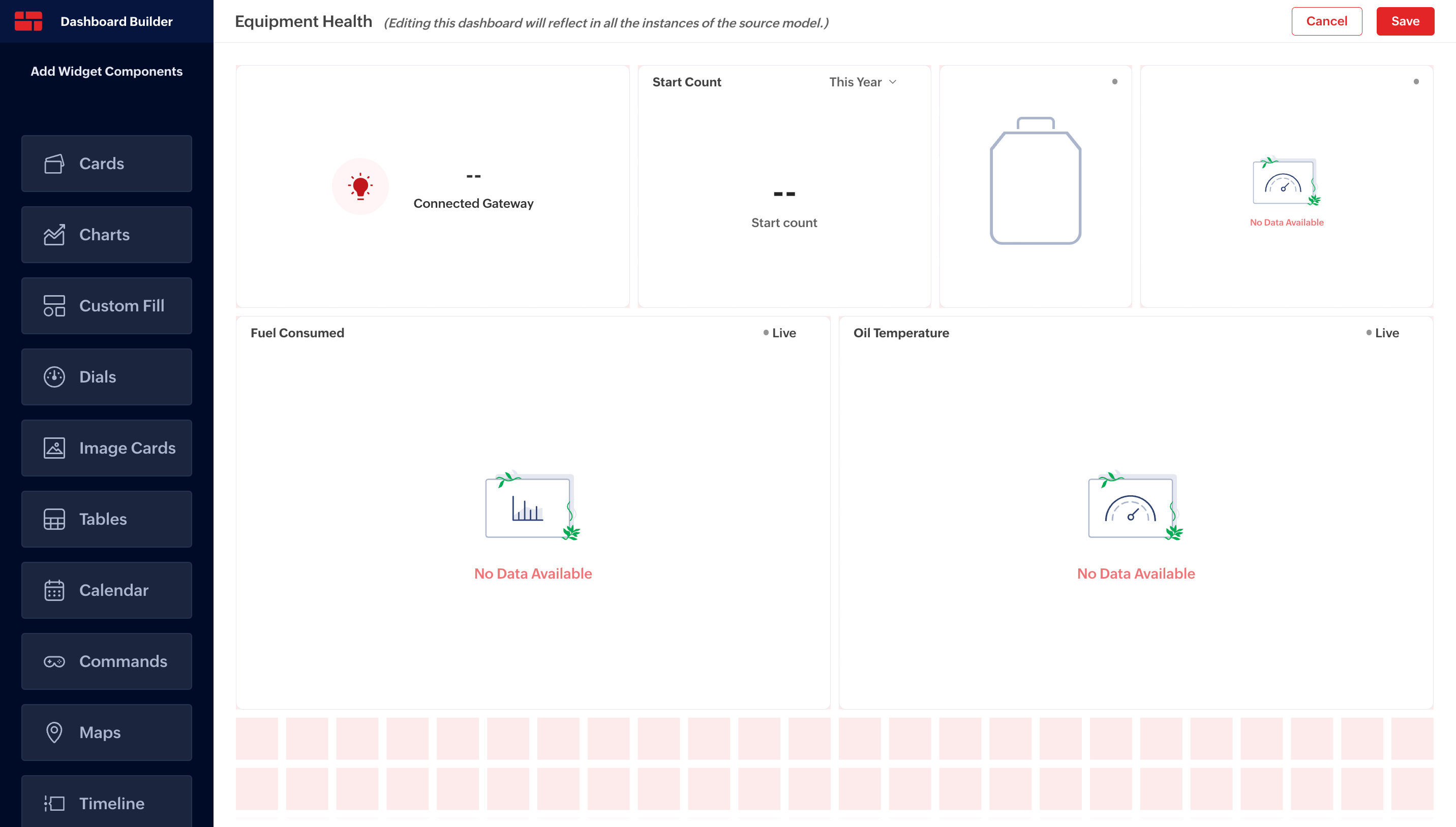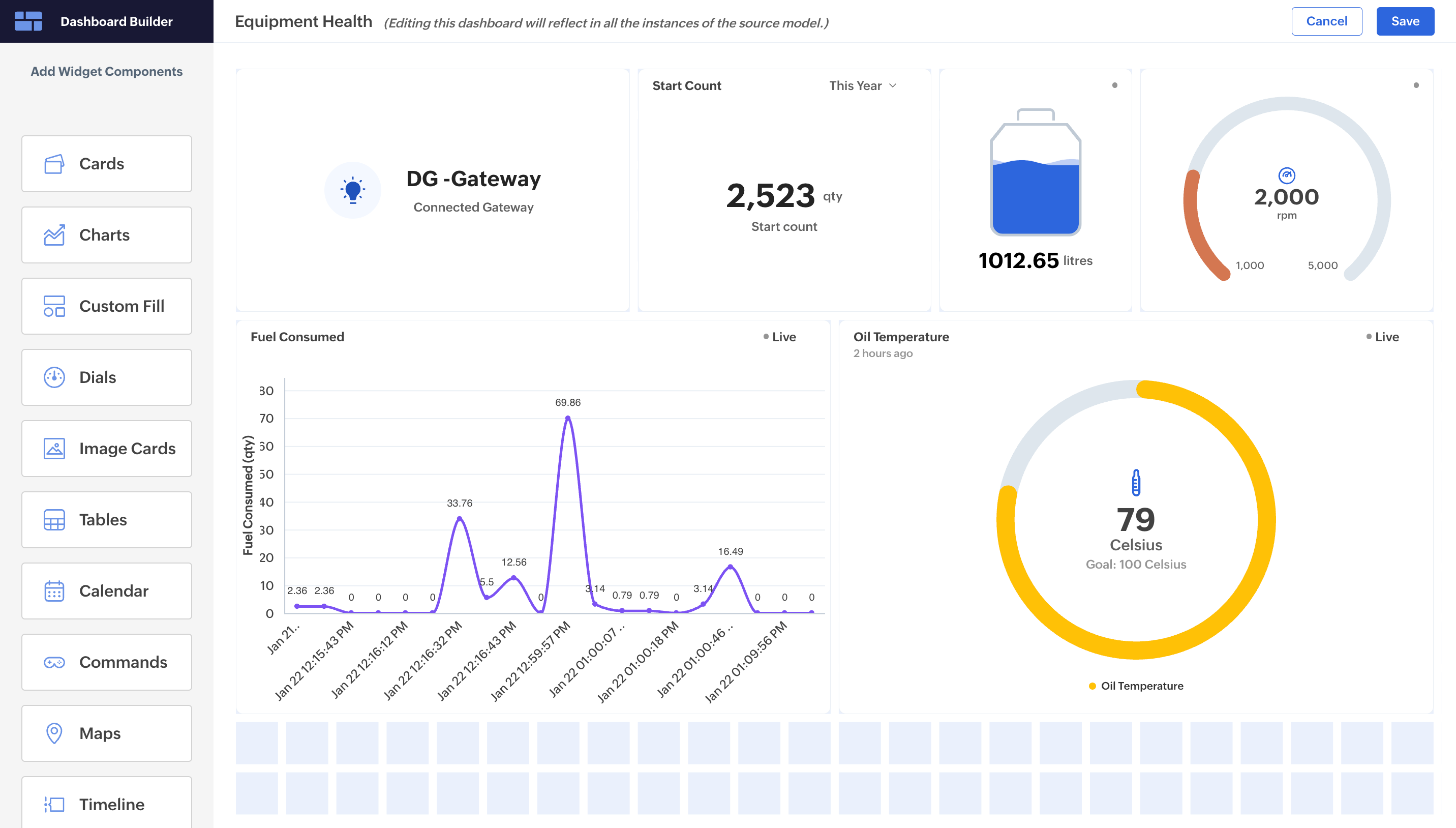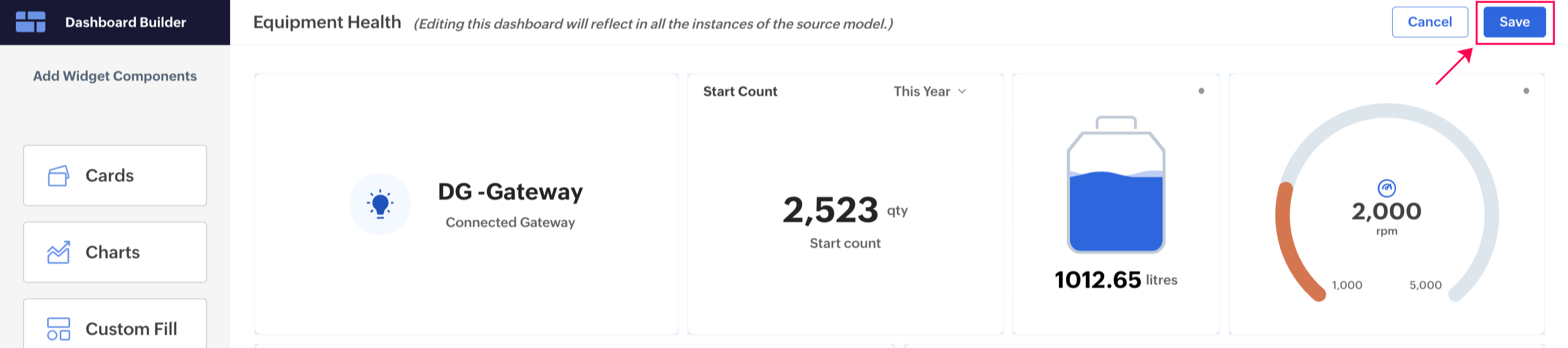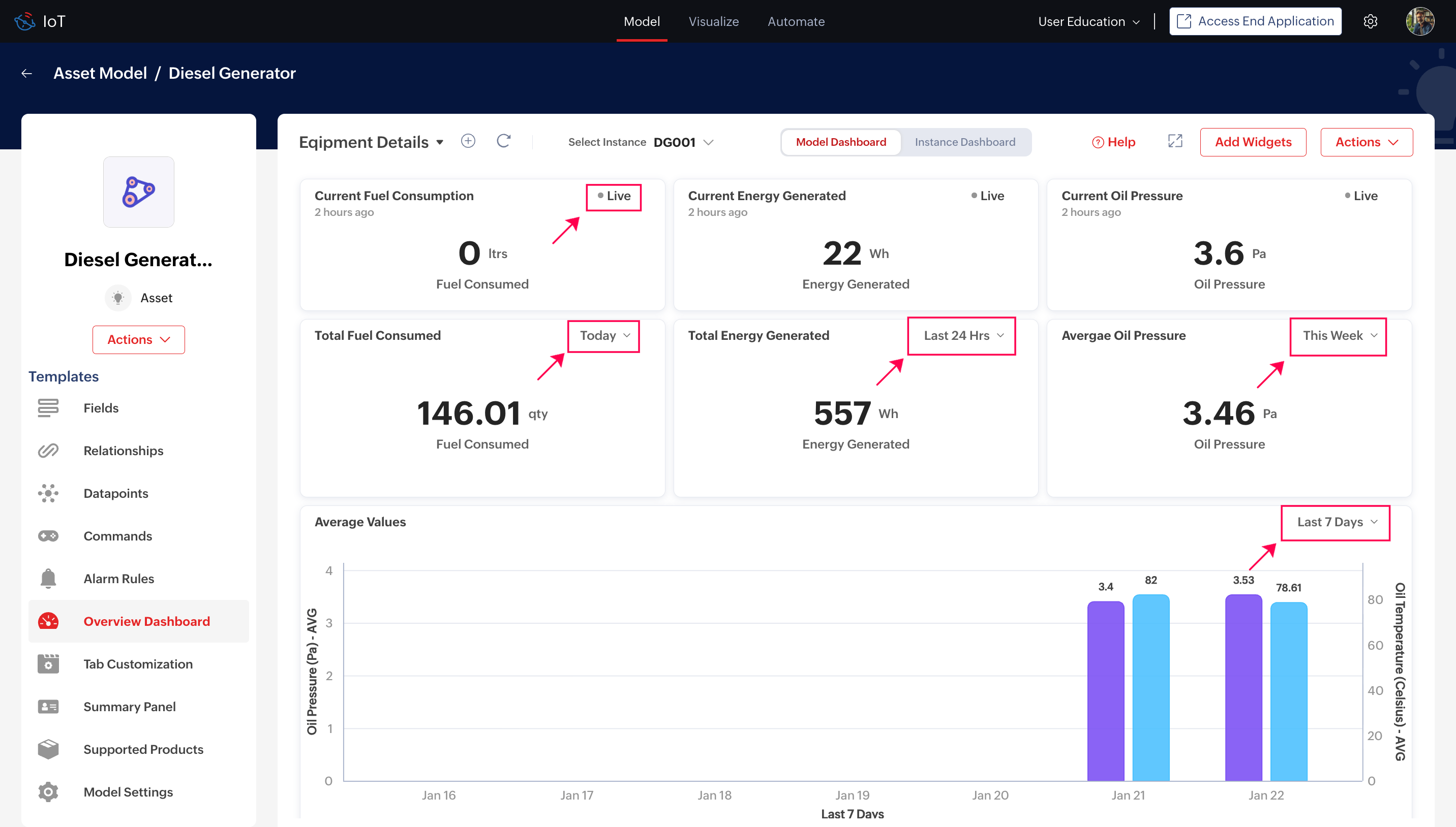 An instance dashboard is available only for a particular device, asset, or location instance and is not added to the model. For example, if a model named Diesel Generator has two instances, DG001 and DG002, the overview dashboard template provides the same set of widgets for each instance, displaying their specific values. In contrast, an instance dashboard for DG001 can include widgets, patterns, and layouts that are unique only to it.