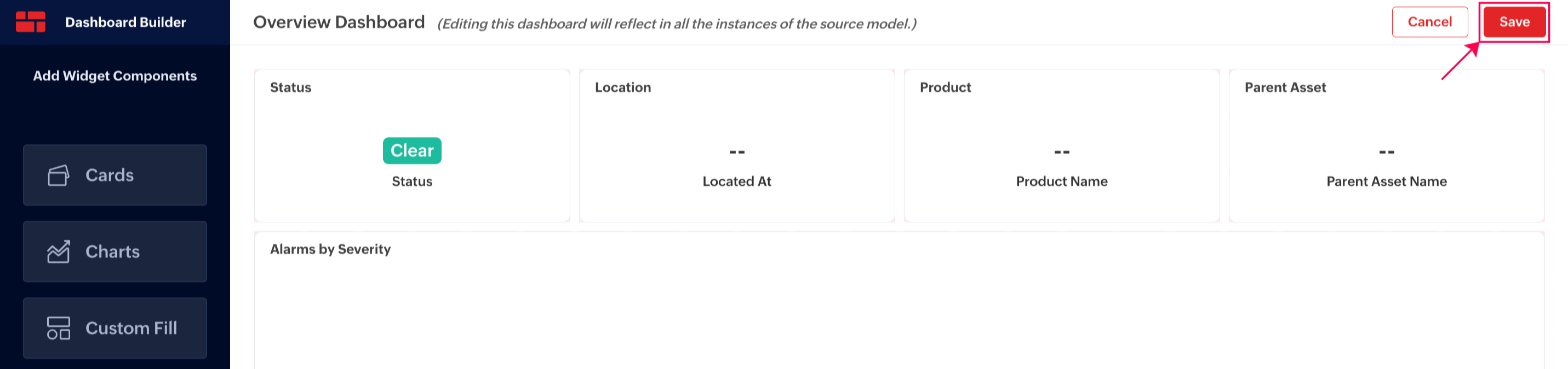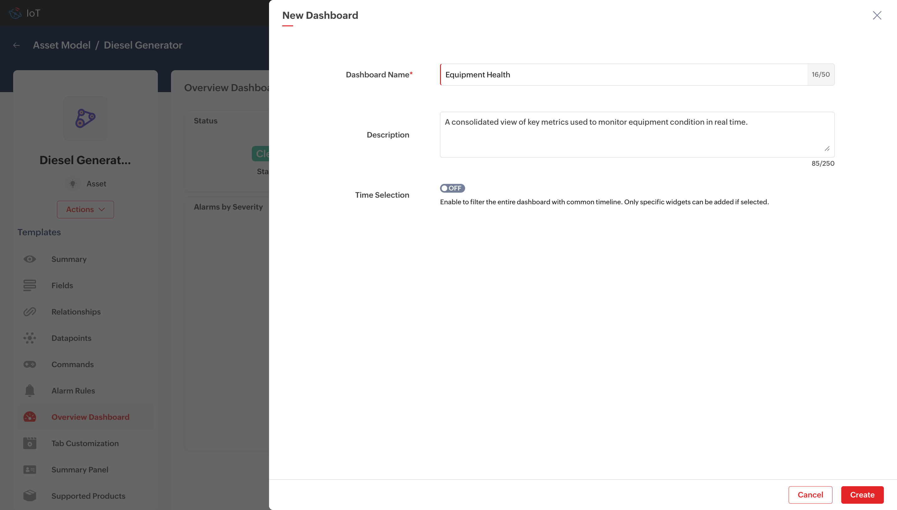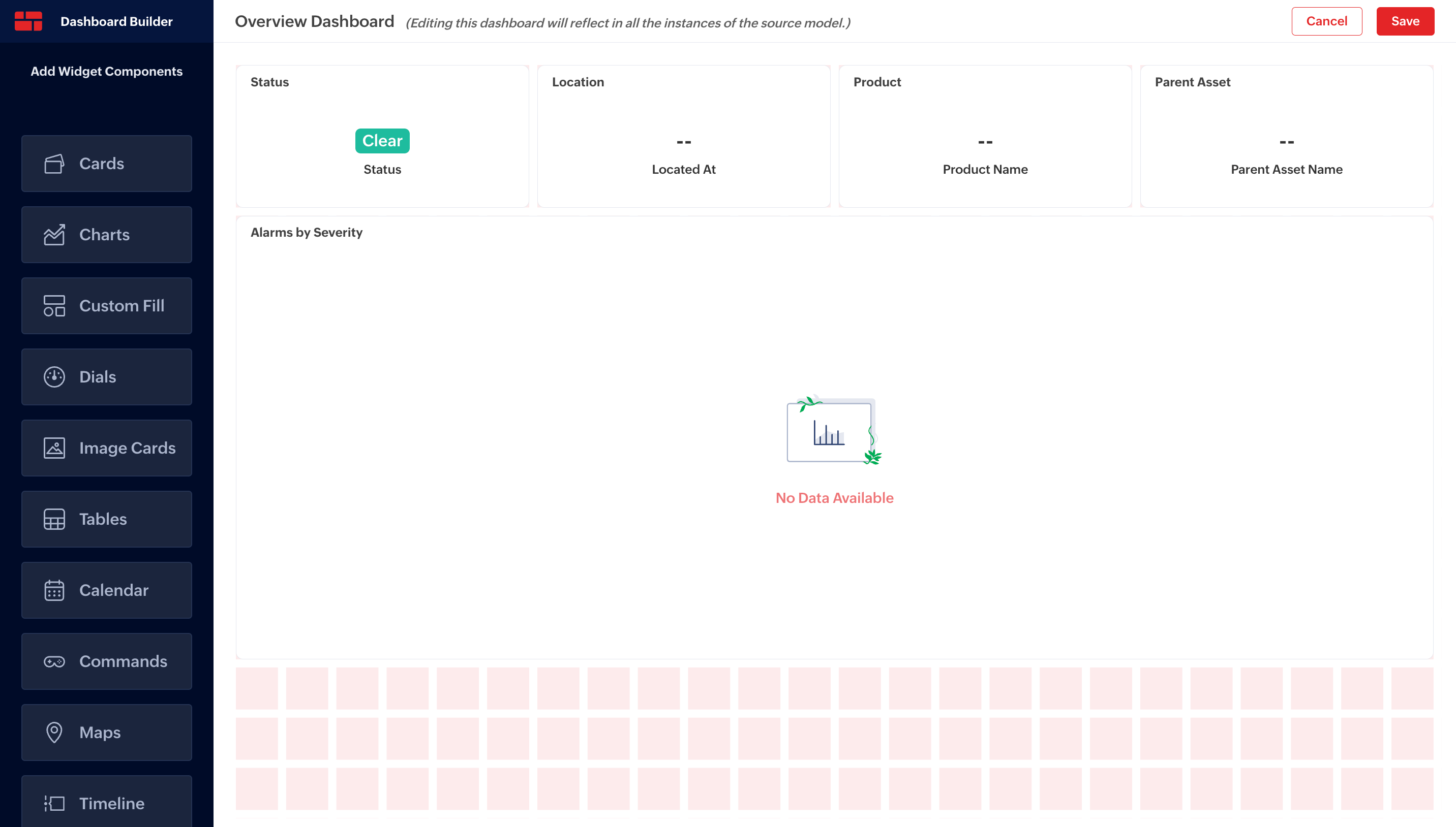 You can add an overview dashboard as a template at the model level. When configured as a template, the overview dashboard is automatically available for all device, asset, or location instances created based on that model.