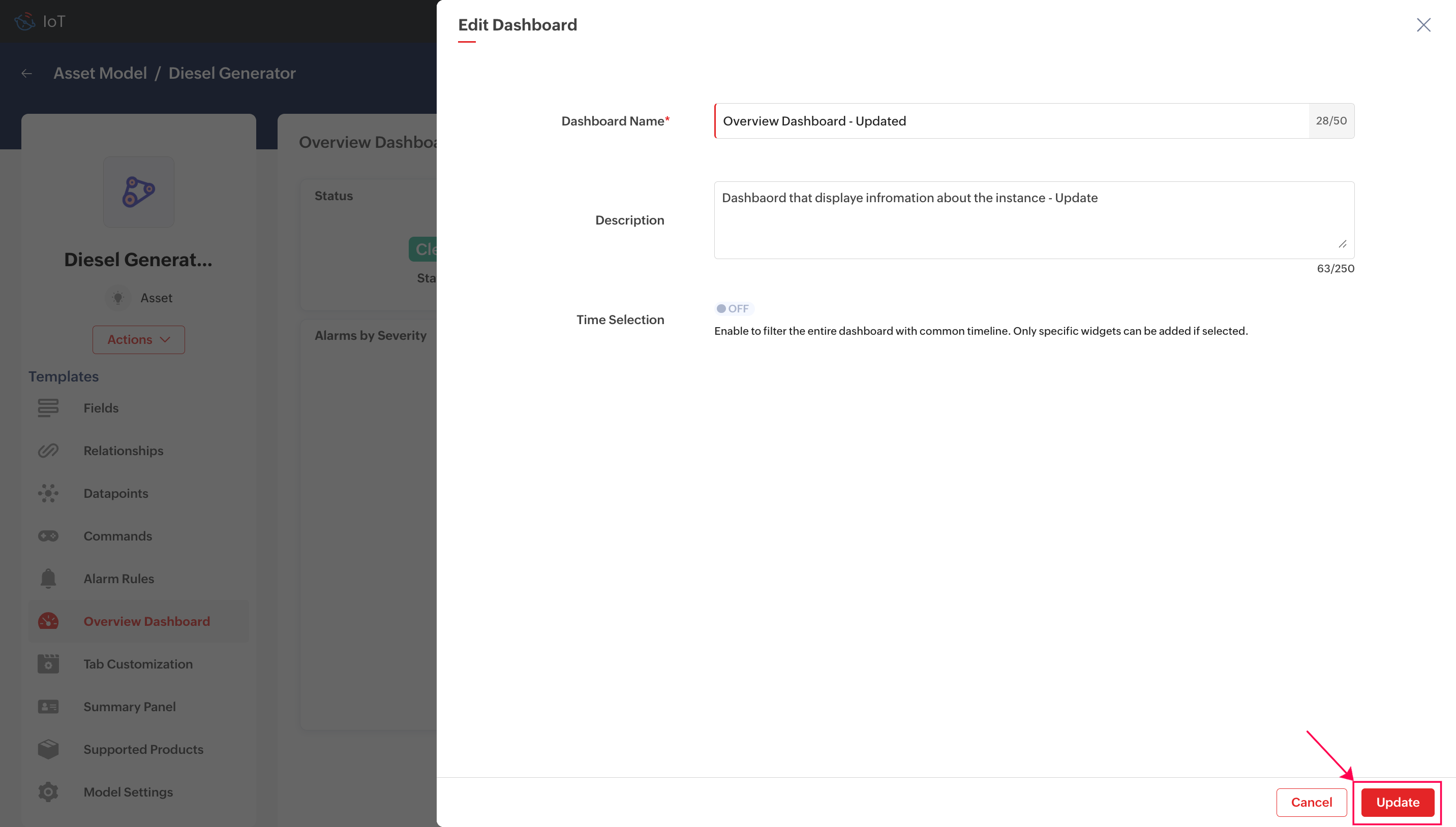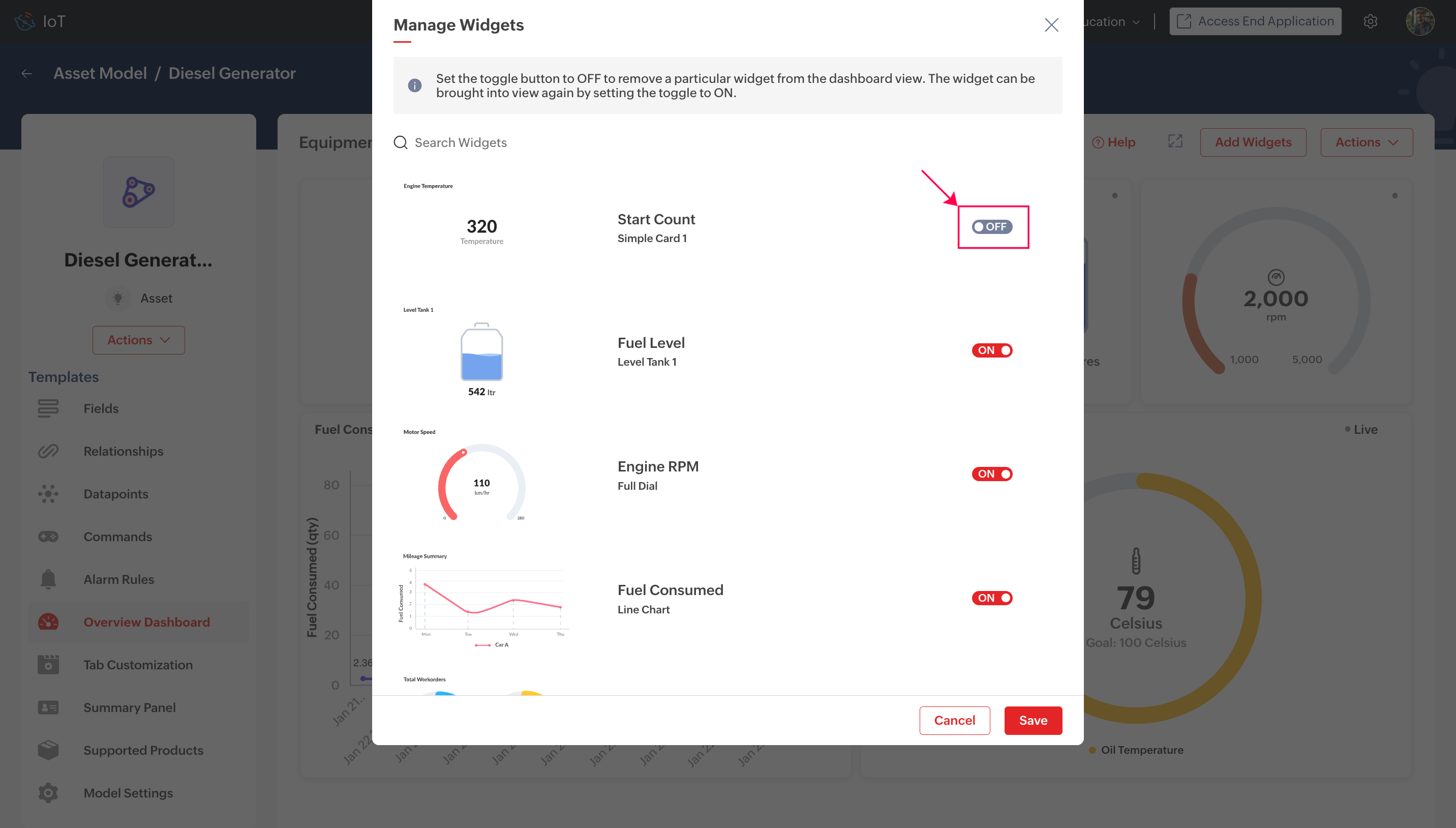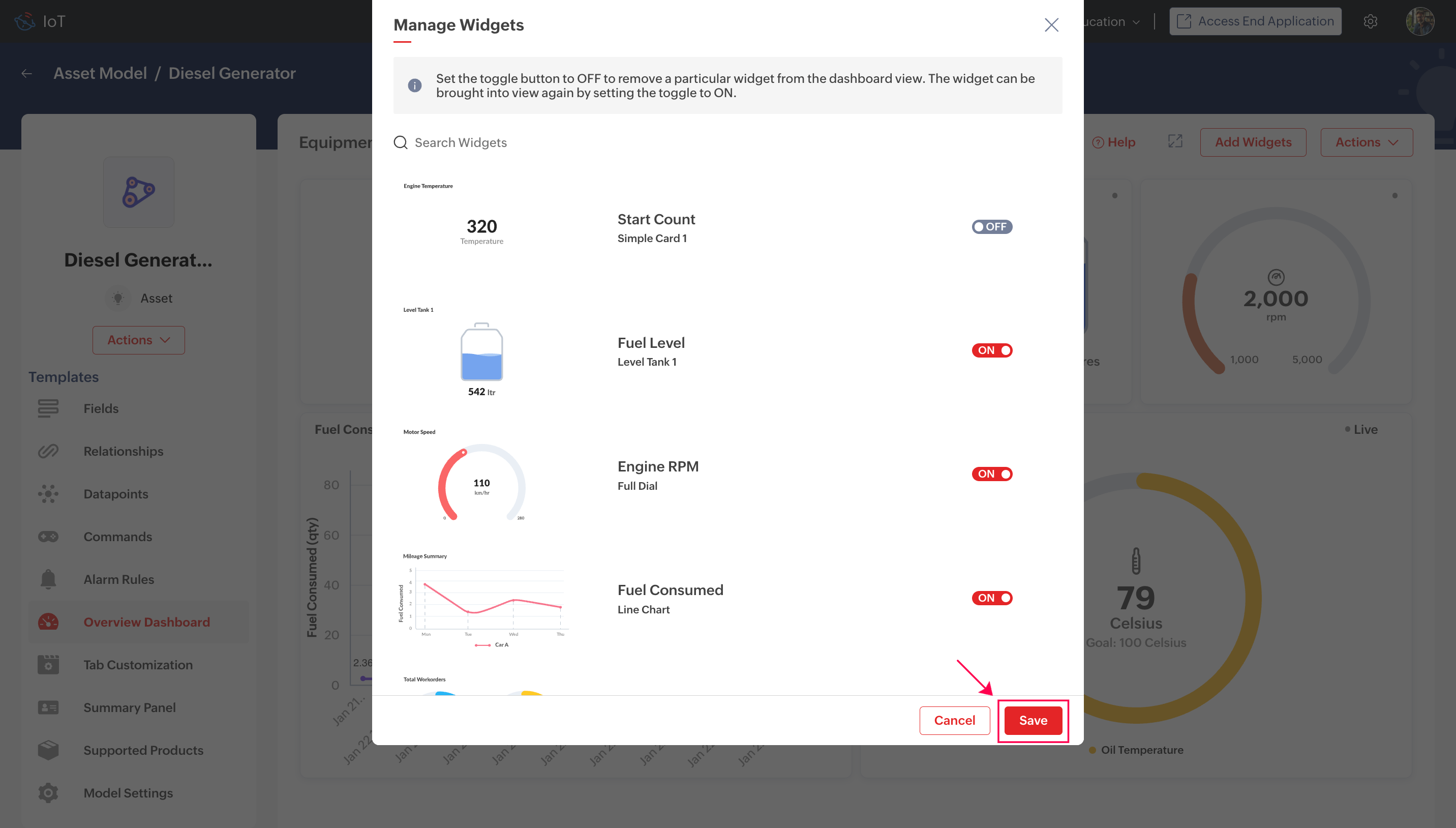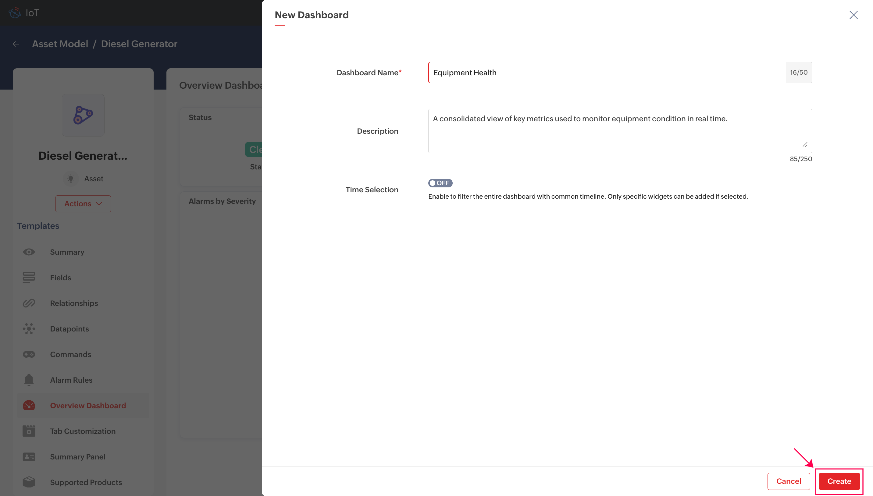 Click the model for which you want to access the overview dashboard template. For this example, Diesel Generator model is selected.