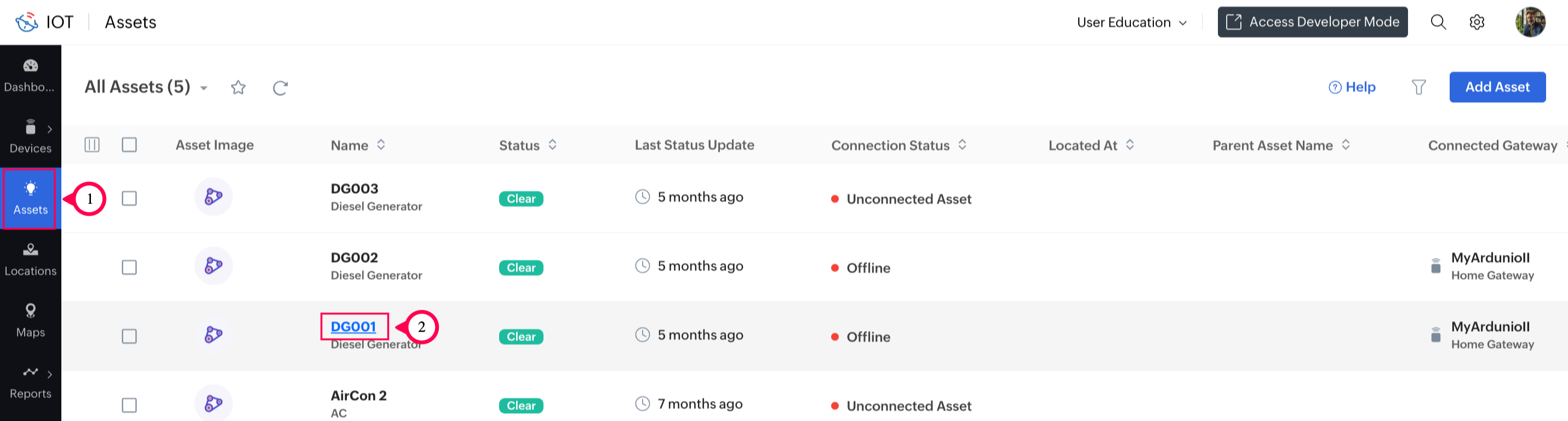 Navigate to the required asset, device, or location instance. For this example, select Assets > DG001.