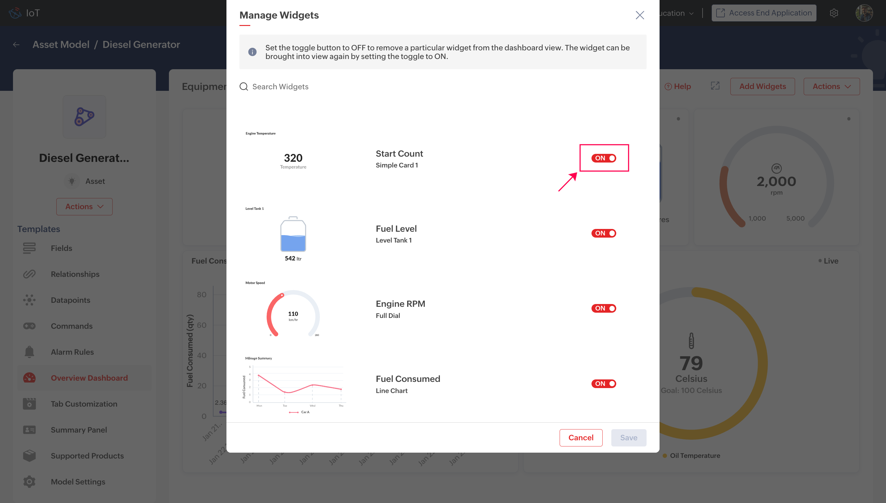 Turn ON or OFF the required widgets.ON: The widget is displayed in the overview dashboard template.