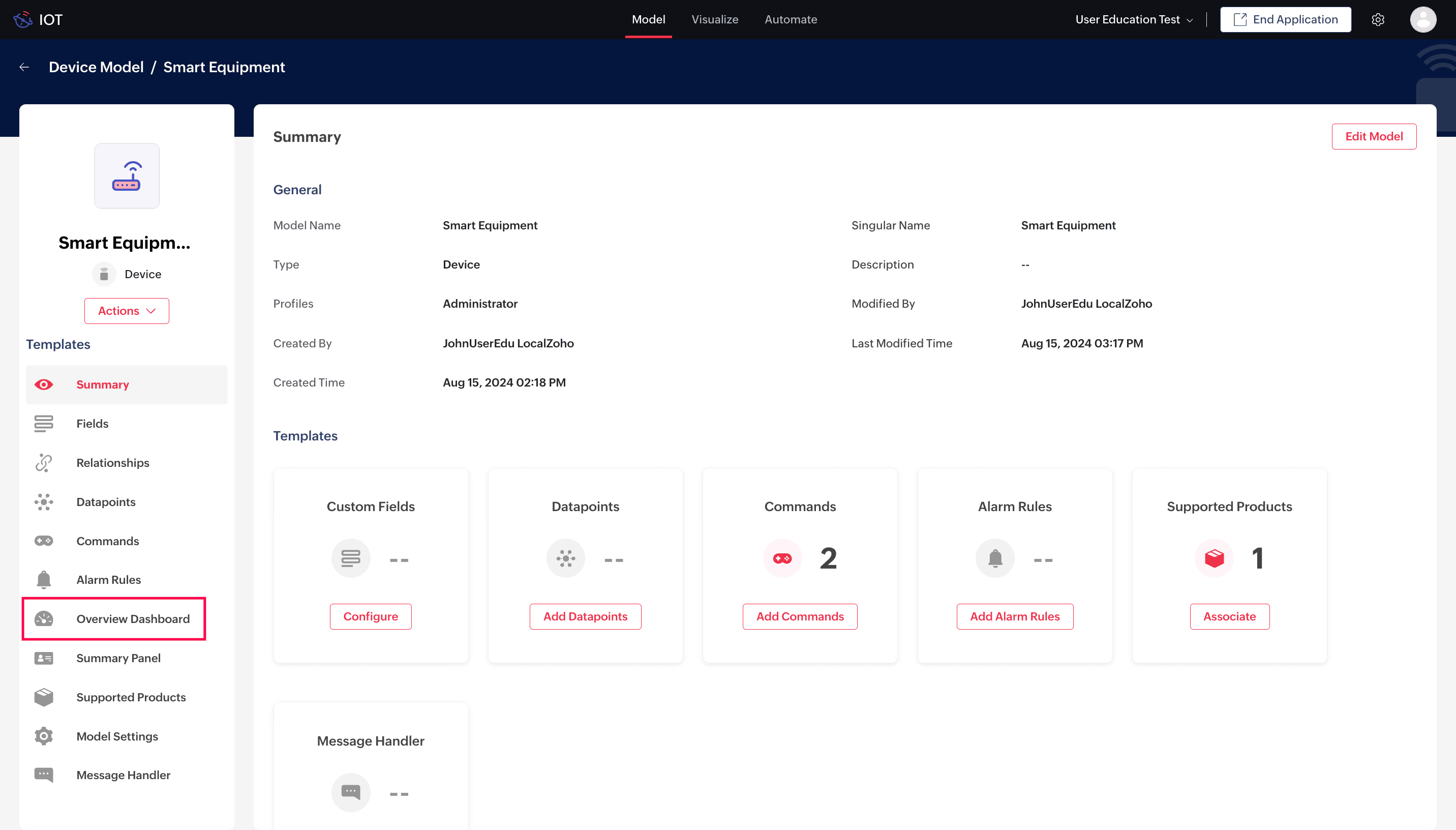 4. Select Overview Dashboard in the left pane. This will display the default overview dashboard of the model.