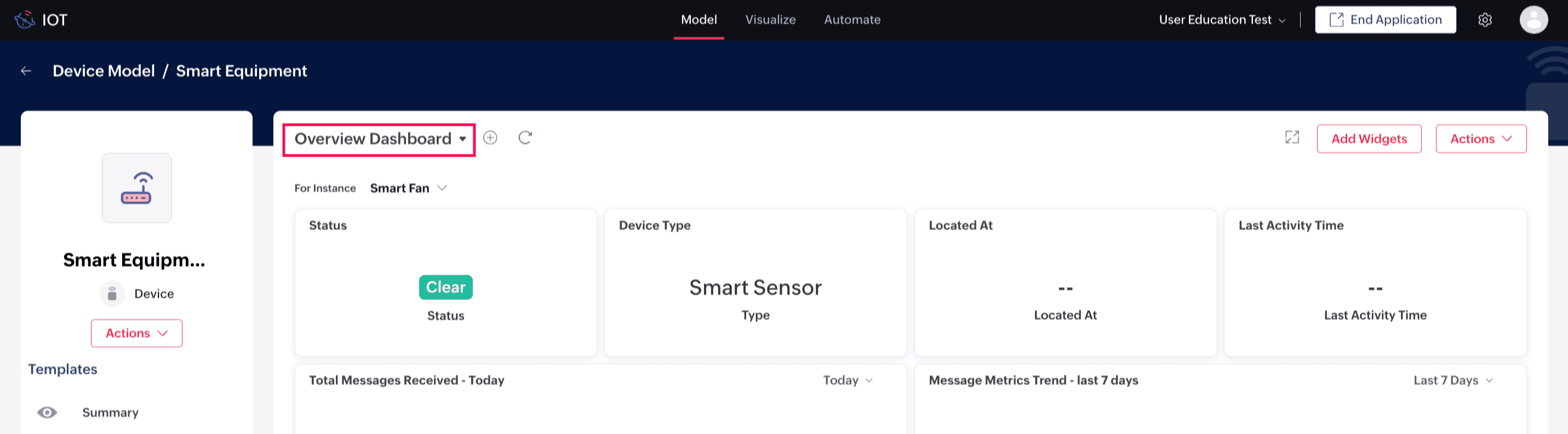 Users can disable widgets configured in an overview dashboard template in a device model. To edit an overview dashboard template details, Access the Developer Application. Select Asset or Devices or Location in the left pane based on the model in ...