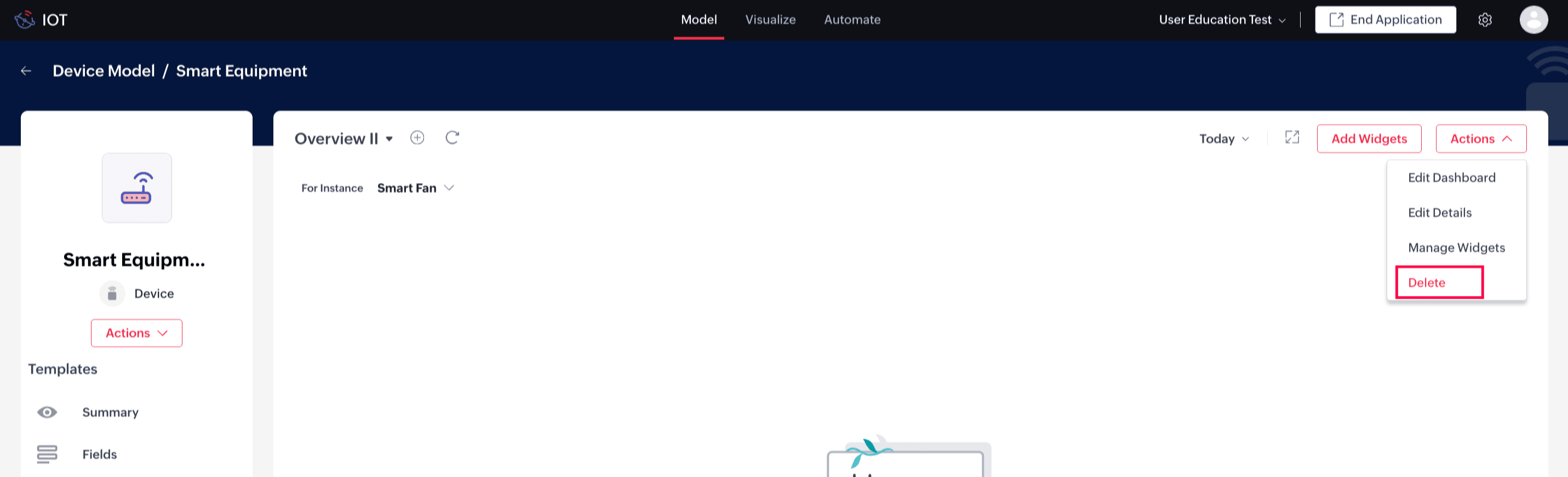 3. Click the name of the model with the overview dashboard template you want to delete. For this illustration, the device model Smart Equipment is considered.