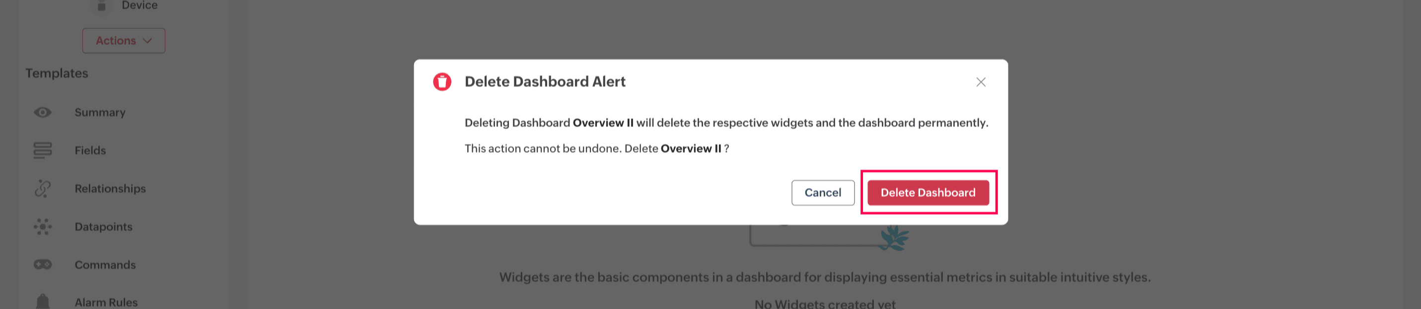 By default, all models(Device, Asset, and Location) come with configured with an overview dashboard template. Users have the flexibility to add two additional overview dashboard templates to any model. All overview dashboard operations require ...