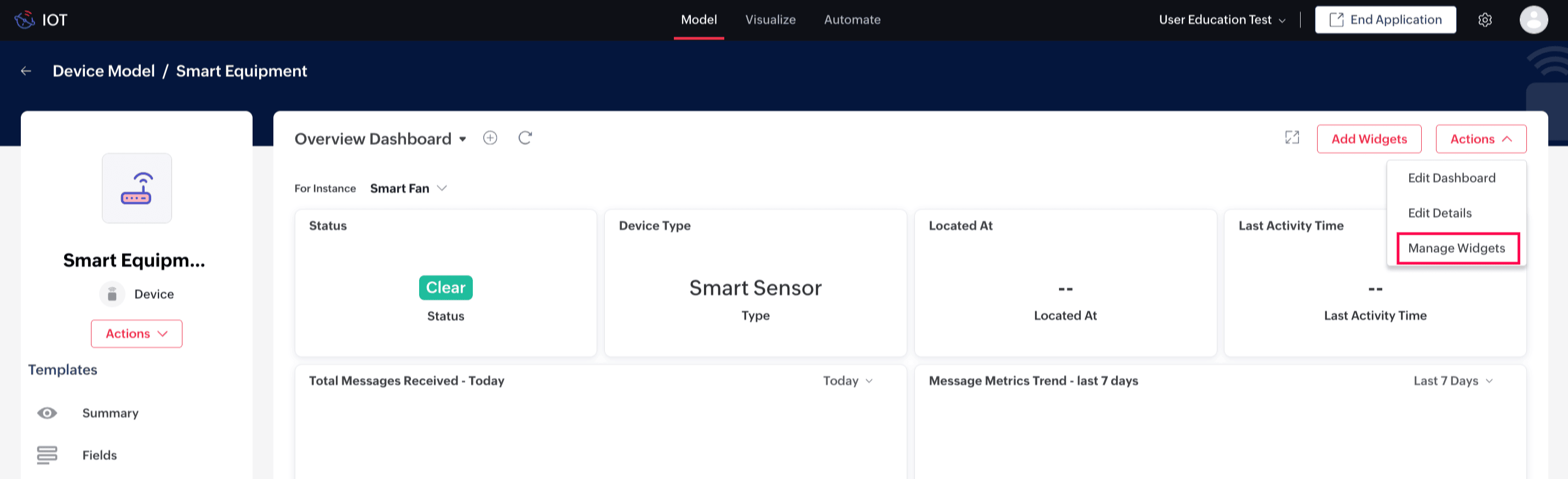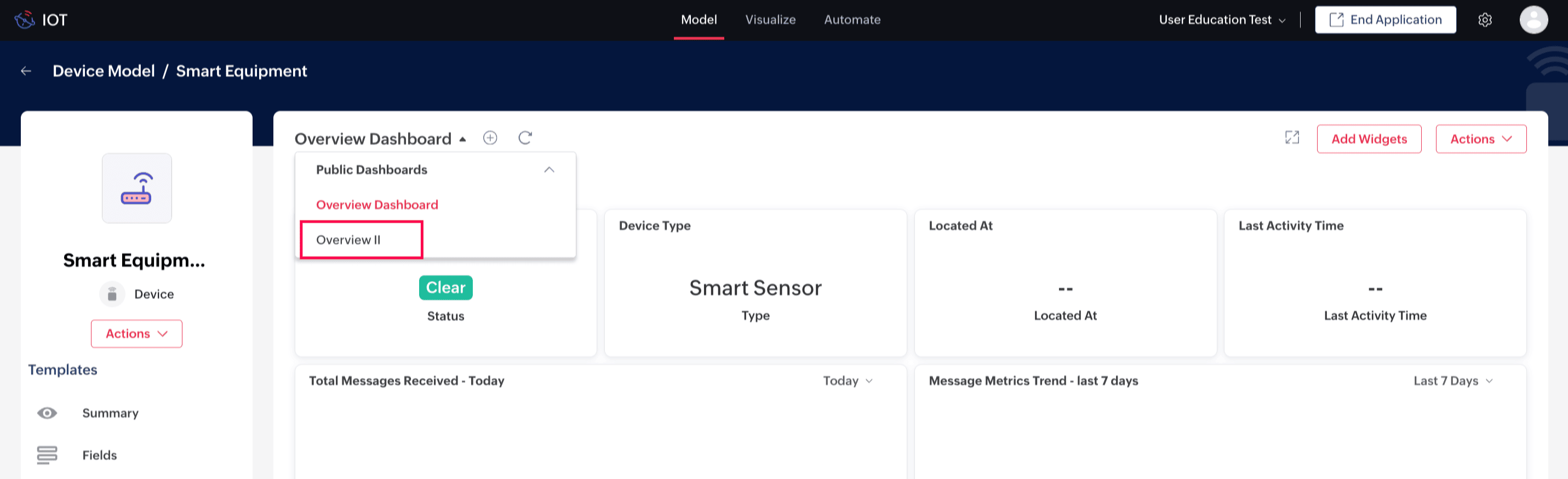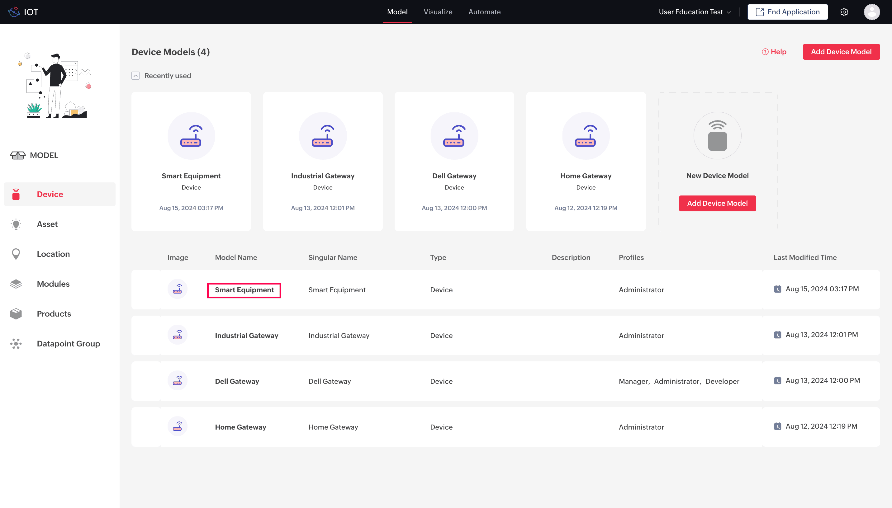 3. Click the name of the model in which you want to manage the overview dashboard template. For this illustration, the device model Smart Equipment is considered.