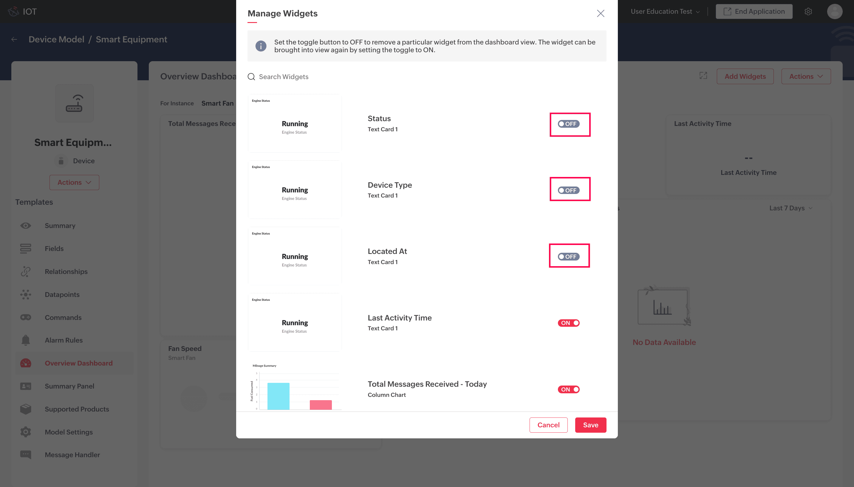 Users can disable widgets configured in an overview dashboard template in a device model.