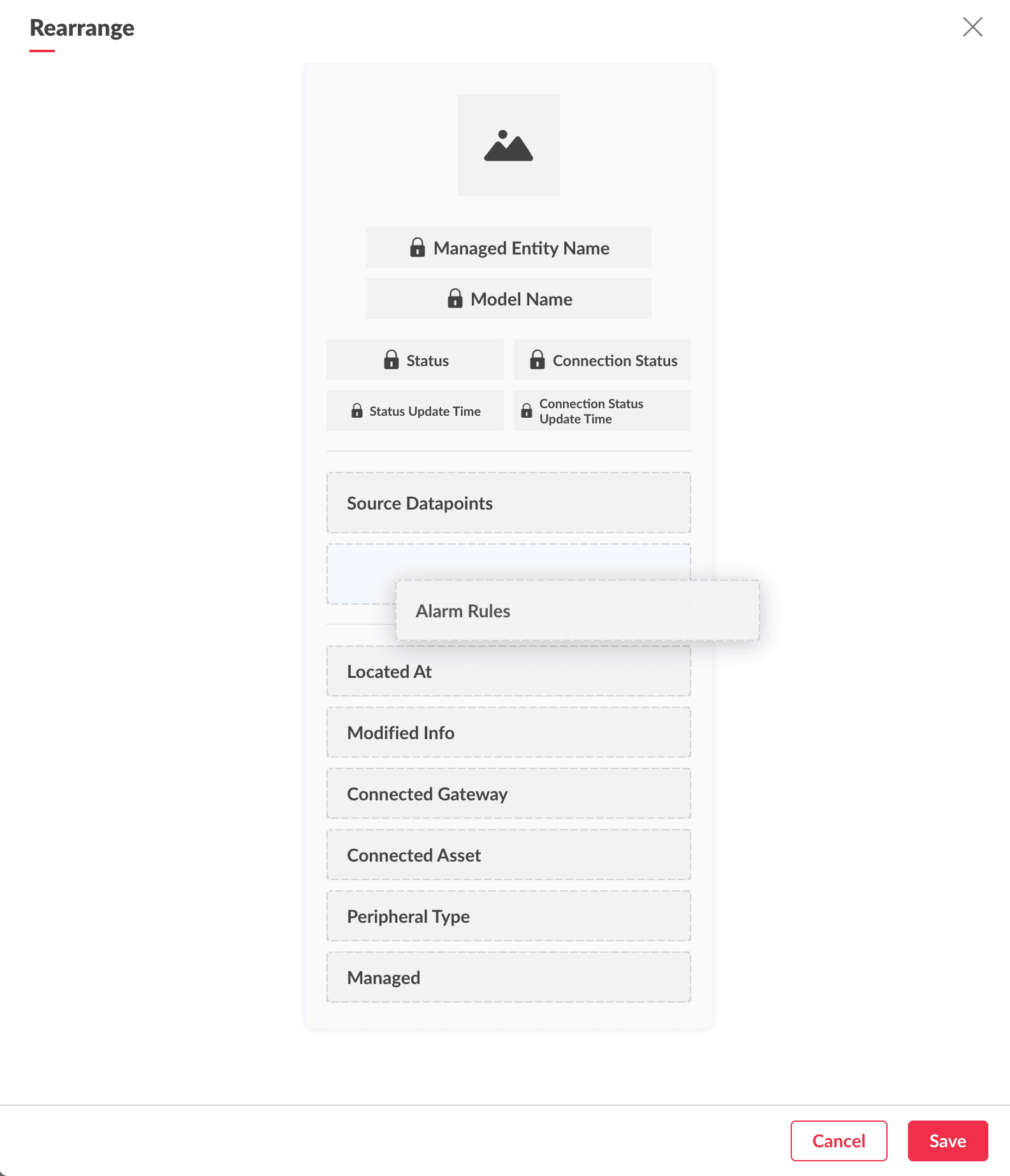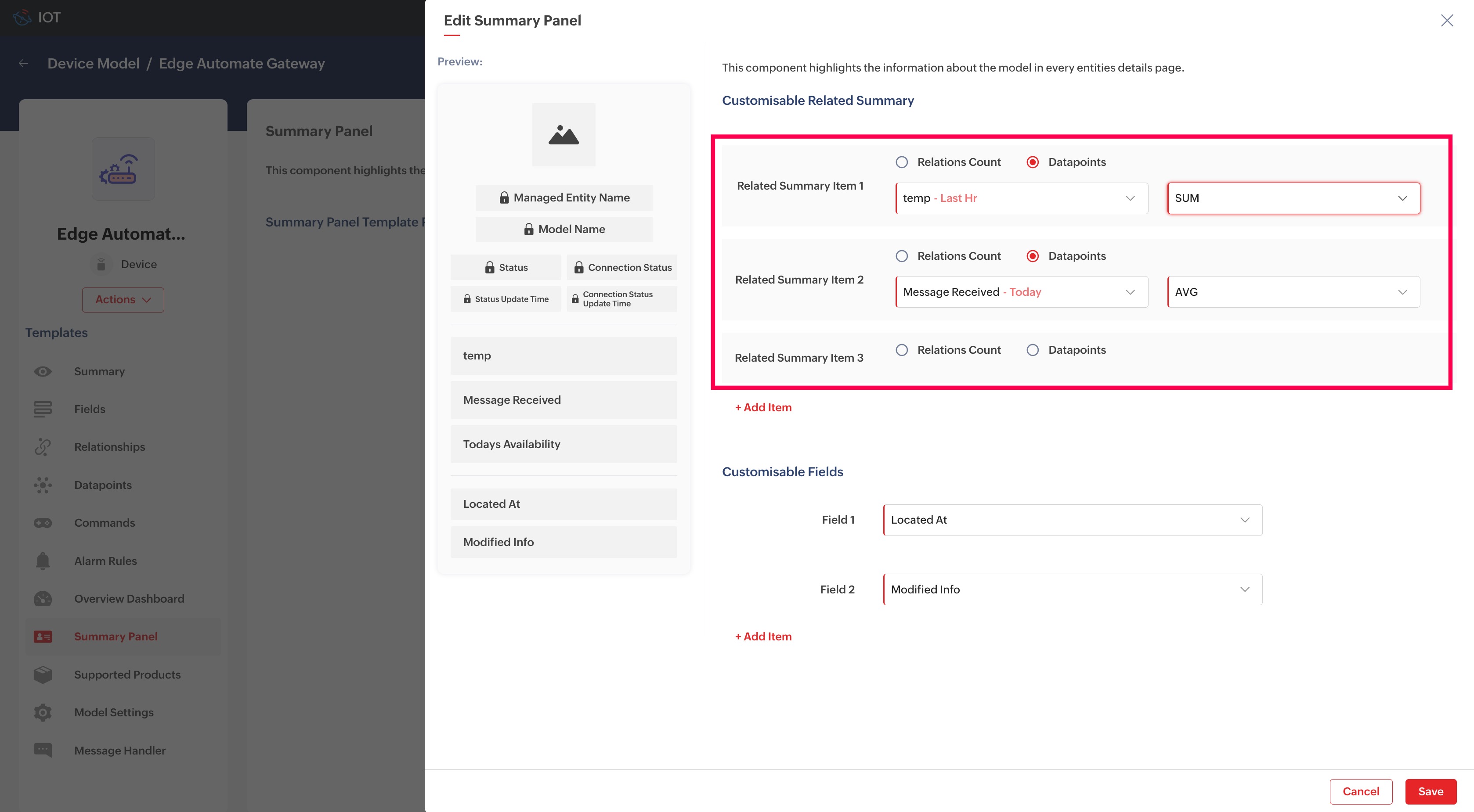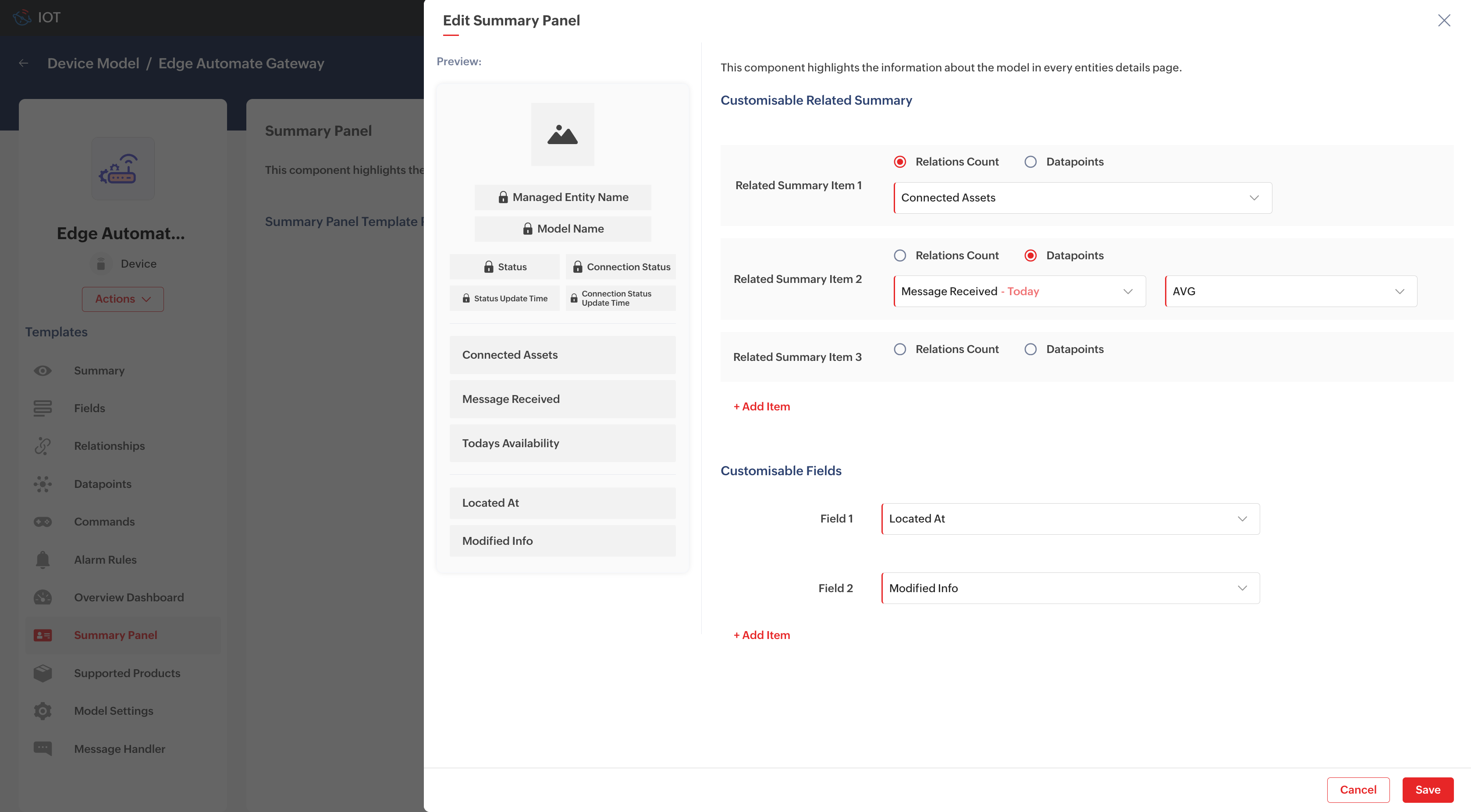 Summary panels are applied at model level, such that the summary panel of a device, asset, or location belonging to the same model will be of similar format. For example, in an IIoT setup, if you have a Chiller model and configured a summary panel for this model, all the assets of Chiller type will have the same summary panel format with the values pertaining to that particular asset(Chiller).