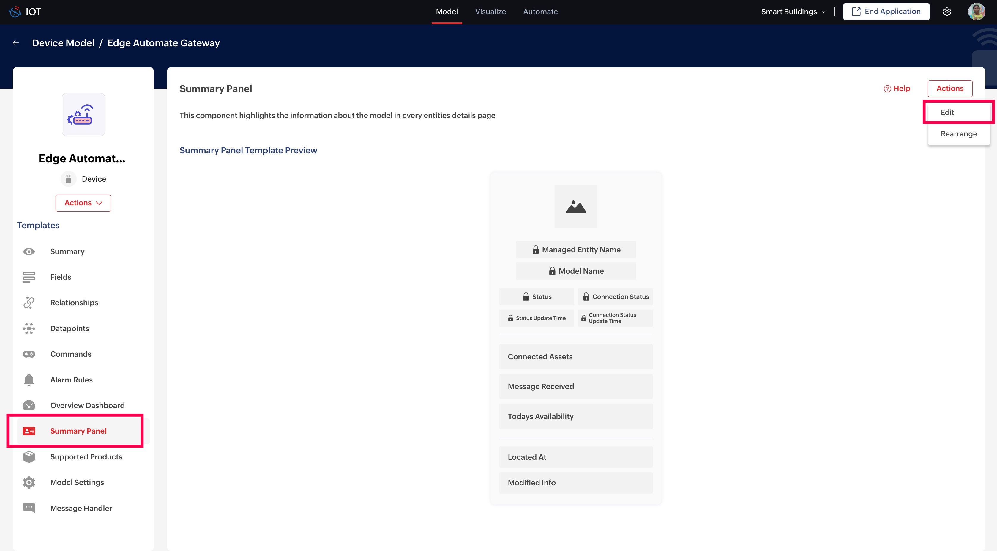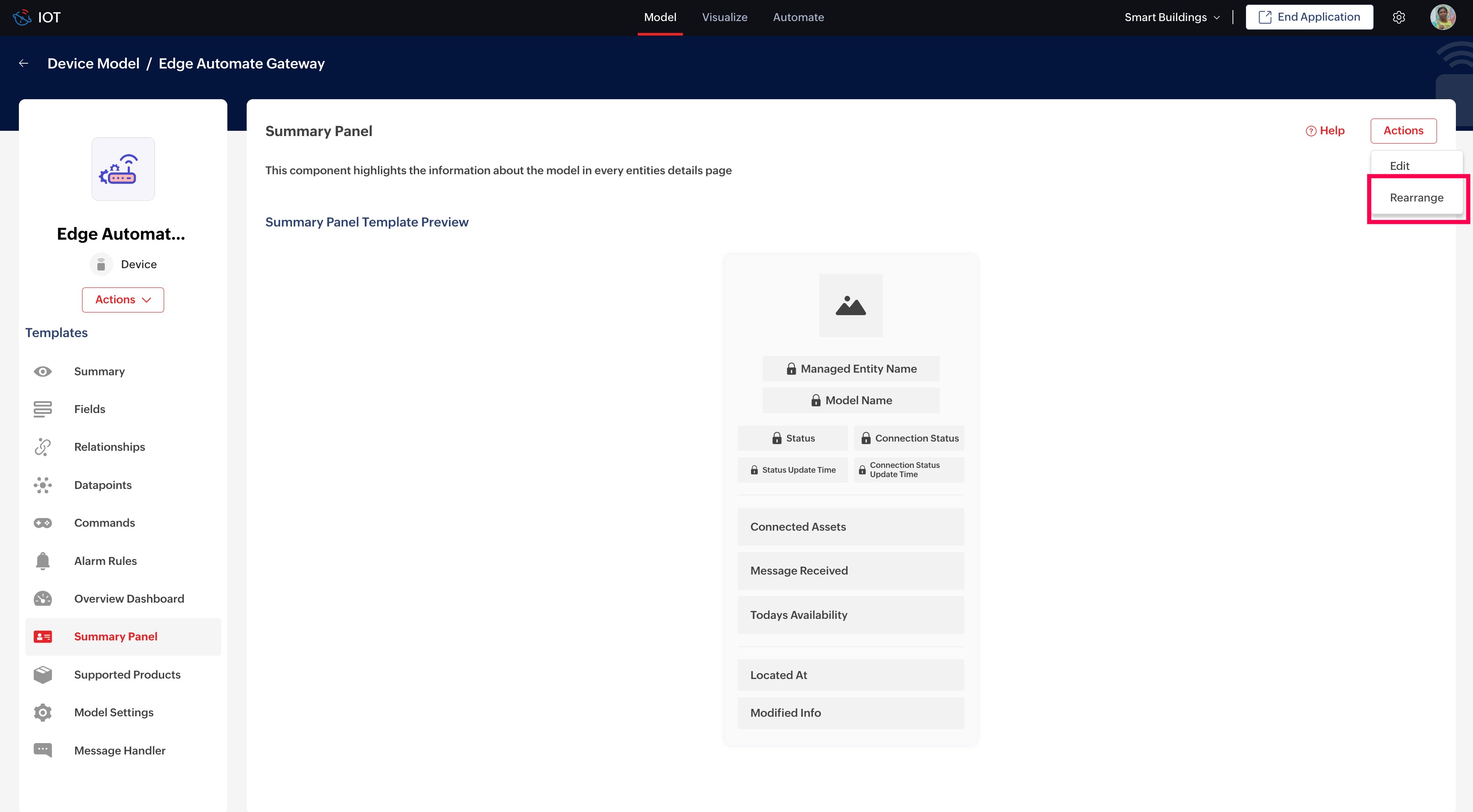 Let us consider the scenario in an Energy Monitoring setup where you want to create a summary panel template for the Energy Meter model so that all the Energy Meters of this model will display the configured card.